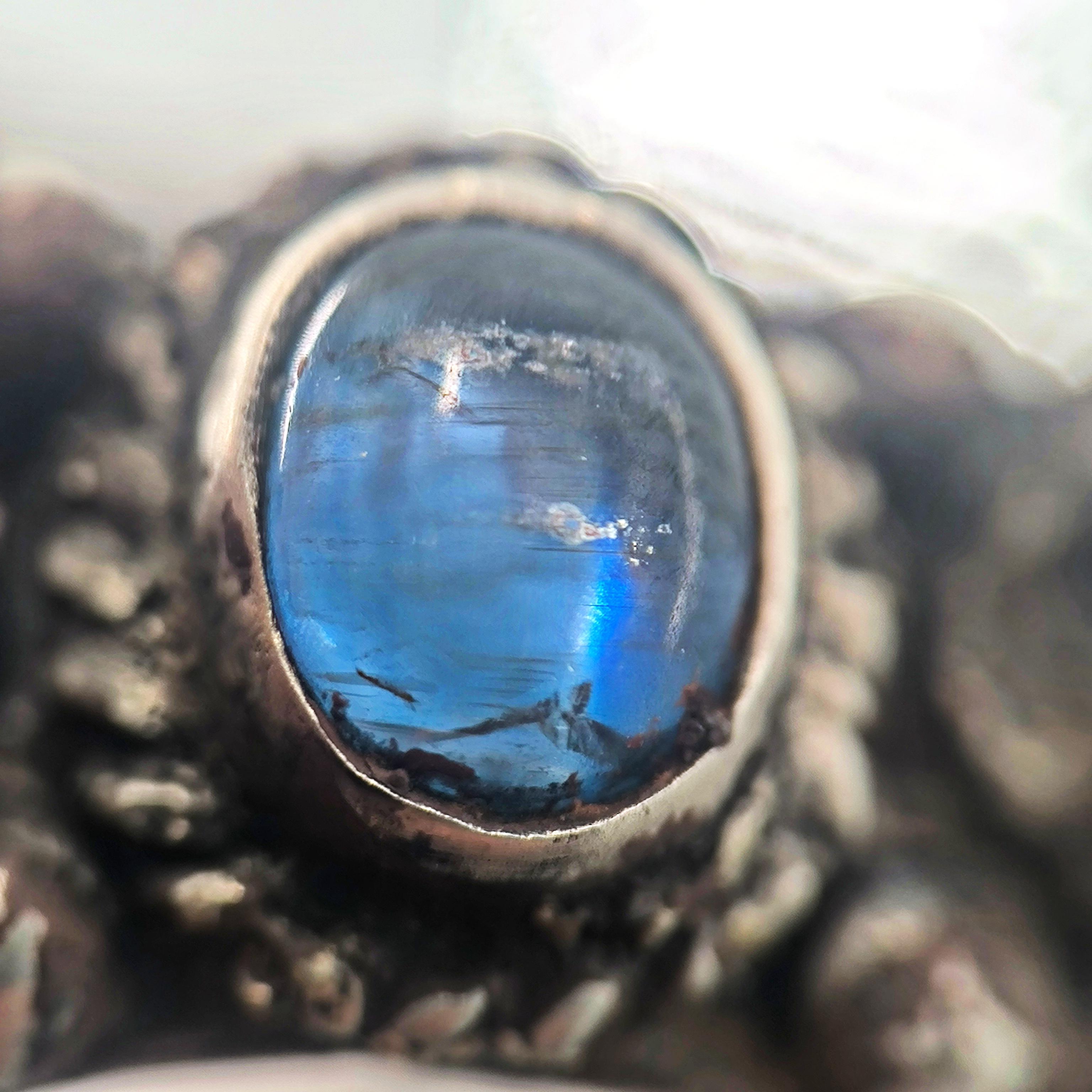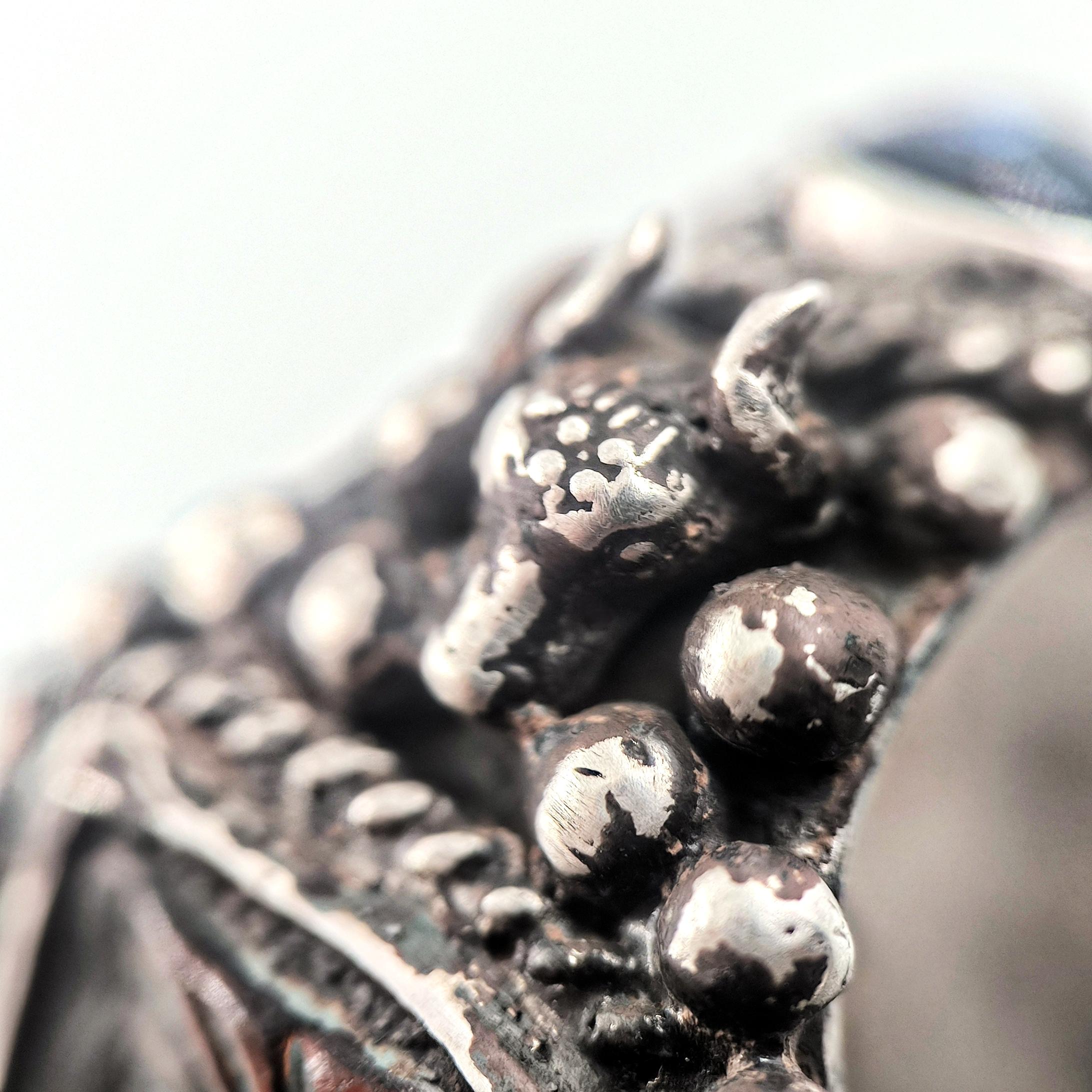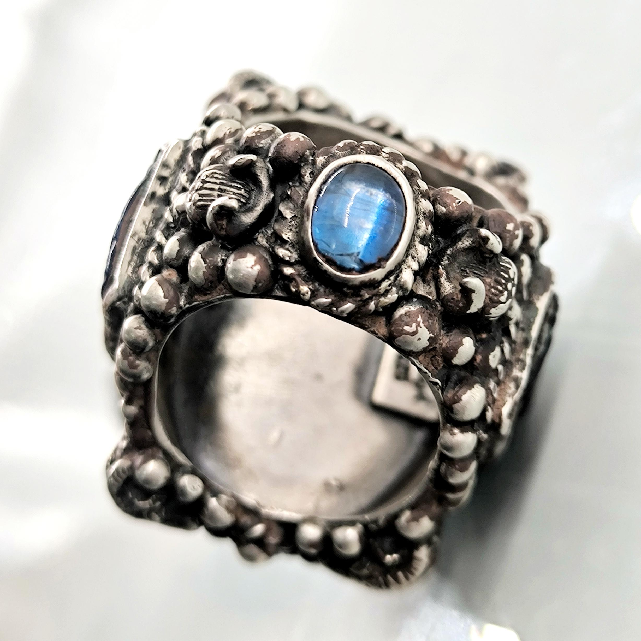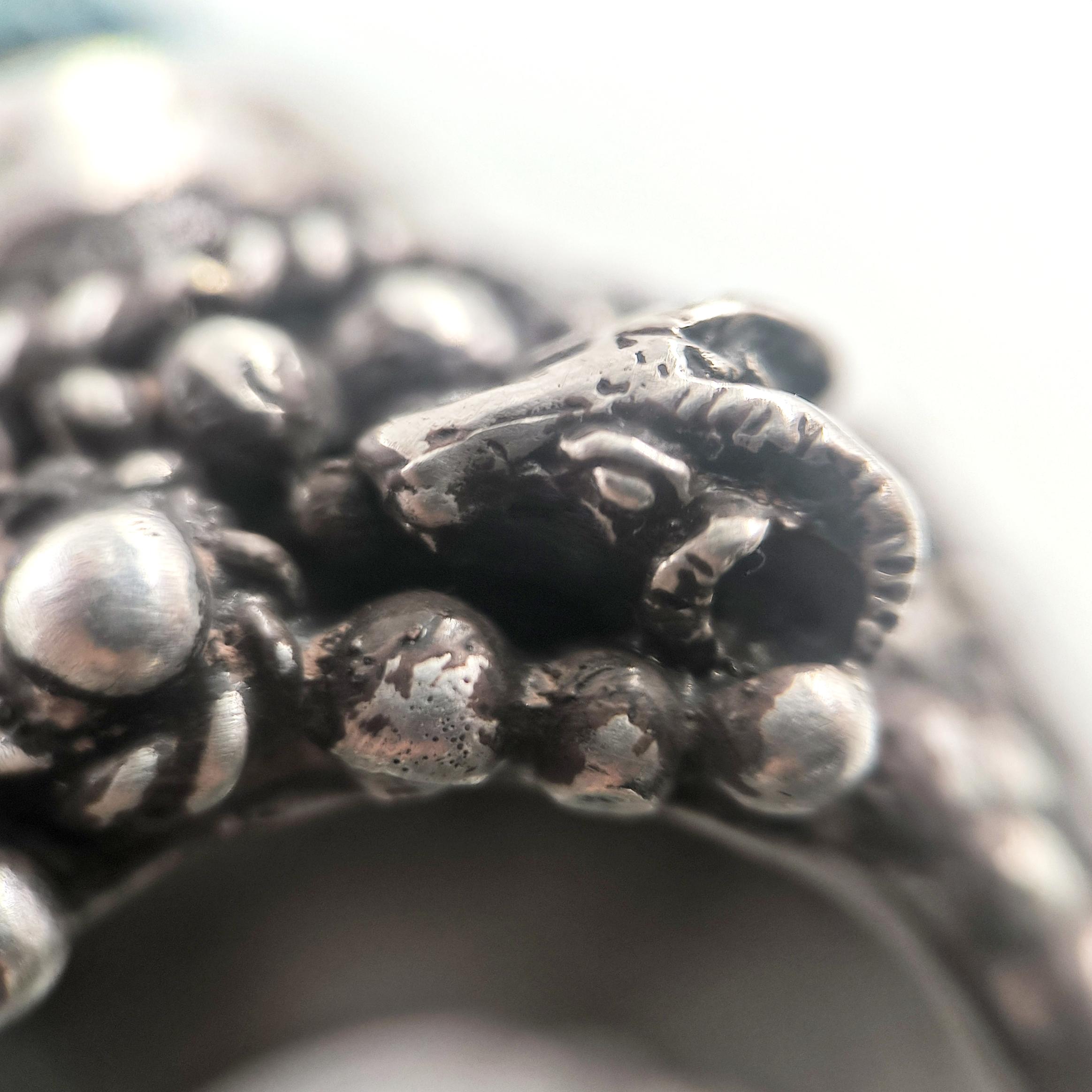 Kadim çağların gücü ve zarafeti bu yüzükte tek bedende buluşuyor; merkezdeki Romalı kadın figürü, örgülü saçları ve vakur duruşuyla bilgeliği, asilliği ve içsel gücü simgelerken yüzüğün tamamına mistik bir aura yayıyor. Yan yüzlerde cam üzerine kabartma olarak işlenen Mars ve Venüs figürleri, savaş ile aşkın kadim dengesini hatırlatıyor; gücün tutkuyla, cesaretin zarafetle bir arada var olabileceğini fısıldıyor. Yüzüğün her noktasına yayılan minik koç ve boğa başları, bereketi, liderliği ve ilksel kuvveti sembolize ederken, yoğun güverse toplarla zenginleştirilen eskitme gümüş yüzey, parçaya anıtsal ve koleksiyonluk bir karakter kazandırıyor. Alt bölümde yer alan küçük kyanit taşı ise bu güçlü kompozisyona sezgisel bir denge ve koruyucu bir enerji ekliyor. Teknik olarak merkez taş doğal firuze olup tamamı 925 ayar gümüşten, tamamen el işçiliğiyle üretilmiş, eskitme çalıştığımız, kallavi boyda ve tekil bir tasarımdır.