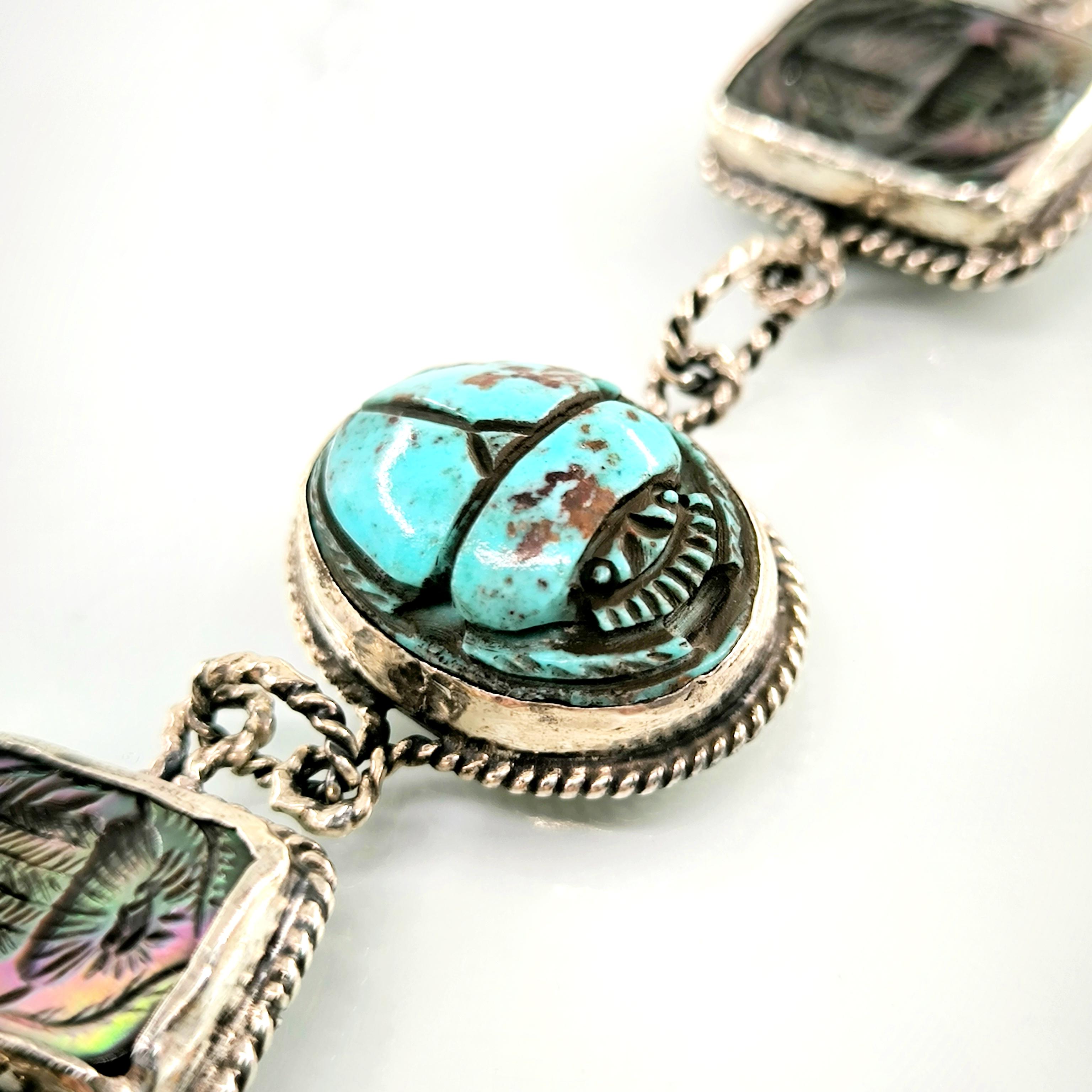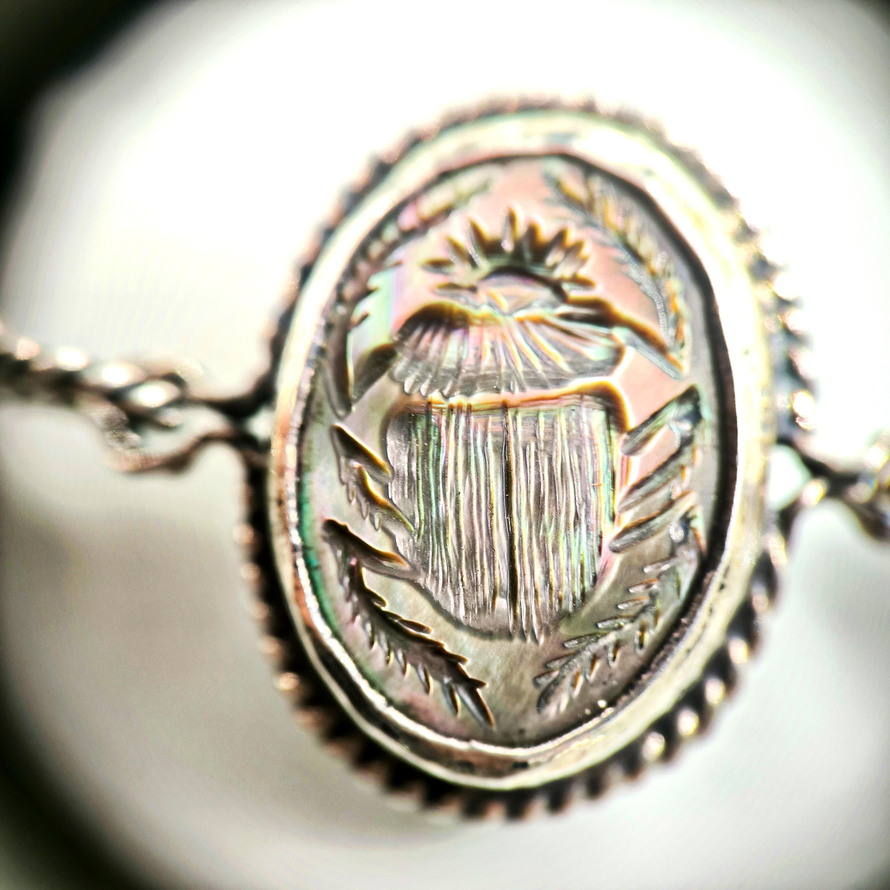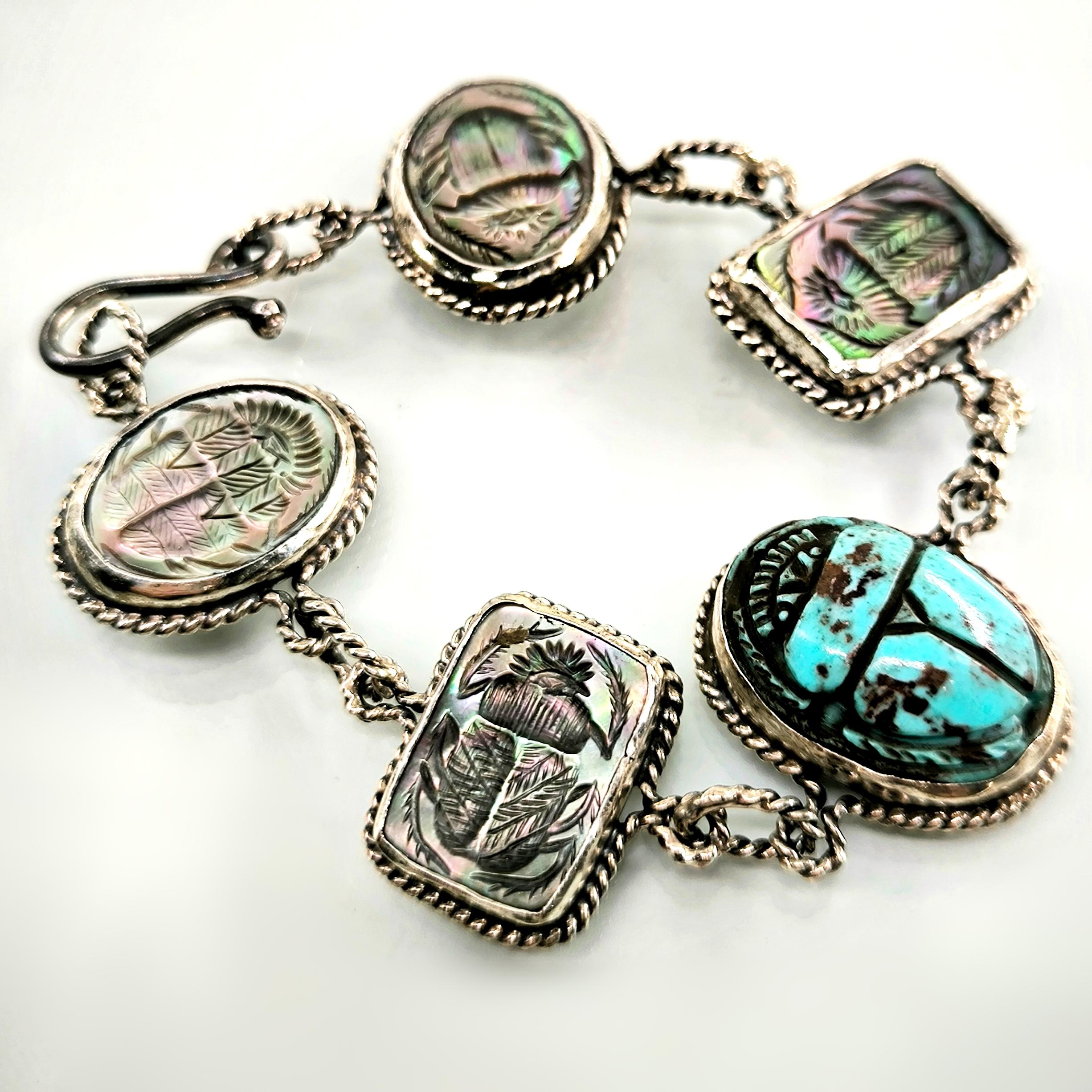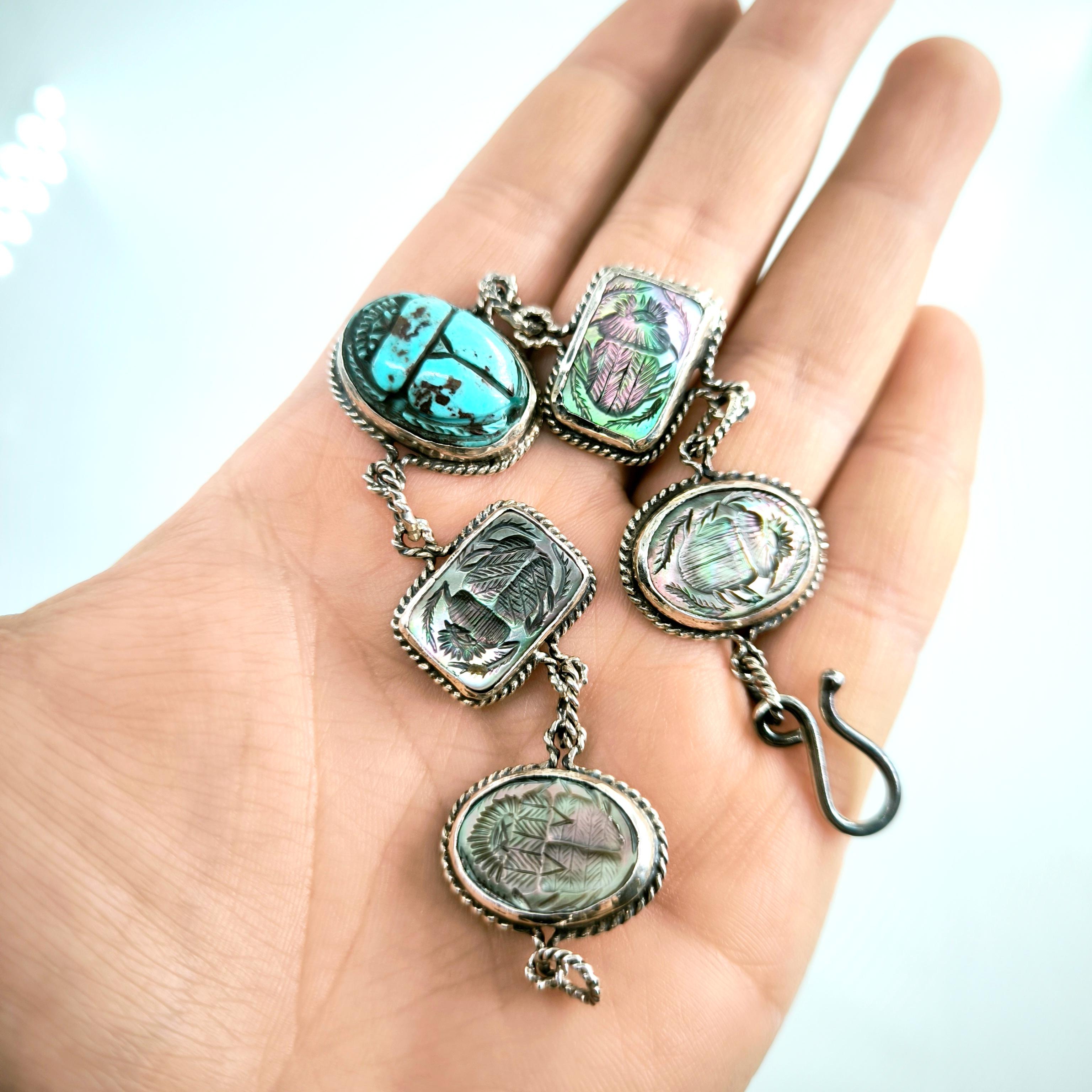 Bu bilekliği tasarlarken Antik Mısır’ın en güçlü sembollerinden biri olan scarab’ı merkezine alan bir kompozisyon yaratmak istedim. Tamamı 925 ayar gümüşten hazırlanan bilekliğin ortasında yer alan doğal firuze, üç boyutlu scarab kabartmasıyla adeta kadim bir mühür gibi yükselir. Etrafını saran okyanus sedefi taşların üzerine işlediğim ince detaylı scarab intaglioları ise ışıkla birlikte büyüleyici bir renk oyununa dönüşür. Sedefin doğal tonları ve firuzenin canlı rengi, antik Mısır estetiğini güçlü bir sanat diliyle bir araya getirir. Bu parça yalnızca bir bileklik değil; mitoloji, sembolizm ve ustalığın birleştiği koleksiyonluk bir mücevherdir. Bileğinizde taşıyacağınız küçük ama etkileyici bir tarih parçası.
