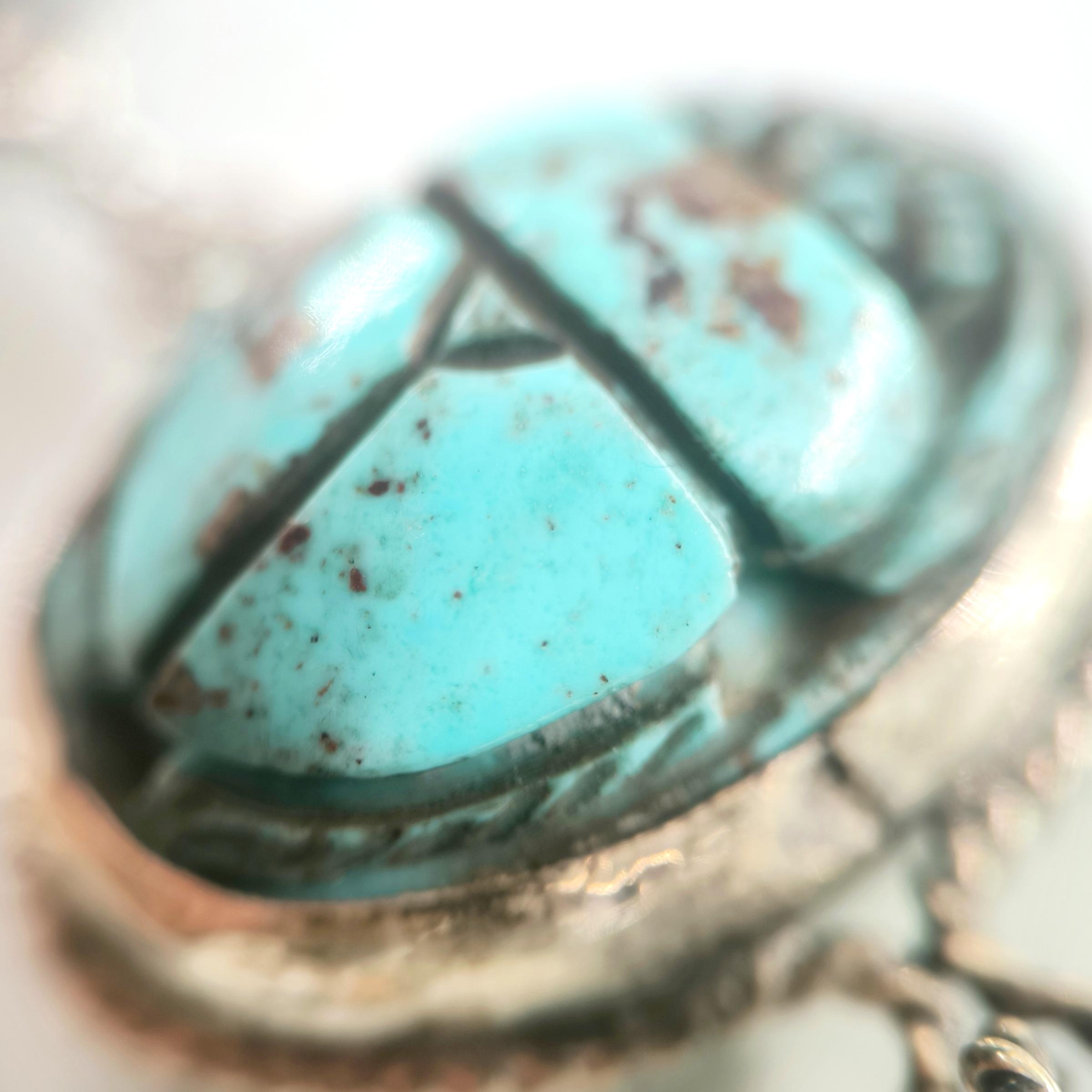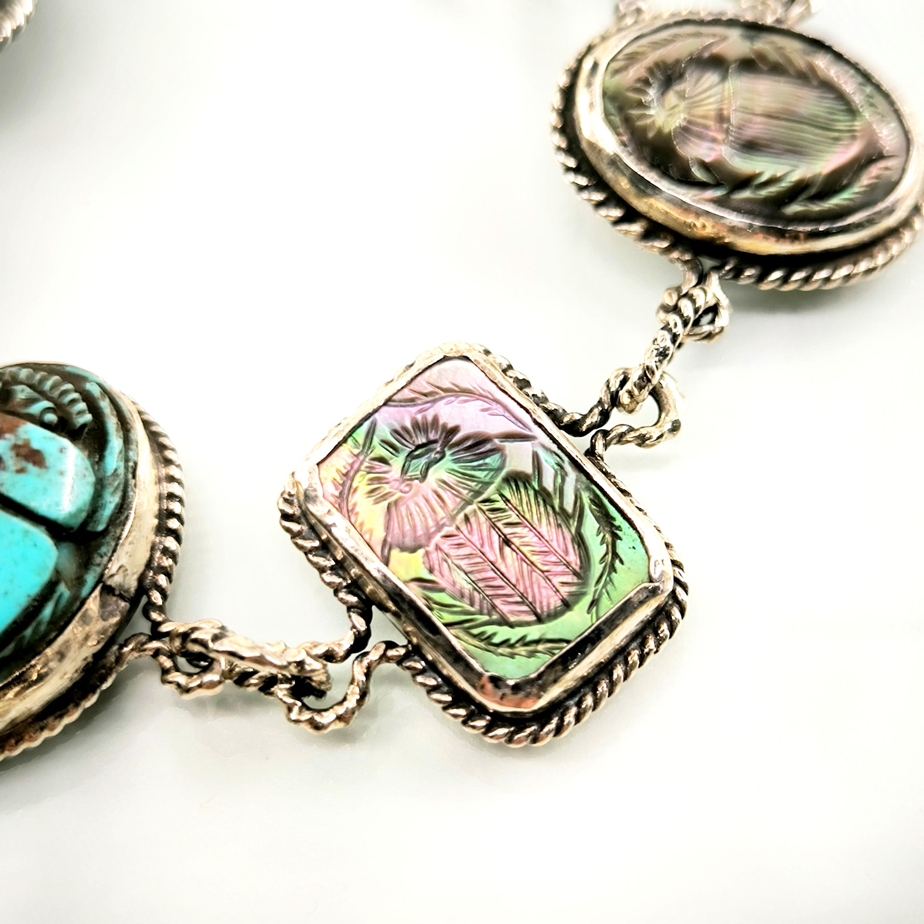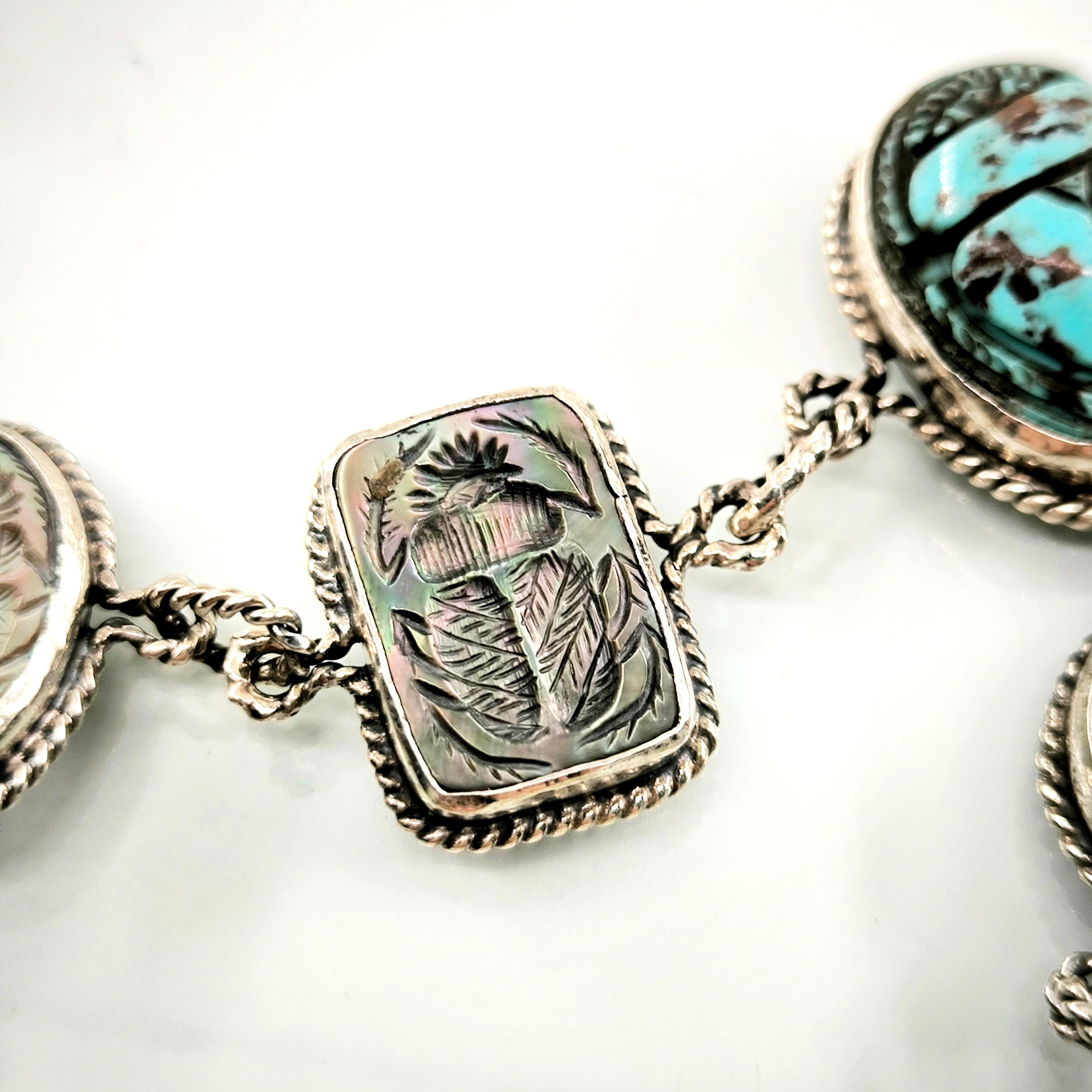 Bu bilekliği tasarlarken Antik Mısır’ın en güçlü sembollerinden biri olan scarab’ı merkezine alan bir kompozisyon yaratmak istedim. Tamamı 925 ayar gümüşten hazırlanan bilekliğin ortasında yer alan doğal firuze, üç boyutlu scarab kabartmasıyla adeta kadim bir mühür gibi yükselir. Etrafını saran okyanus sedefi taşların üzerine işlediğim ince detaylı scarab intaglioları ise ışıkla birlikte büyüleyici bir renk oyununa dönüşür. Sedefin doğal tonları ve firuzenin canlı rengi, antik Mısır estetiğini güçlü bir sanat diliyle bir araya getirir. Bu parça yalnızca bir bileklik değil; mitoloji, sembolizm ve ustalığın birleştiği koleksiyonluk bir mücevherdir. Bileğinizde taşıyacağınız küçük ama etkileyici bir tarih parçası.