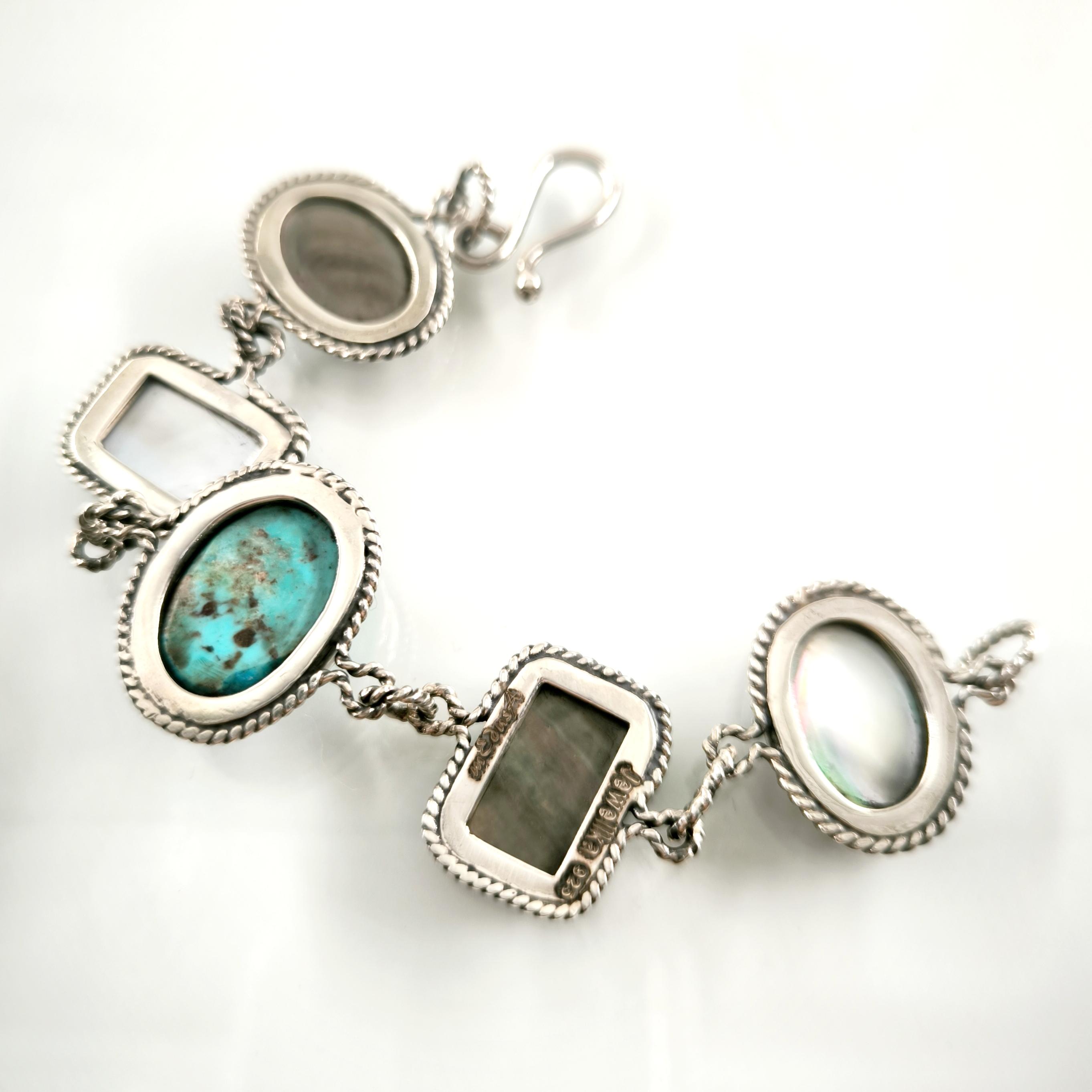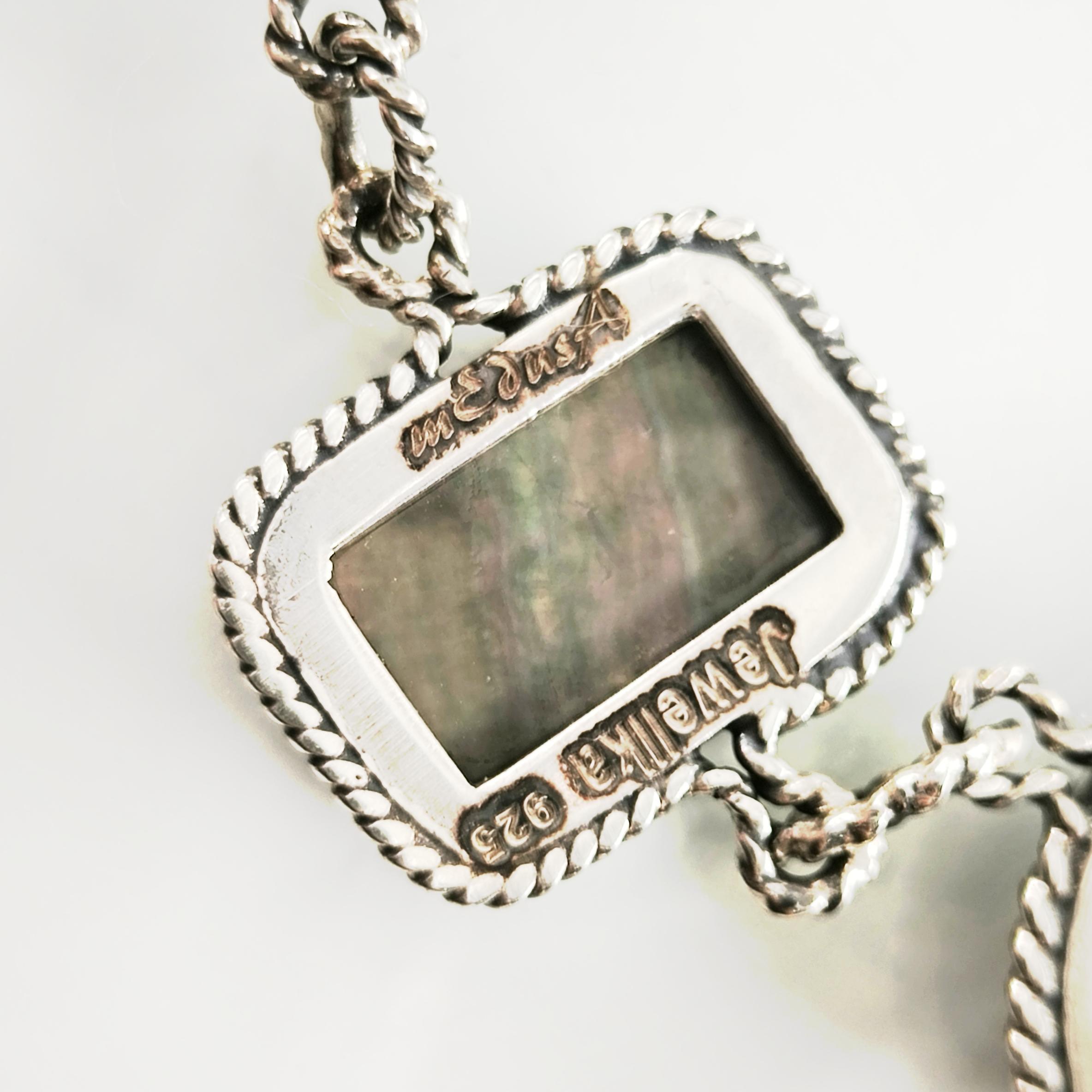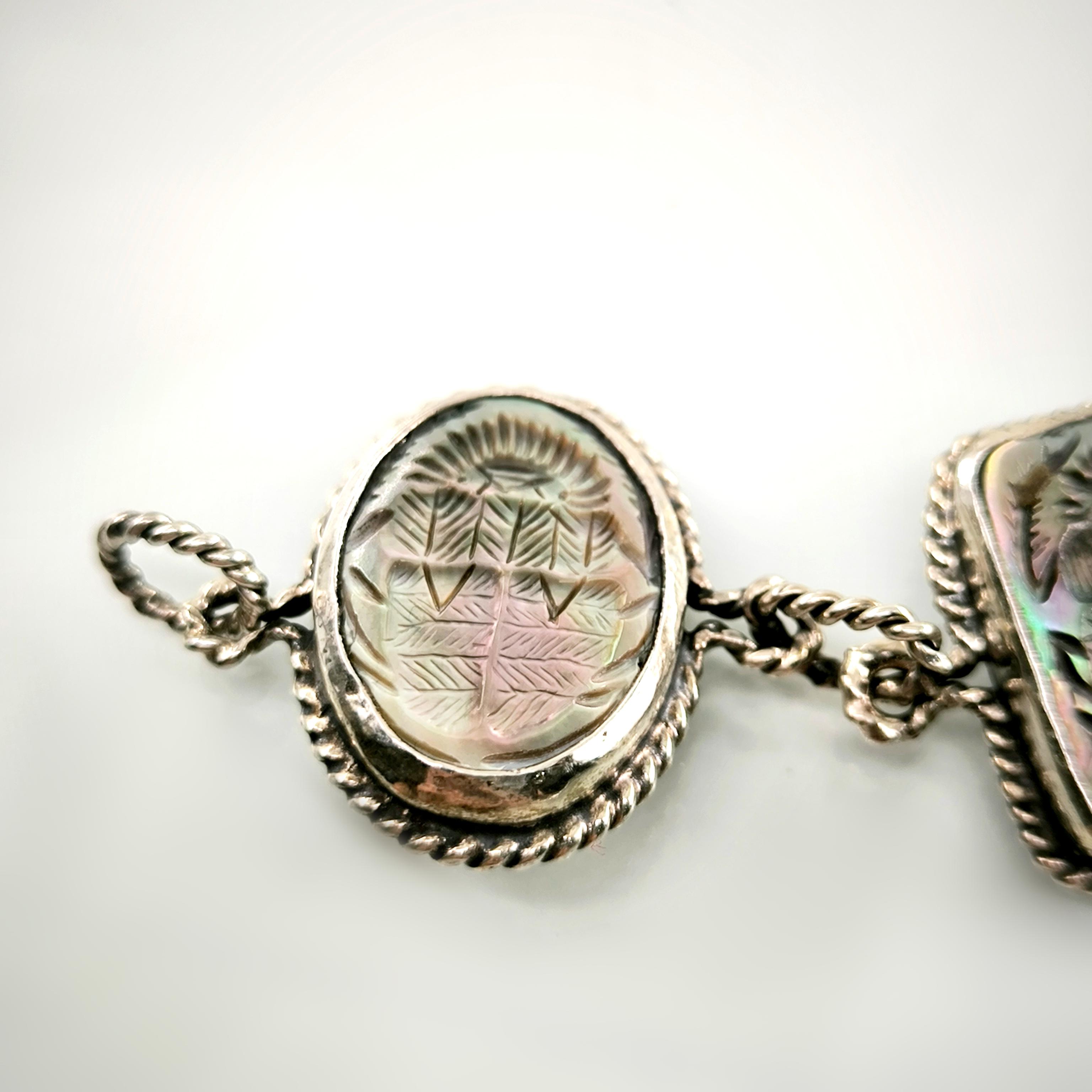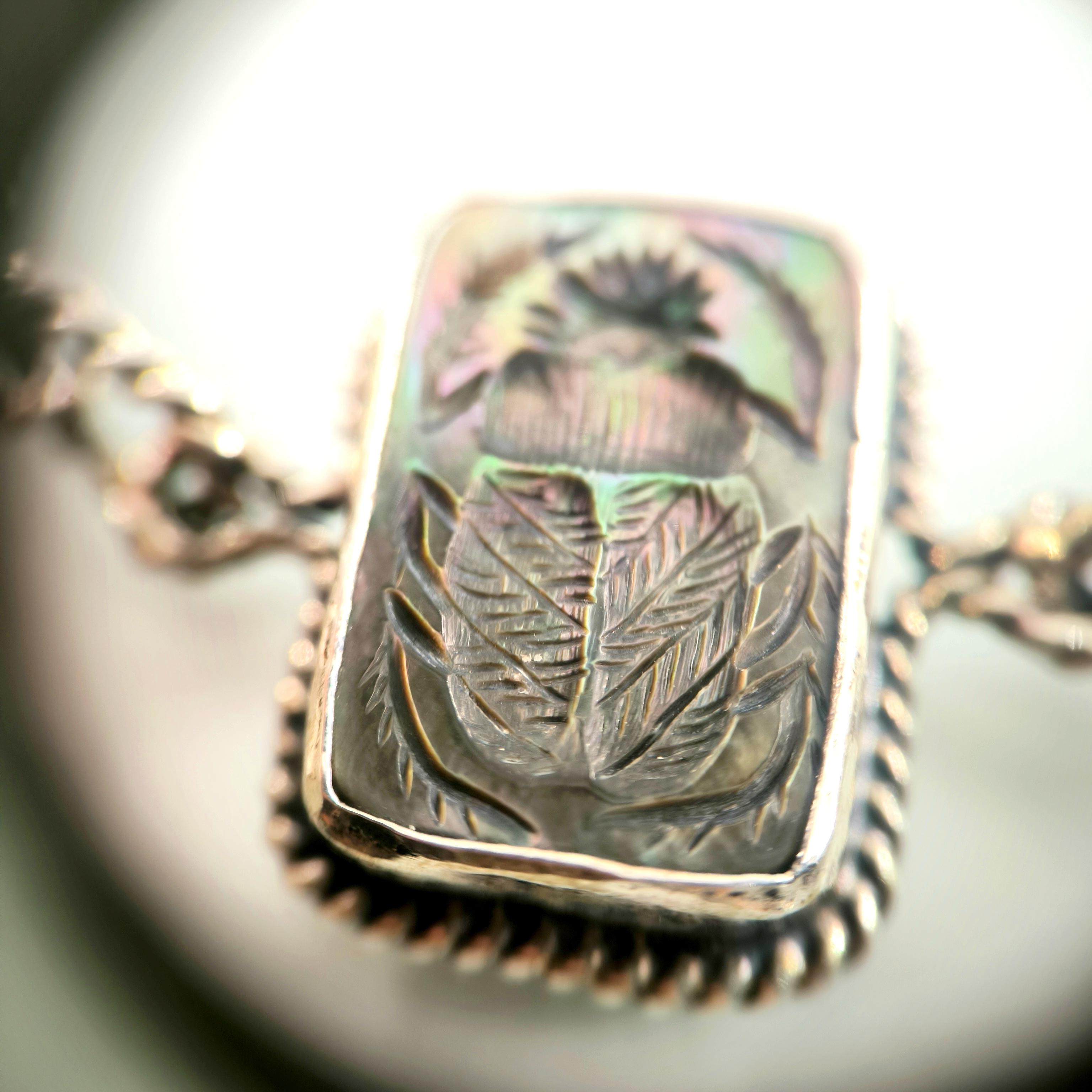 Bu bilekliği tasarlarken Antik Mısır’ın en güçlü sembollerinden biri olan scarab’ı merkezine alan bir kompozisyon yaratmak istedim. Tamamı 925 ayar gümüşten hazırlanan bilekliğin ortasında yer alan doğal firuze, üç boyutlu scarab kabartmasıyla adeta kadim bir mühür gibi yükselir. Etrafını saran okyanus sedefi taşların üzerine işlediğim ince detaylı scarab intaglioları ise ışıkla birlikte büyüleyici bir renk oyununa dönüşür. Sedefin doğal tonları ve firuzenin canlı rengi, antik Mısır estetiğini güçlü bir sanat diliyle bir araya getirir. Bu parça yalnızca bir bileklik değil; mitoloji, sembolizm ve ustalığın birleştiği koleksiyonluk bir mücevherdir. Bileğinizde taşıyacağınız küçük ama etkileyici bir tarih parçası.