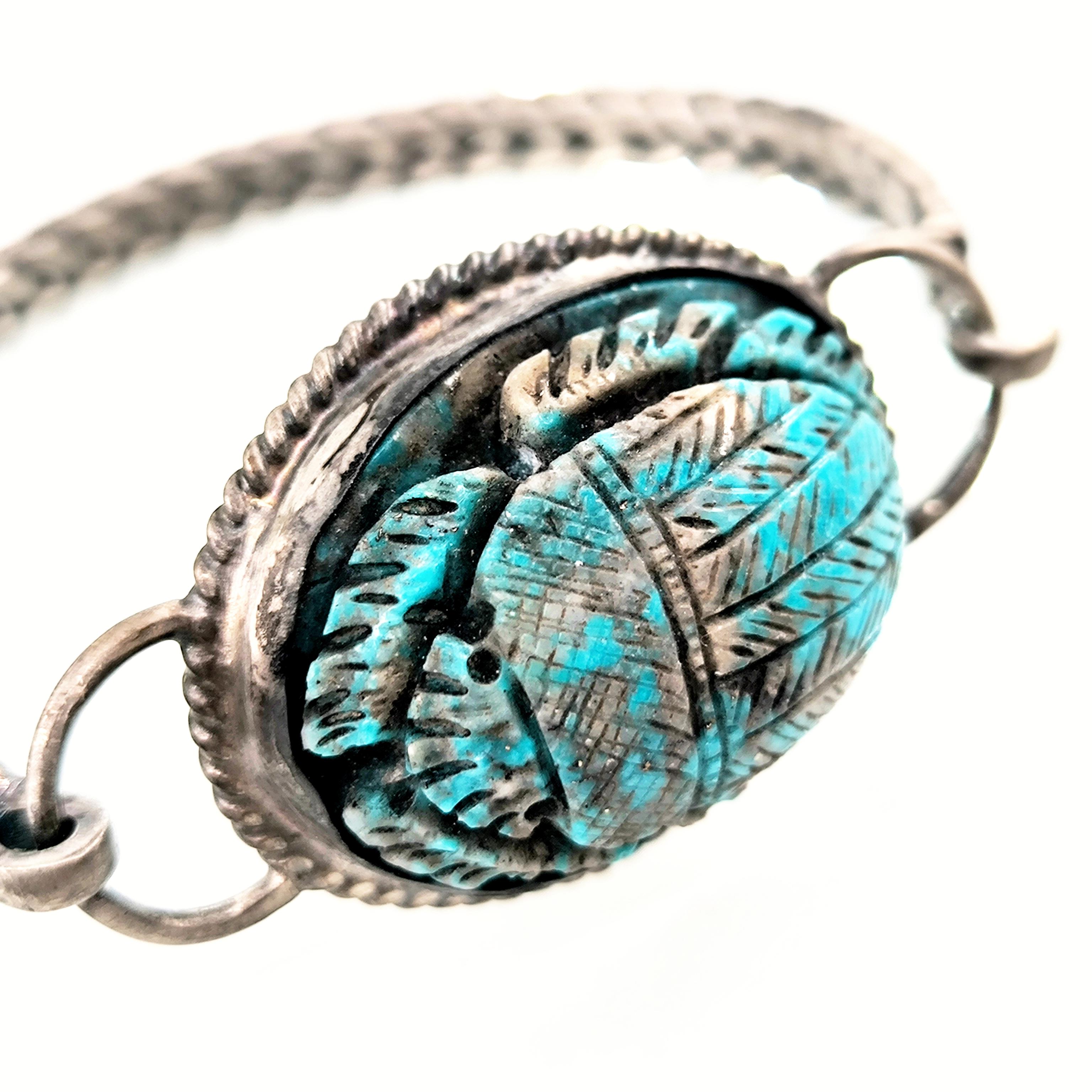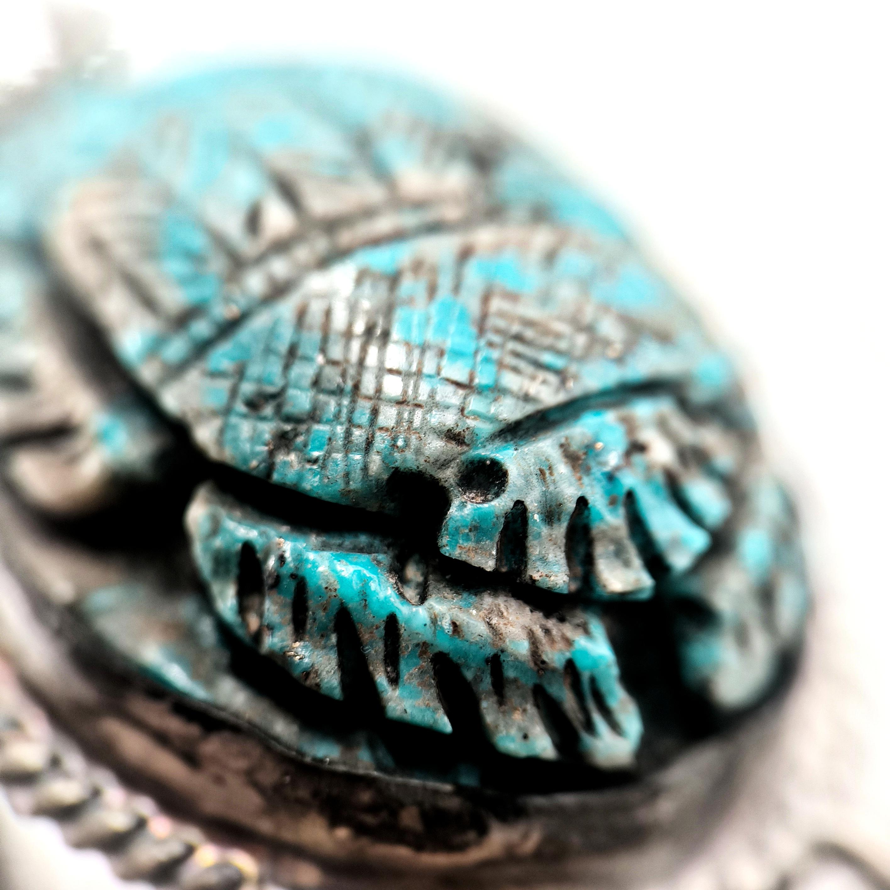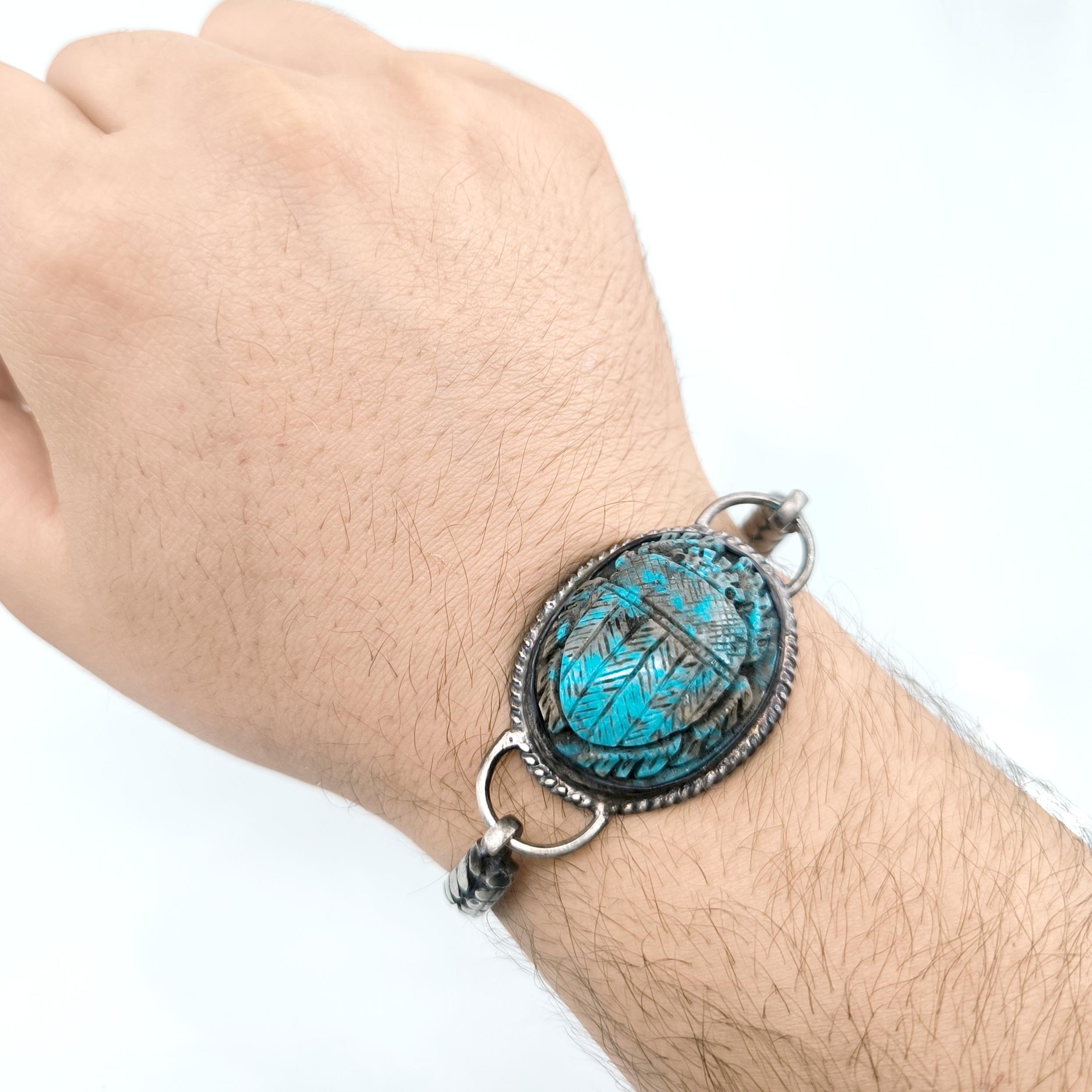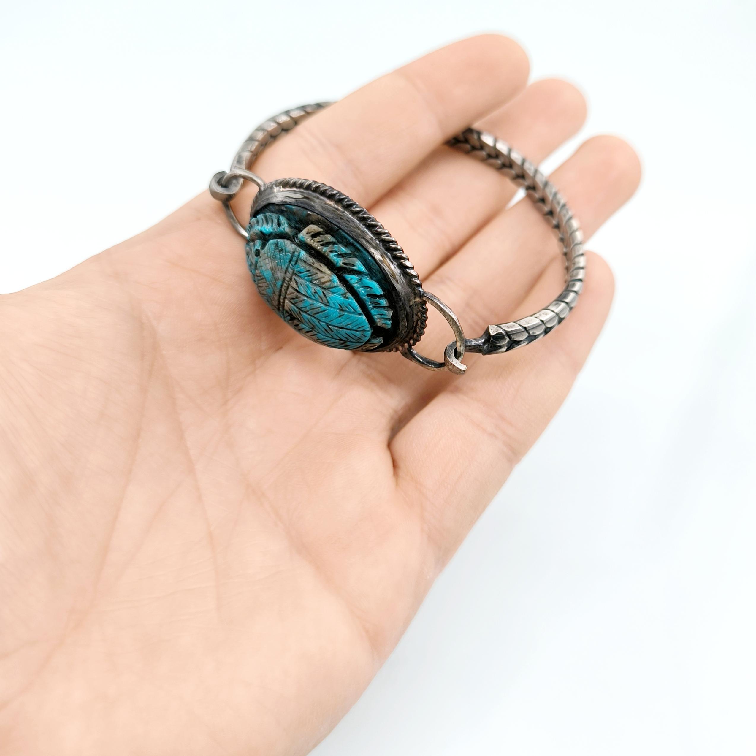 Bu bileklik sadece bir aksesuar değil; yeniden doğuşun, şansın ve ruhsal korumanın simgesi. Turkuaz damarlarıyla oyulmuş scarab figürü, Hayat döngüsünü ve ruhsal dönüşümü temsil ediyor. 925 Ayar Gümüşten el örmesi zincirli kolu bileğe sadelikle sarılırken gücünü hissettiriyor. Unisex tasarımıyla hem geçmişi hemde bugünü kucaklayan bir koruyucu. Takana şans, cesaret ve ruhsal denge getirmesi dileğiyle!