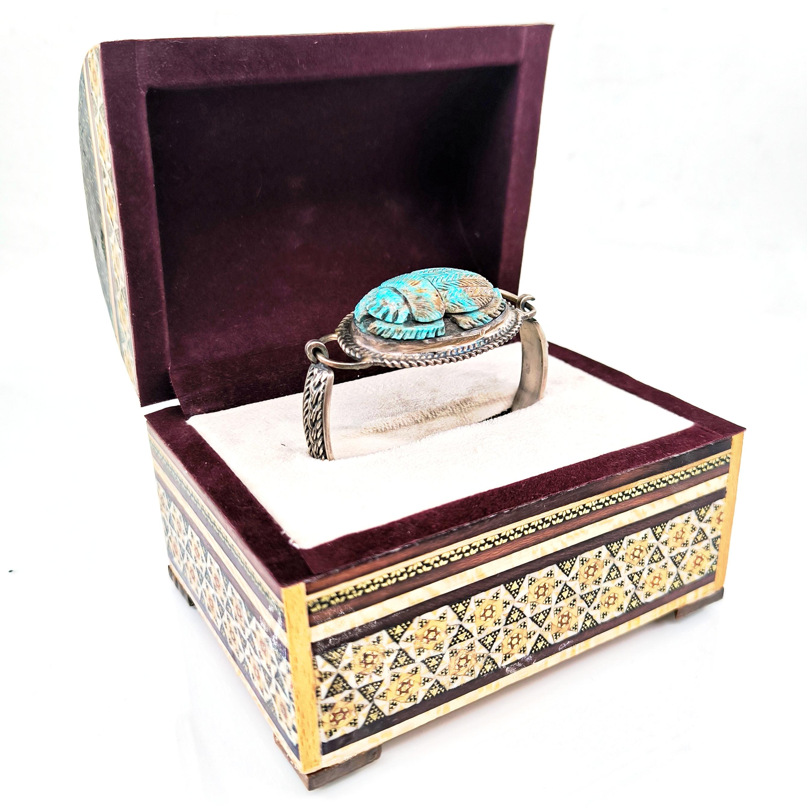 Bu bileklik sadece bir aksesuar değil; yeniden doğuşun, şansın ve ruhsal korumanın simgesi. Turkuaz damarlarıyla oyulmuş scarab figürü, Hayat döngüsünü ve ruhsal dönüşümü temsil ediyor. 925 Ayar Gümüşten el örmesi zincirli kolu bileğe sadelikle sarılırken gücünü hissettiriyor. Unisex tasarımıyla hem geçmişi hemde bugünü kucaklayan bir koruyucu. Takana şans, cesaret ve ruhsal denge getirmesi dileğiyle! Ve her şey, İran tezhip sanatının zarafetini taşıyan tamamı el boyama çok çok özel yuvalı sandıkta sunuluyor.