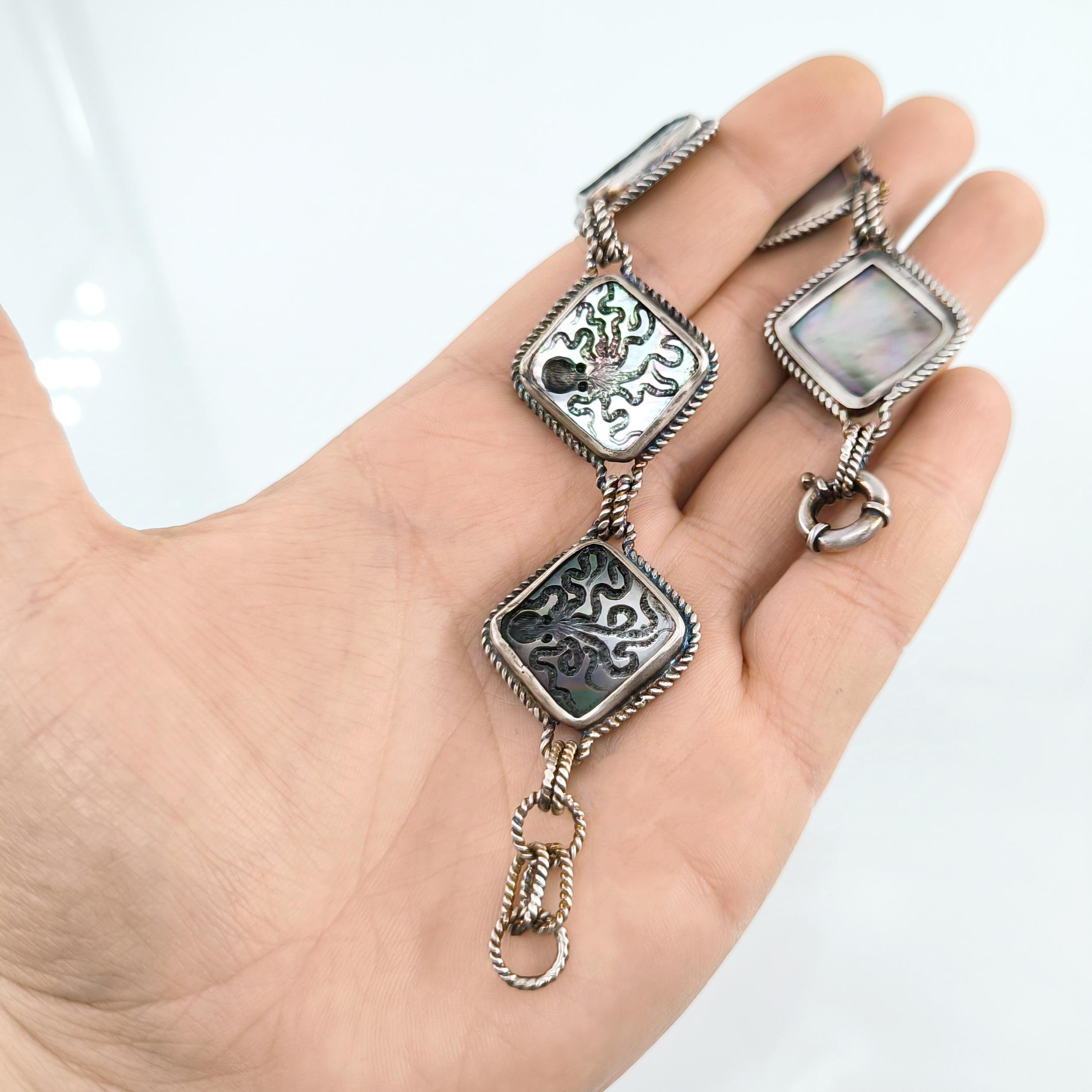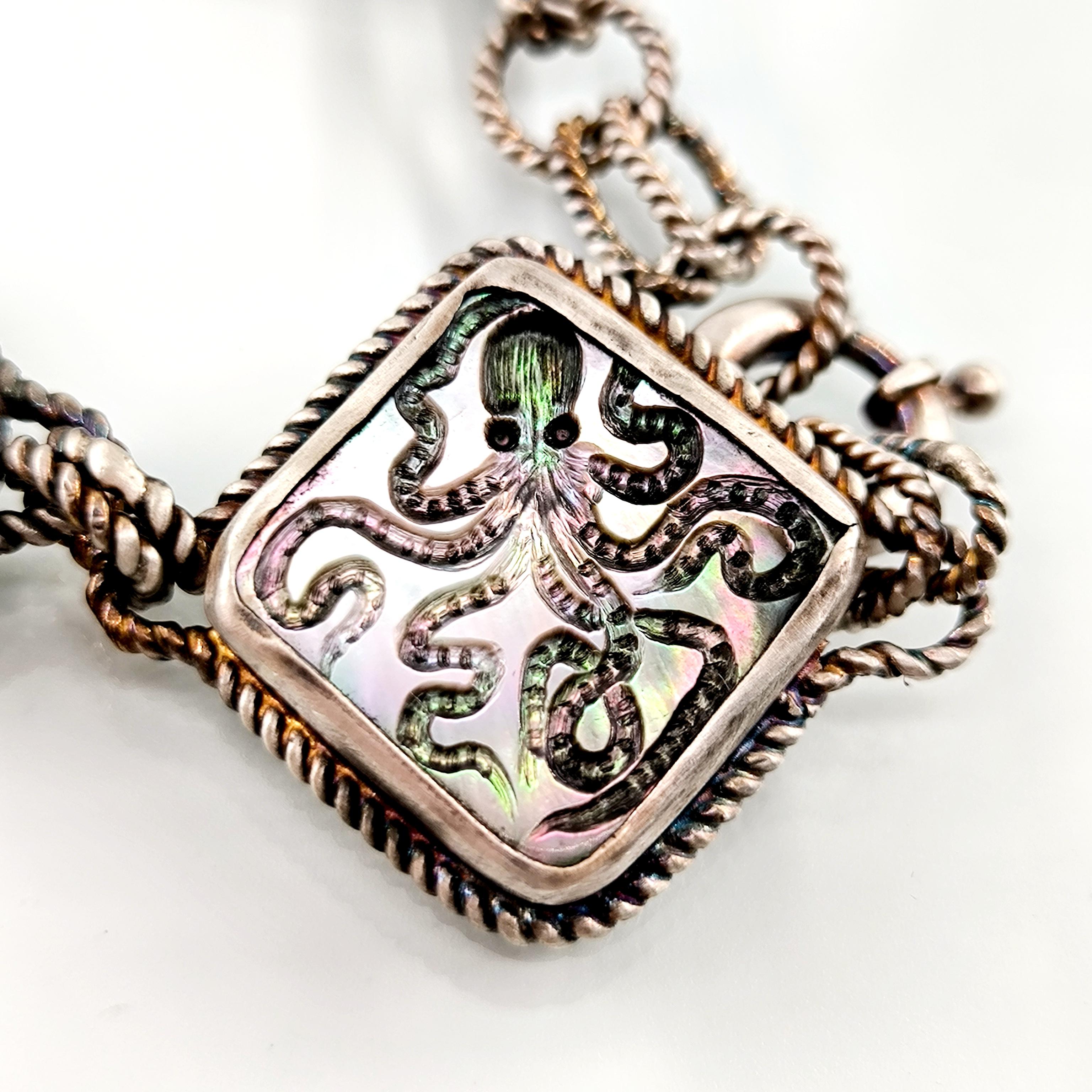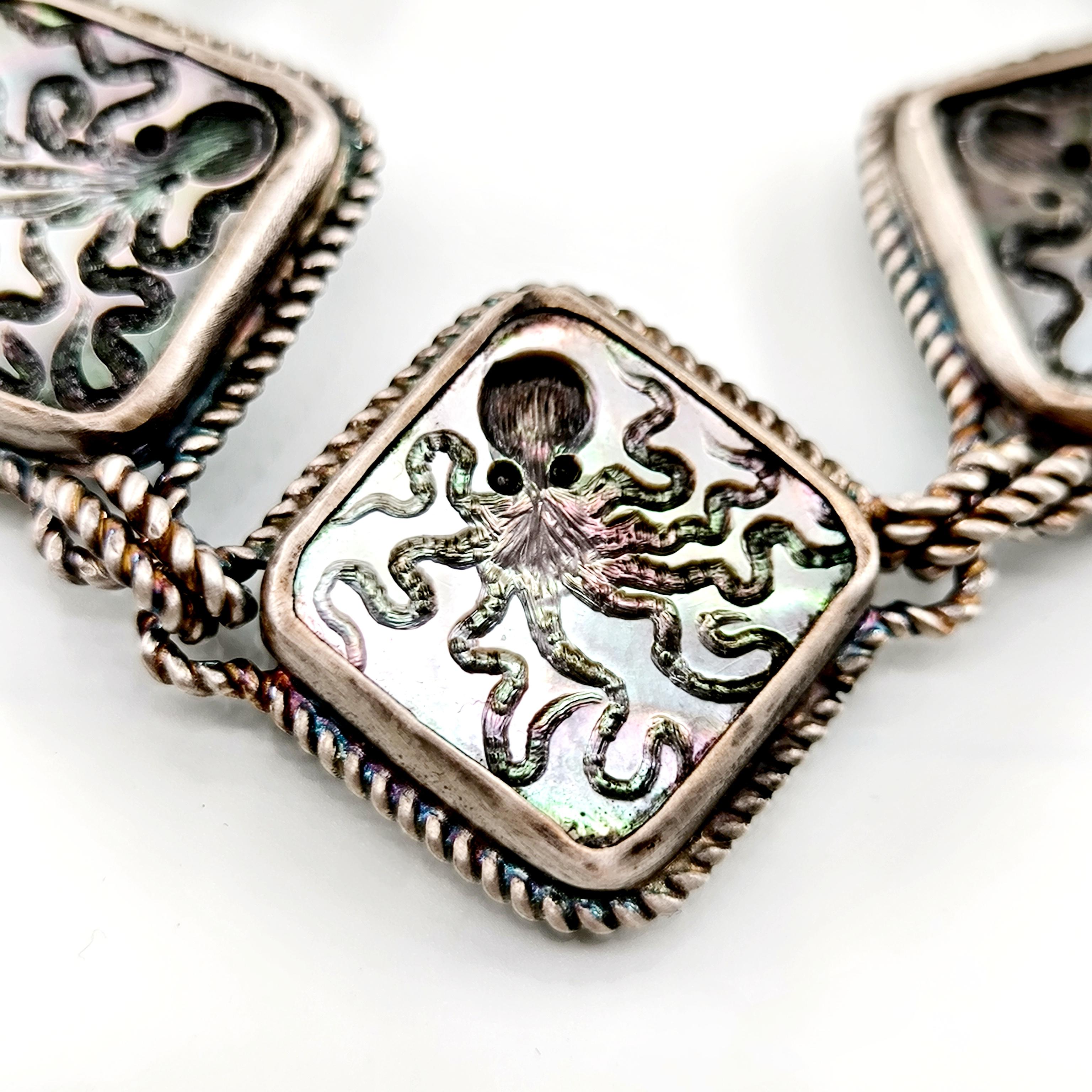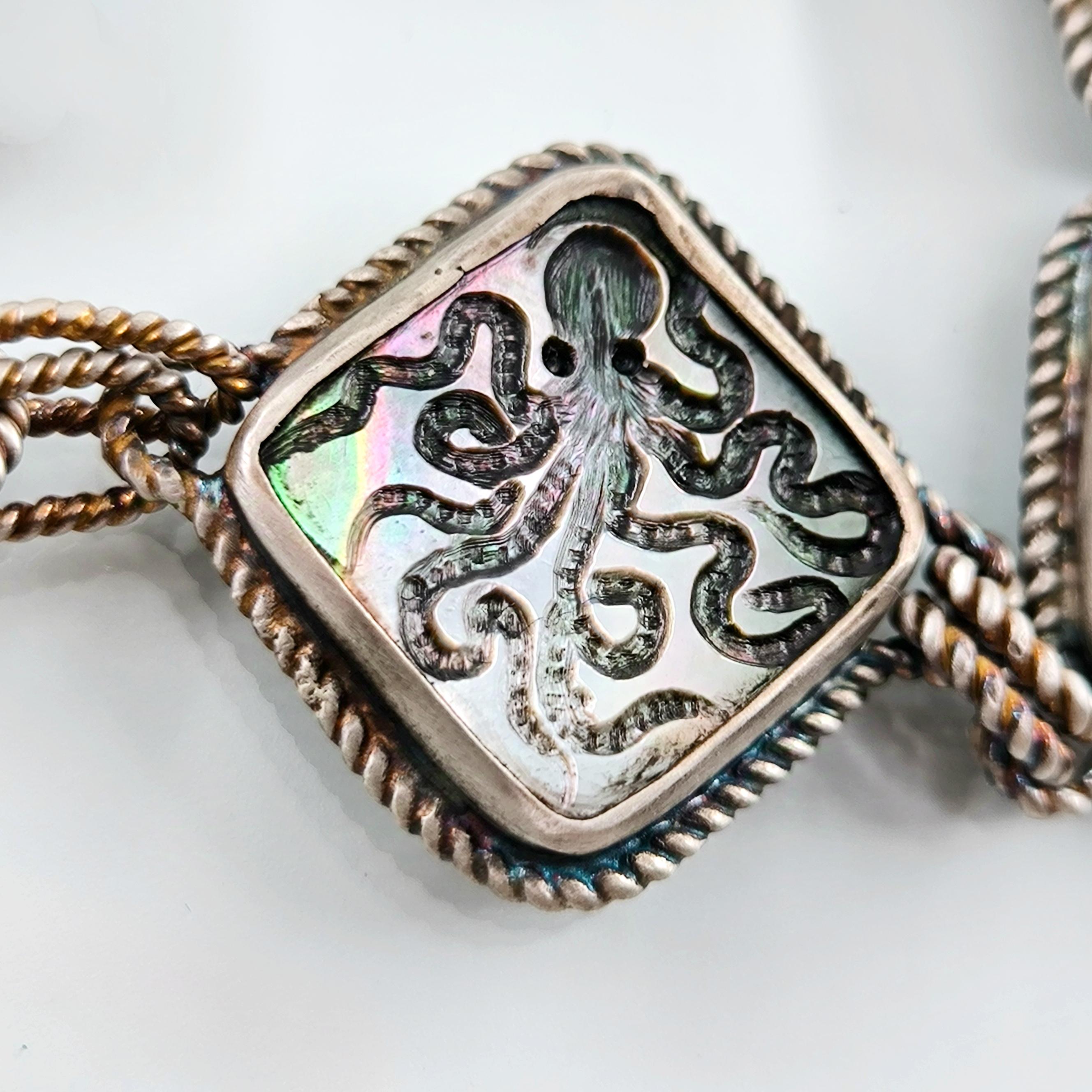 Duyguların, zekanın, mantığın, esnekliğin, potansiyelin ve yaratıcılığın sembolü; Ahtapot! Bu figür antik mücevherler de çok nadir bulunan bir sembol olsada gizemli ve çok sevimli bu yaratığı, özel tasarımımız ile bir mücevhere dönüştürdük ! Tüm çerçevesi gümüş olan, okyanus sedefi üzerine ahtapot intaglio çalışmaları yaptığımız eşsiz güzellikte bir eser!