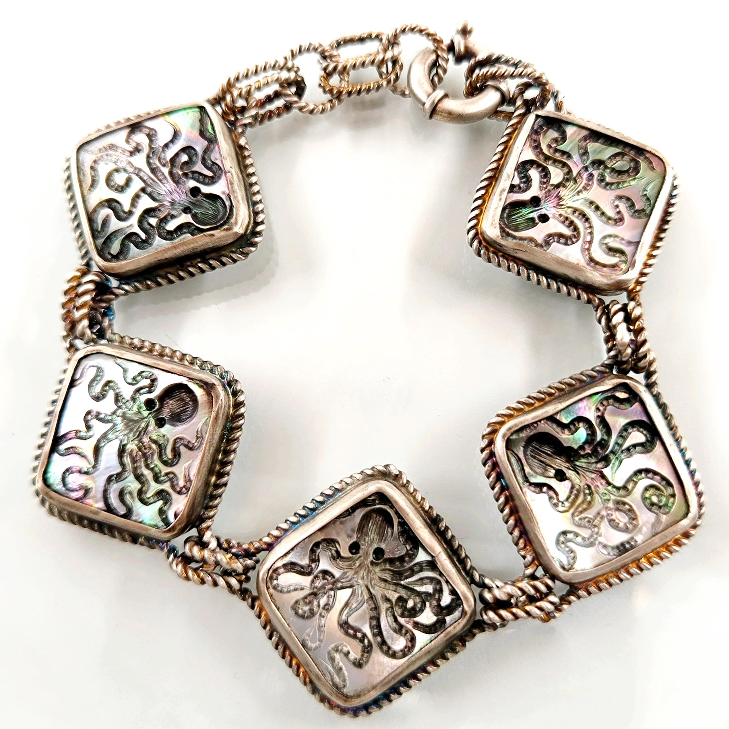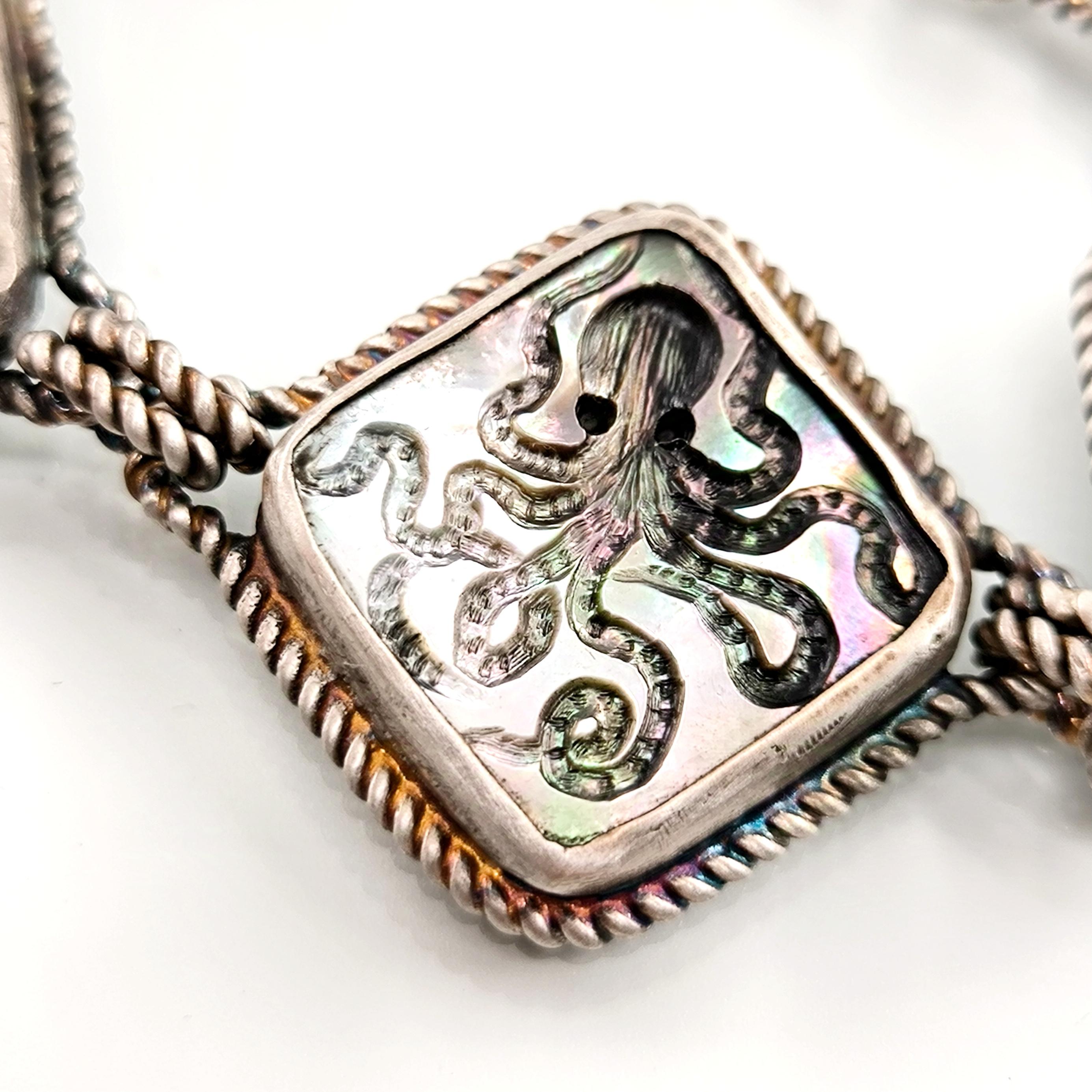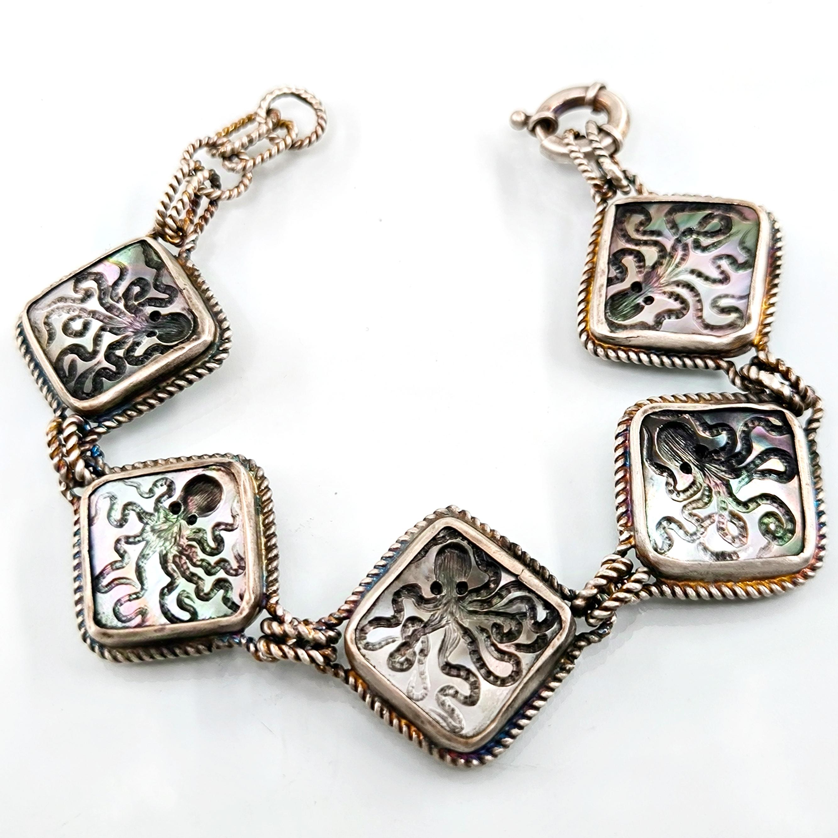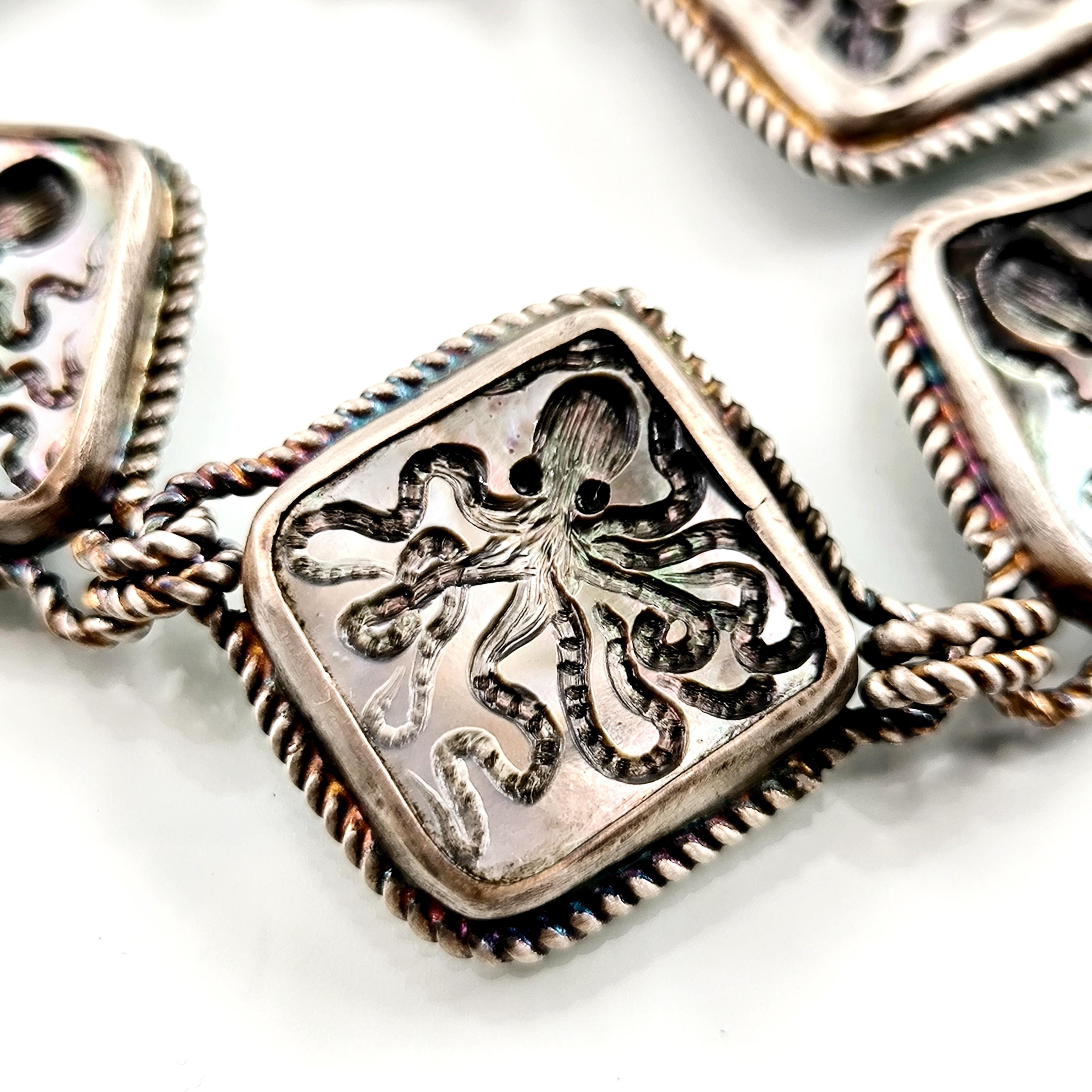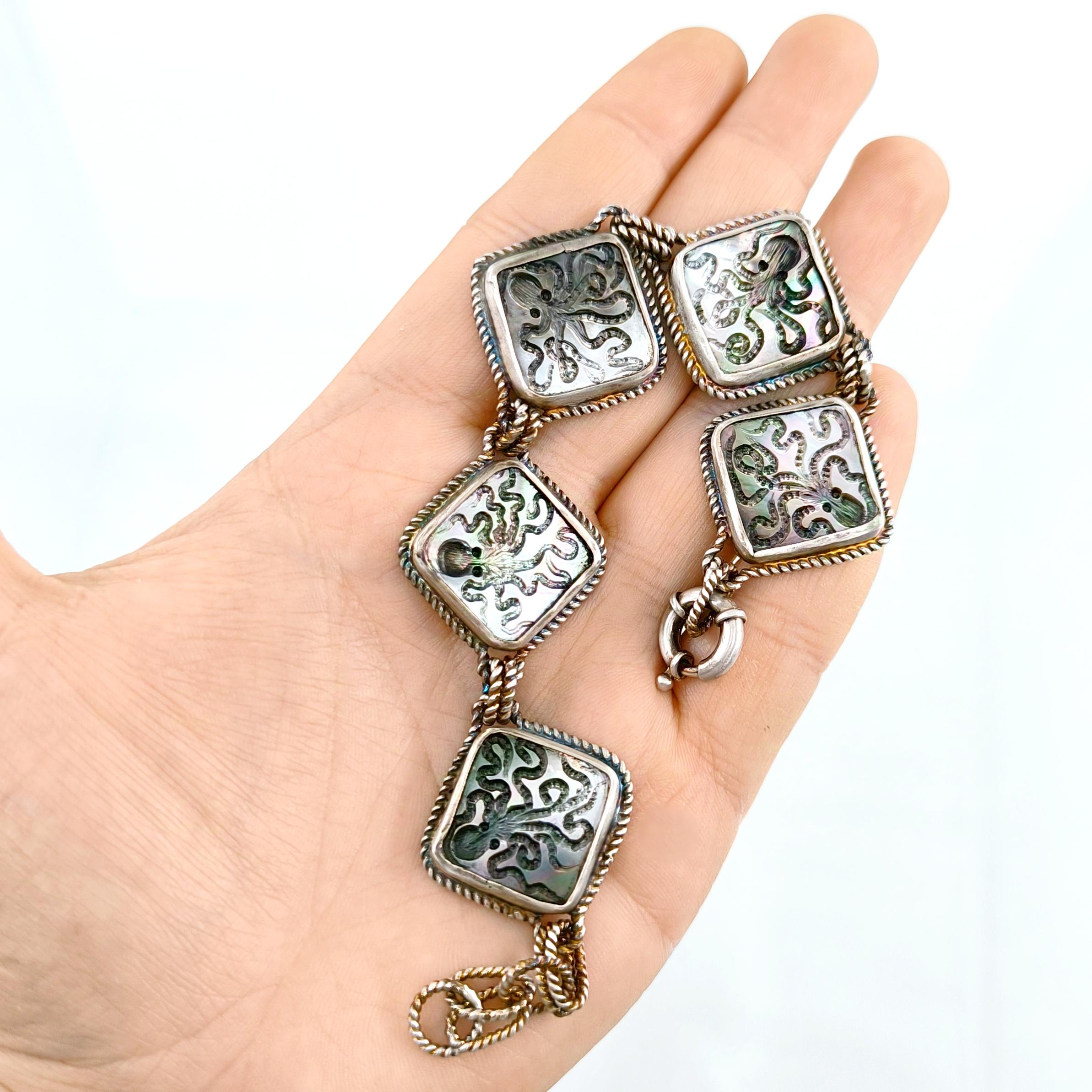 Duyguların, zekanın, mantığın, esnekliğin, potansiyelin ve yaratıcılığın sembolü; Ahtapot! Bu figür antik mücevherler de çok nadir bulunan bir sembol olsada gizemli ve çok sevimli bu yaratığı, özel tasarımımız ile bir mücevhere dönüştürdük ! Tüm çerçevesi gümüş olan, okyanus sedefi üzerine ahtapot intaglio çalışmaları yaptığımız eşsiz güzellikte bir eser!