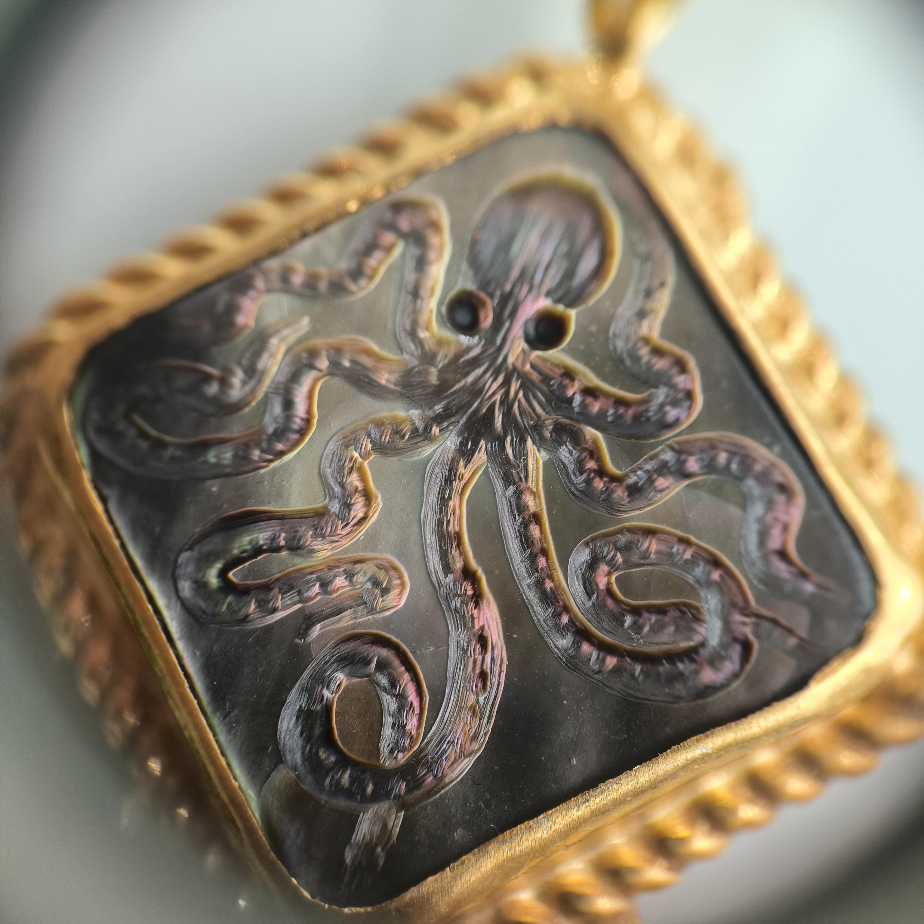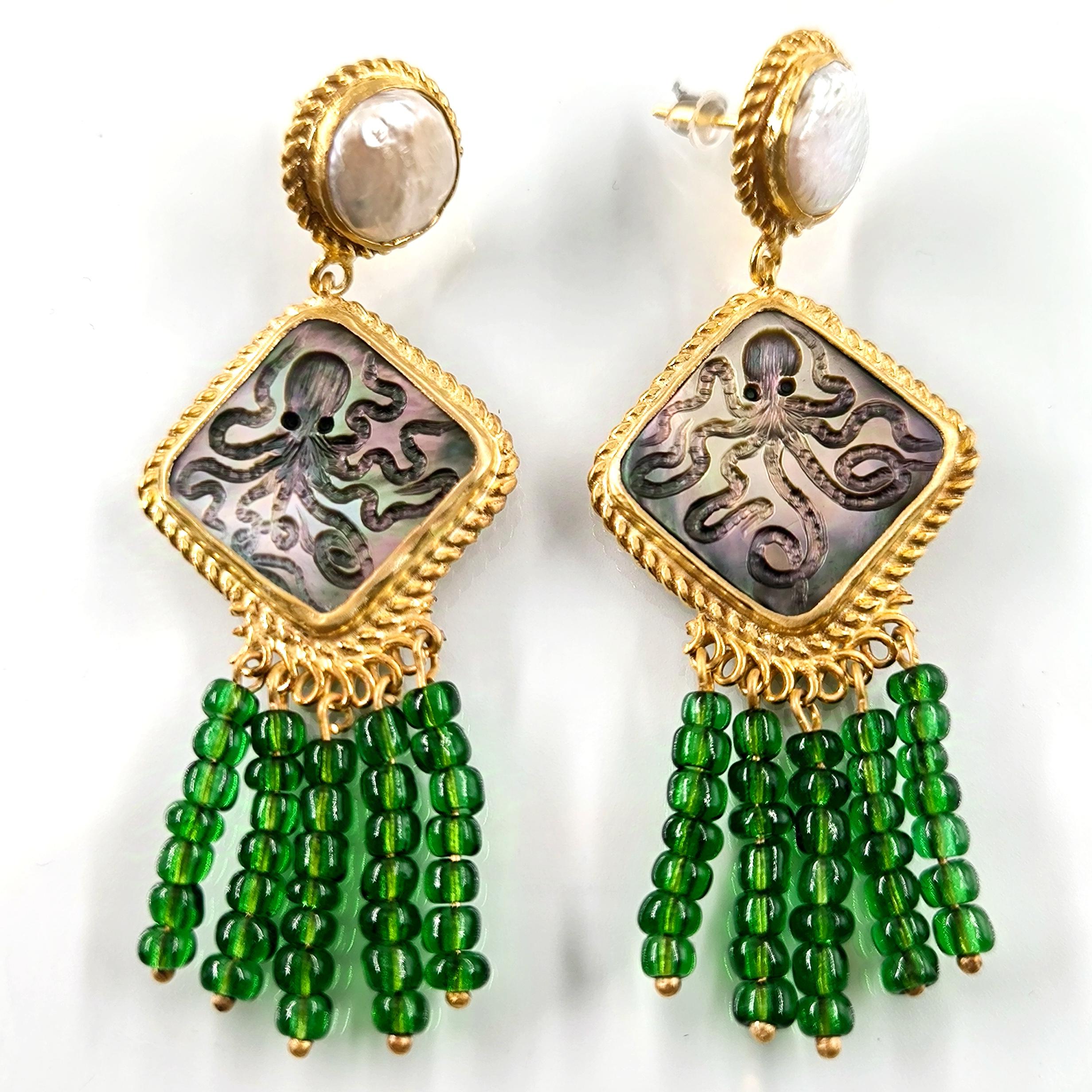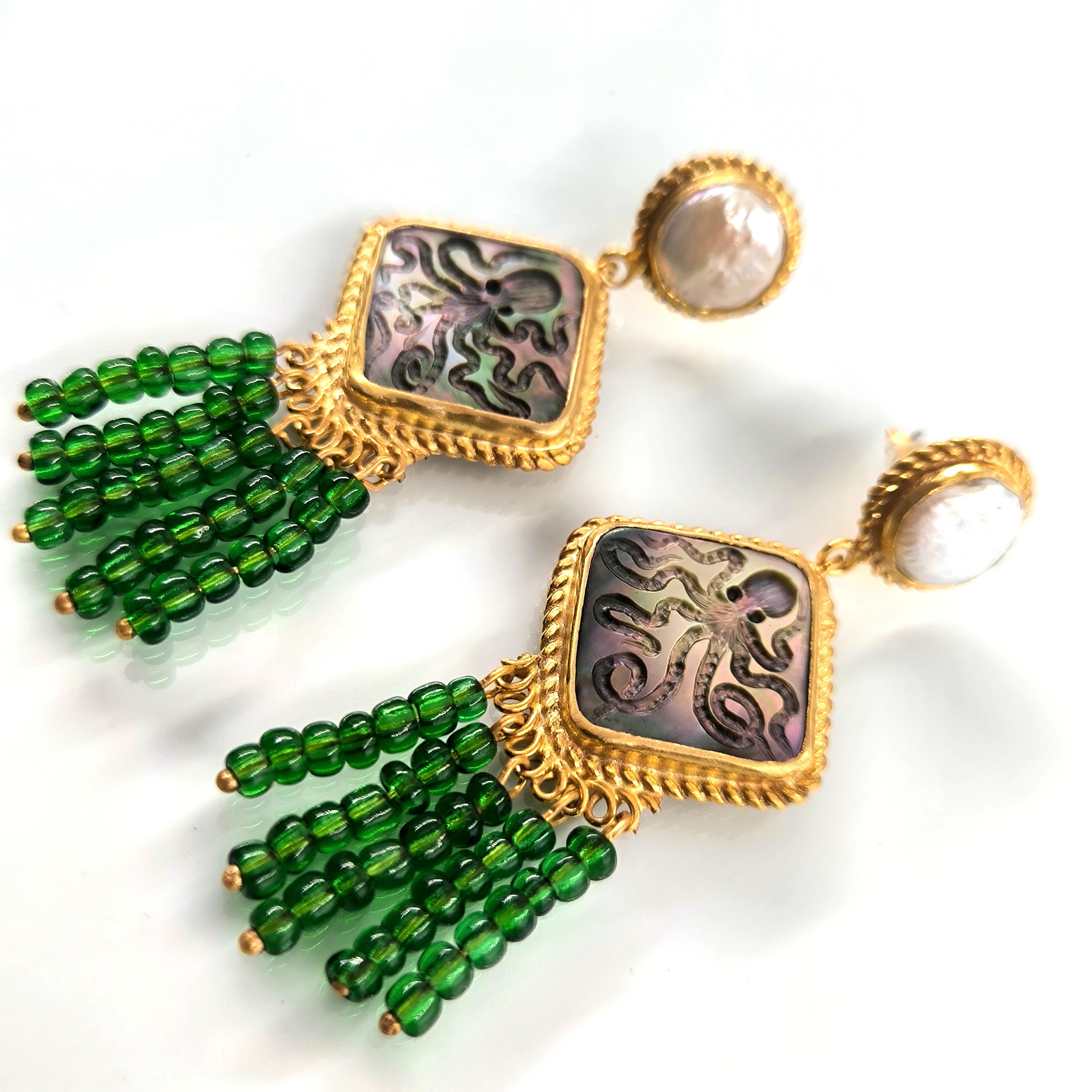Duyguların, zekanın, mantığın, esnekliğin, potansiyelin ve yaratıcılığın sembolü; Ahtapot! Bu figür antik mücevherler de çok nadir bulunan bir sembol olsada gizemli ve çok sevimli bu yaratığı, özel tasarımımız ile bir mücevhere dönüştürdük ! Tüm çerçevesi gümüş olan, okyanus sedefi üzerine ahtapot intaglio çalışmaları yaptığımız eşsiz güzellikte bir eser! sallantı püskülündeki yeşil taşlar cam boncuklardır.