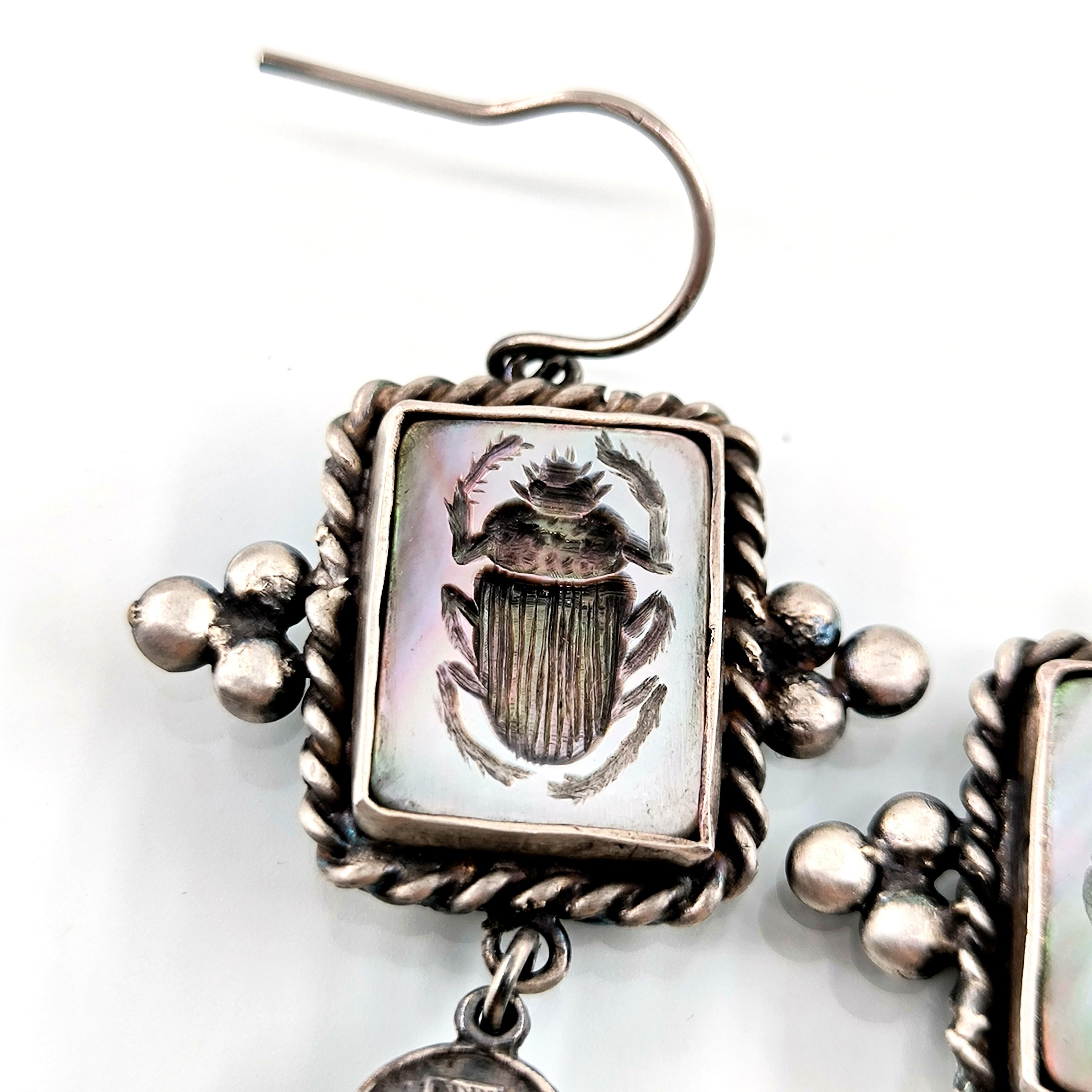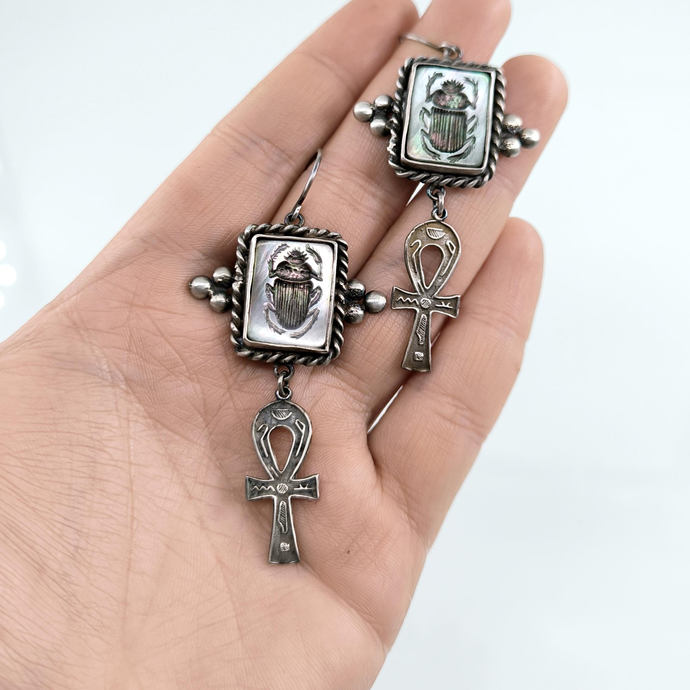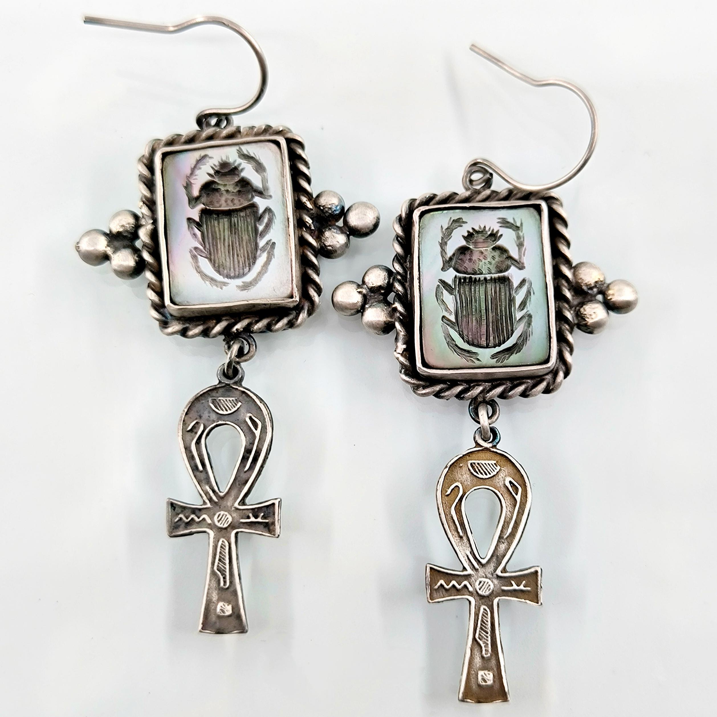 Kendi kendini doğuran Skarab! Güneşin gökyüzünde hareketini kumanda eden Kheper'in hiyeroglif işareti olarak bilinir, ayrıca Güneş tanrısı Ra'nın da önemli sembolleri arasındadır. Bok böceği biçiminde mühür ve muskalar bugün dahi şans ve uğur getirecek tılsımlar olarak itibar görürler. Nil'in anahtarı olarak bilinen Ankh sembolü ile süslediğimiz, sedef üzeri intaglio Scarab'lı bu gümüş küpeler tamamen bir ''mEdusA'' eseridir.