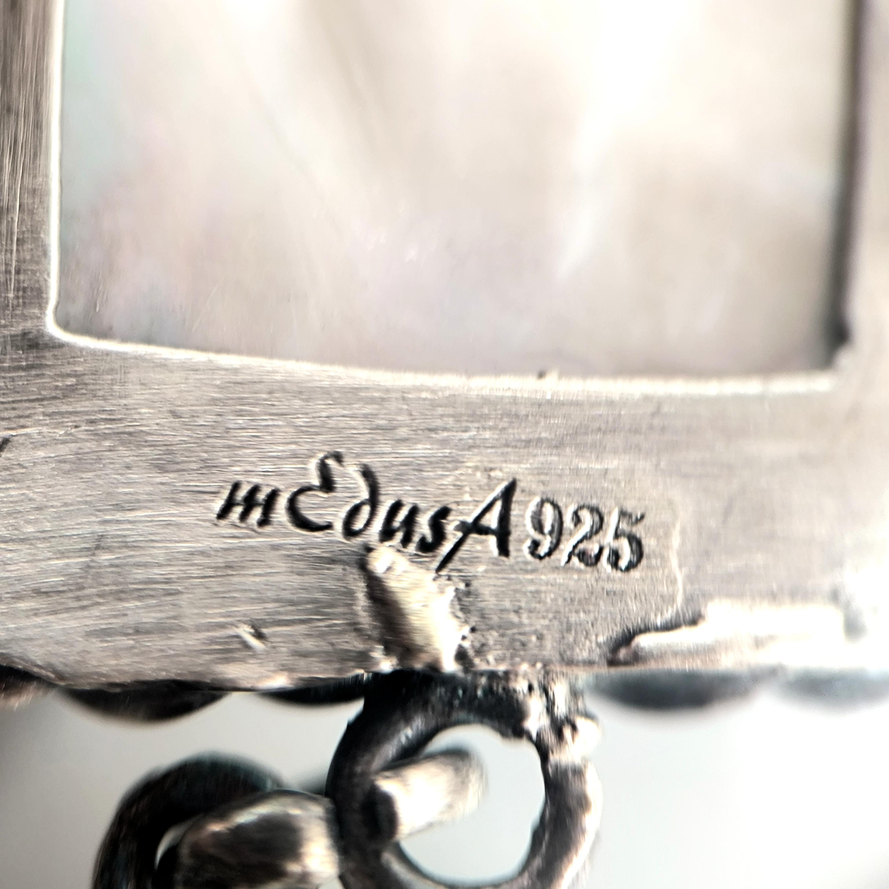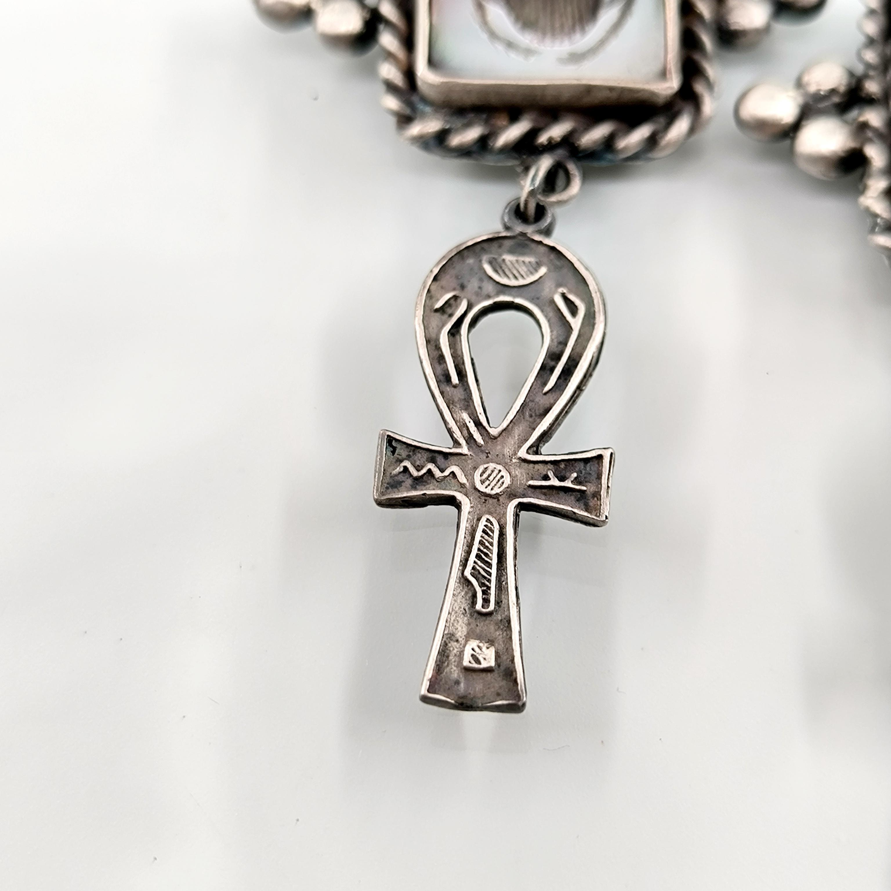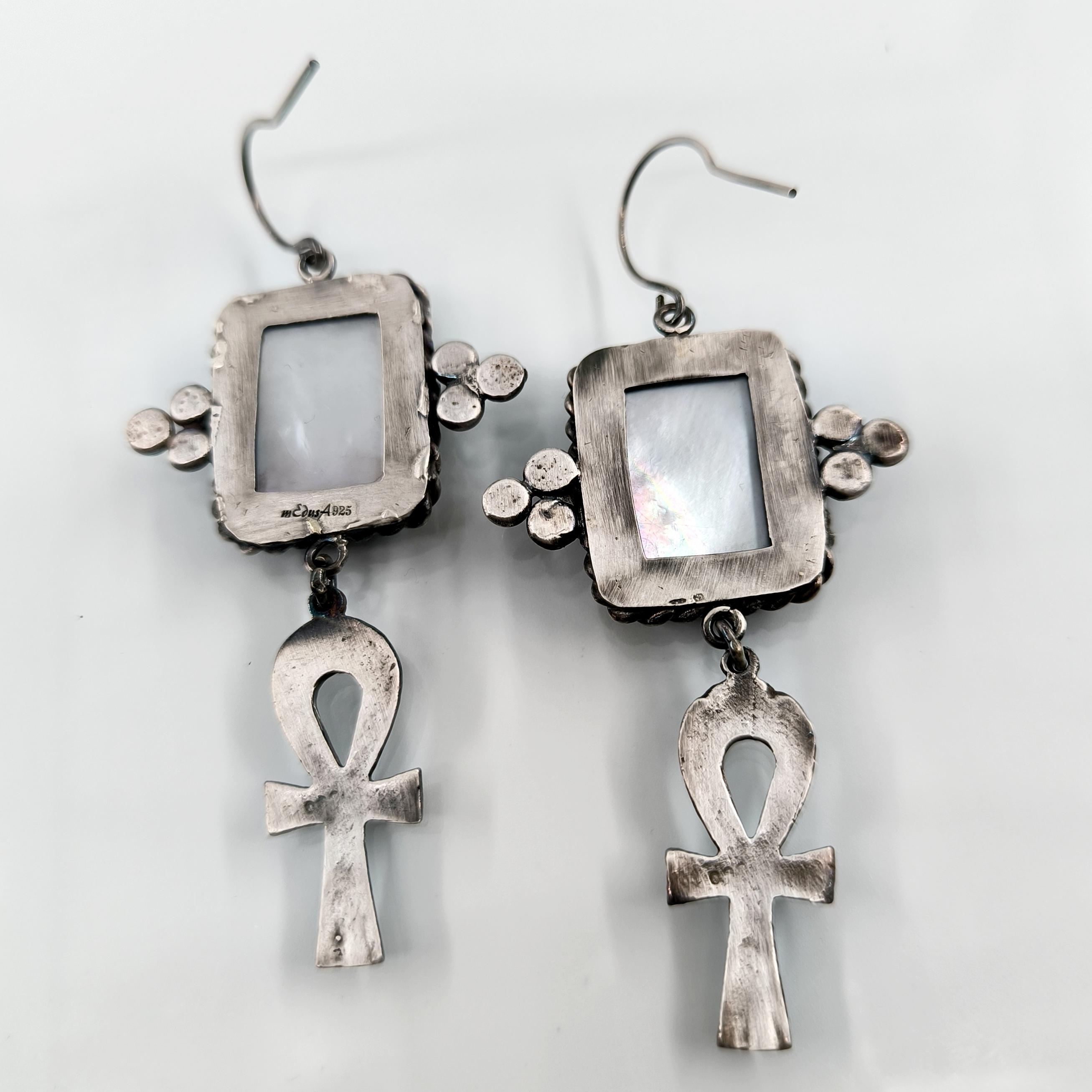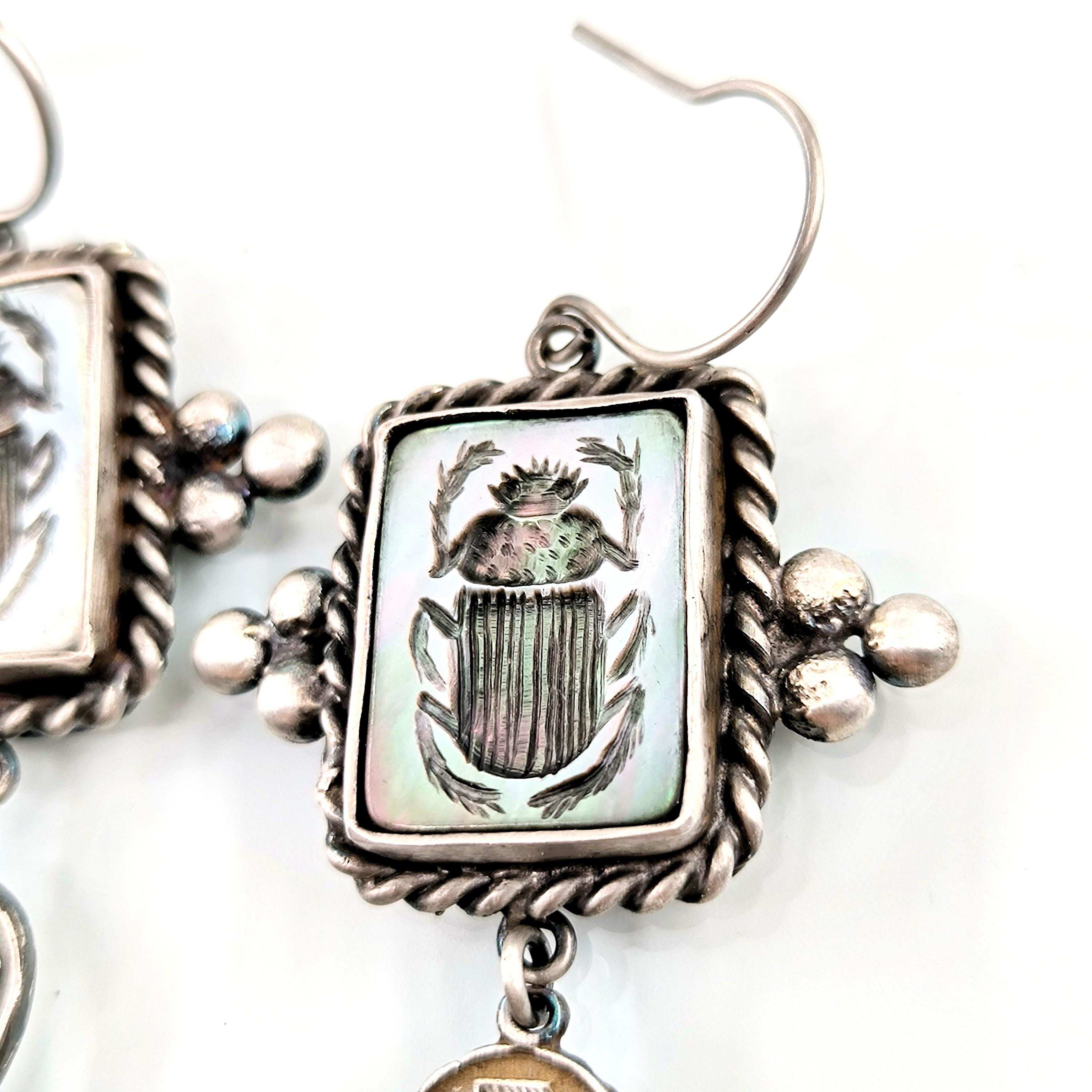 Kendi kendini doğuran Skarab! Güneşin gökyüzünde hareketini kumanda eden Kheper'in hiyeroglif işareti olarak bilinir, ayrıca Güneş tanrısı Ra'nın da önemli sembolleri arasındadır. Bok böceği biçiminde mühür ve muskalar bugün dahi şans ve uğur getirecek tılsımlar olarak itibar görürler. Nil'in anahtarı olarak bilinen Ankh sembolü ile süslediğimiz, sedef üzeri intaglio Scarab'lı bu gümüş küpeler tamamen bir ''mEdusA'' eseridir.