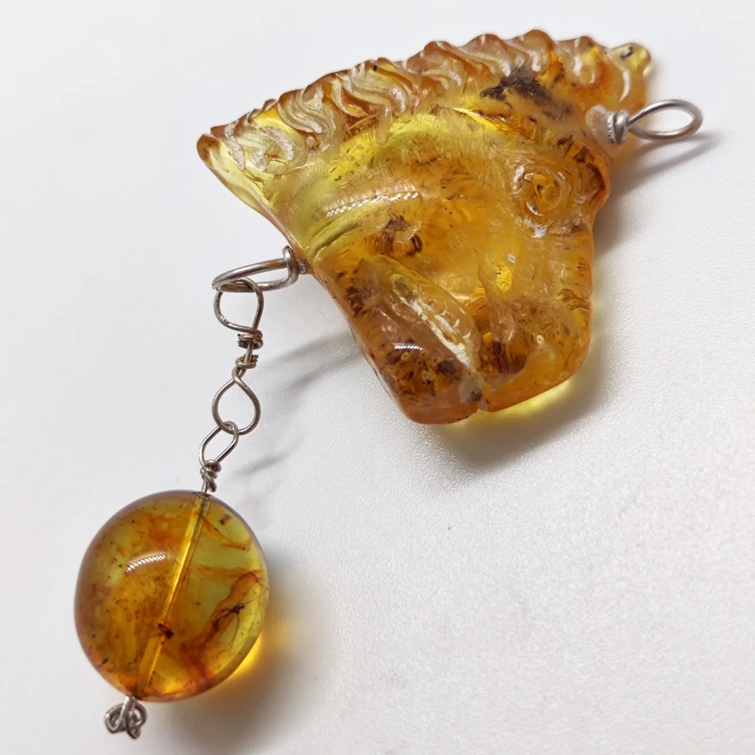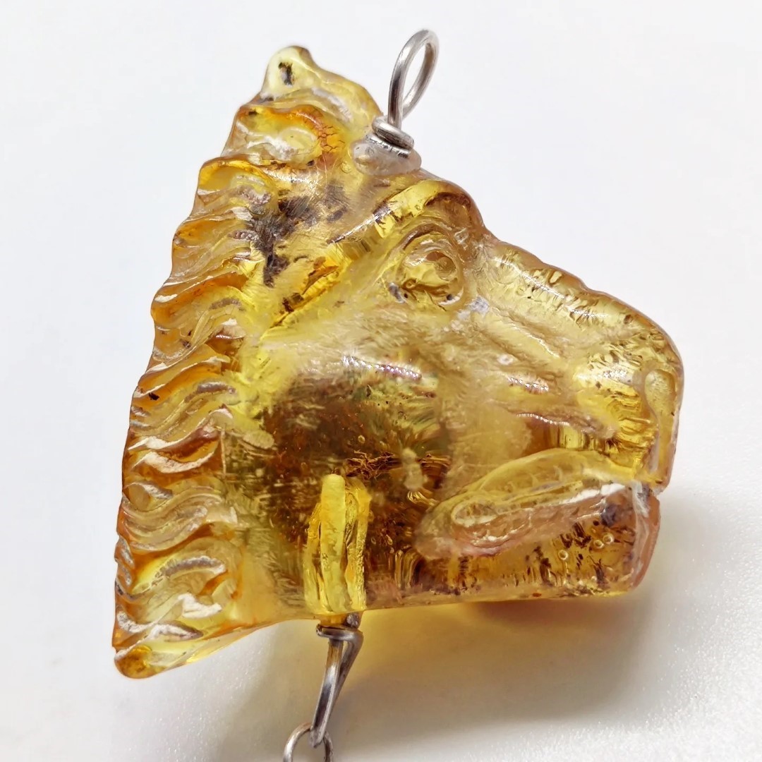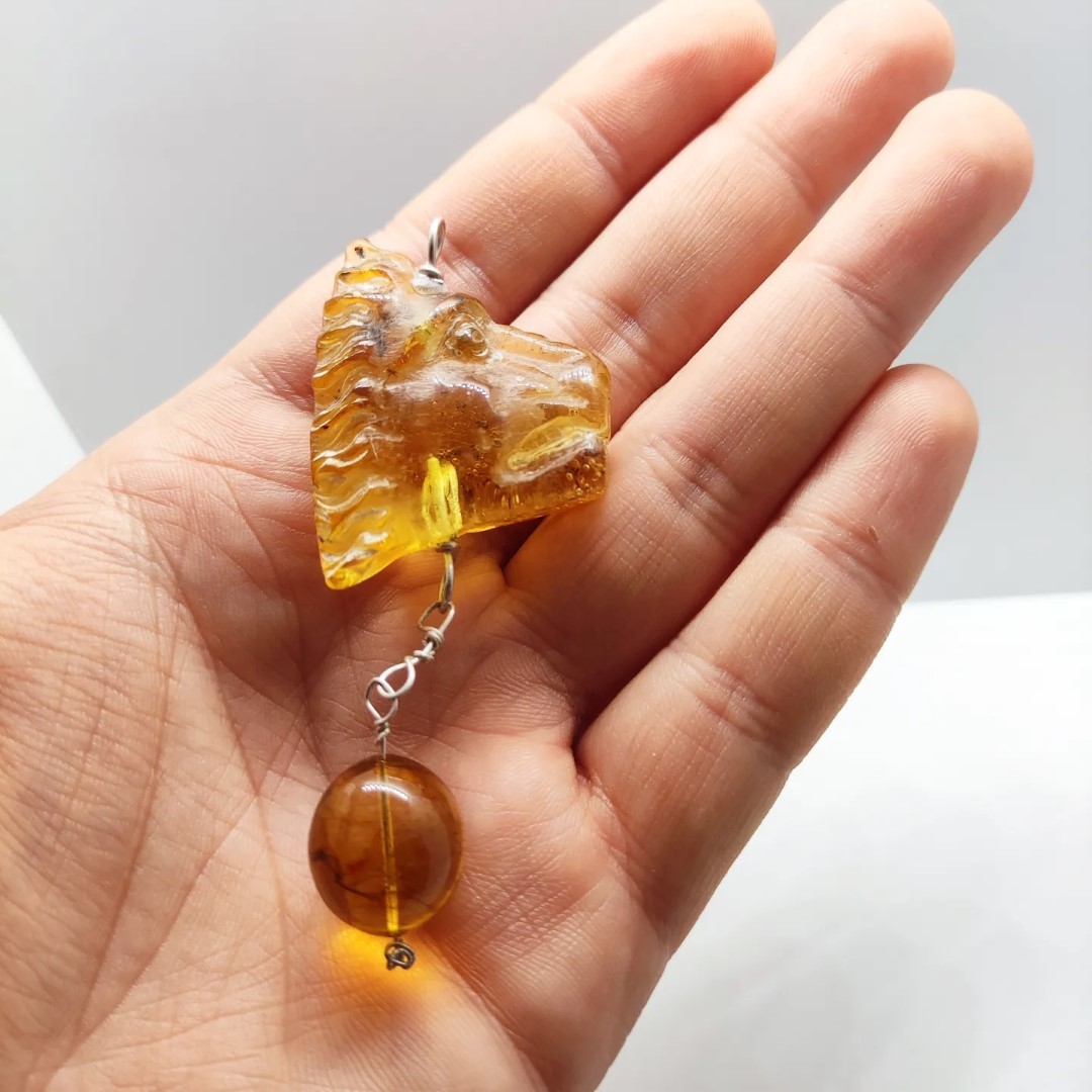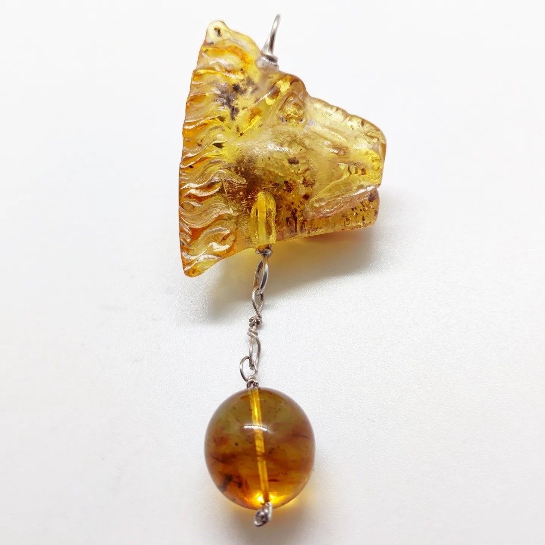 Muhteşem bir Aslan! Kaya Damla Kehribar taş üzerine Asalet ve güç timsali Aslan çalıştığımız, ve altından Dominik damla kehribar ile süslediğimiz, içleri milyonlarca yıllık sinek ve toprak fasilli, antik stilde amber kolyemiz!