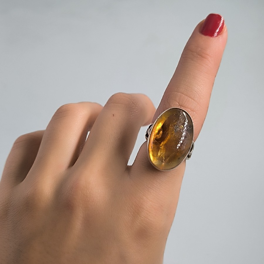 Bu özel yüzük, gümüş ile ustaca işlenmiş bir tasarıma sahiptir. Sitrin taşı, yüzüğün ortasında bulunan ve zarafetiyle göz kamaştıran bir şekilde yer alır. Doğal oluşumu sebebiyle her bir yüzük benzersiz bir tasarıma sahiptir ve böylece kişiliğinizi yansıtmanıza da olanak tanır.