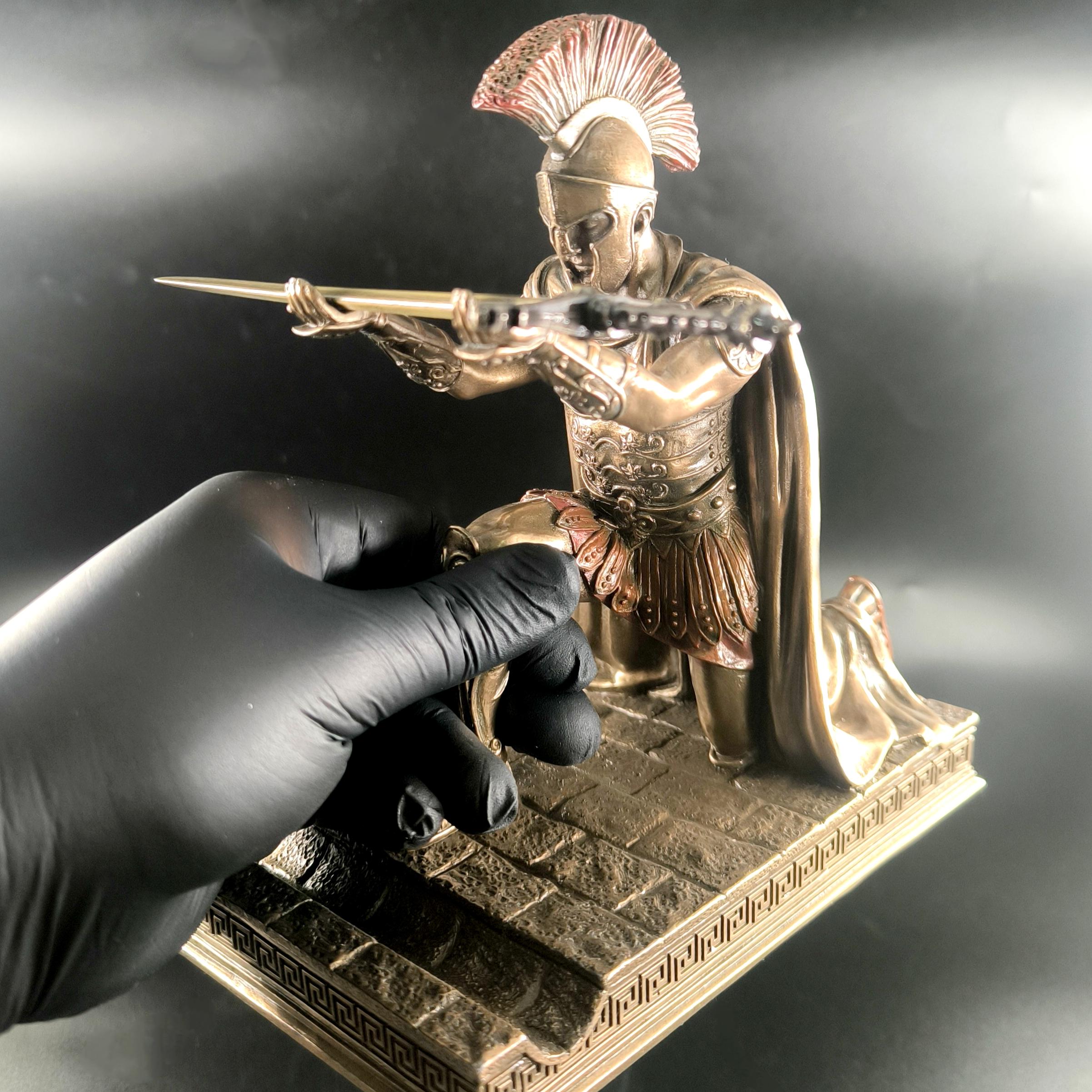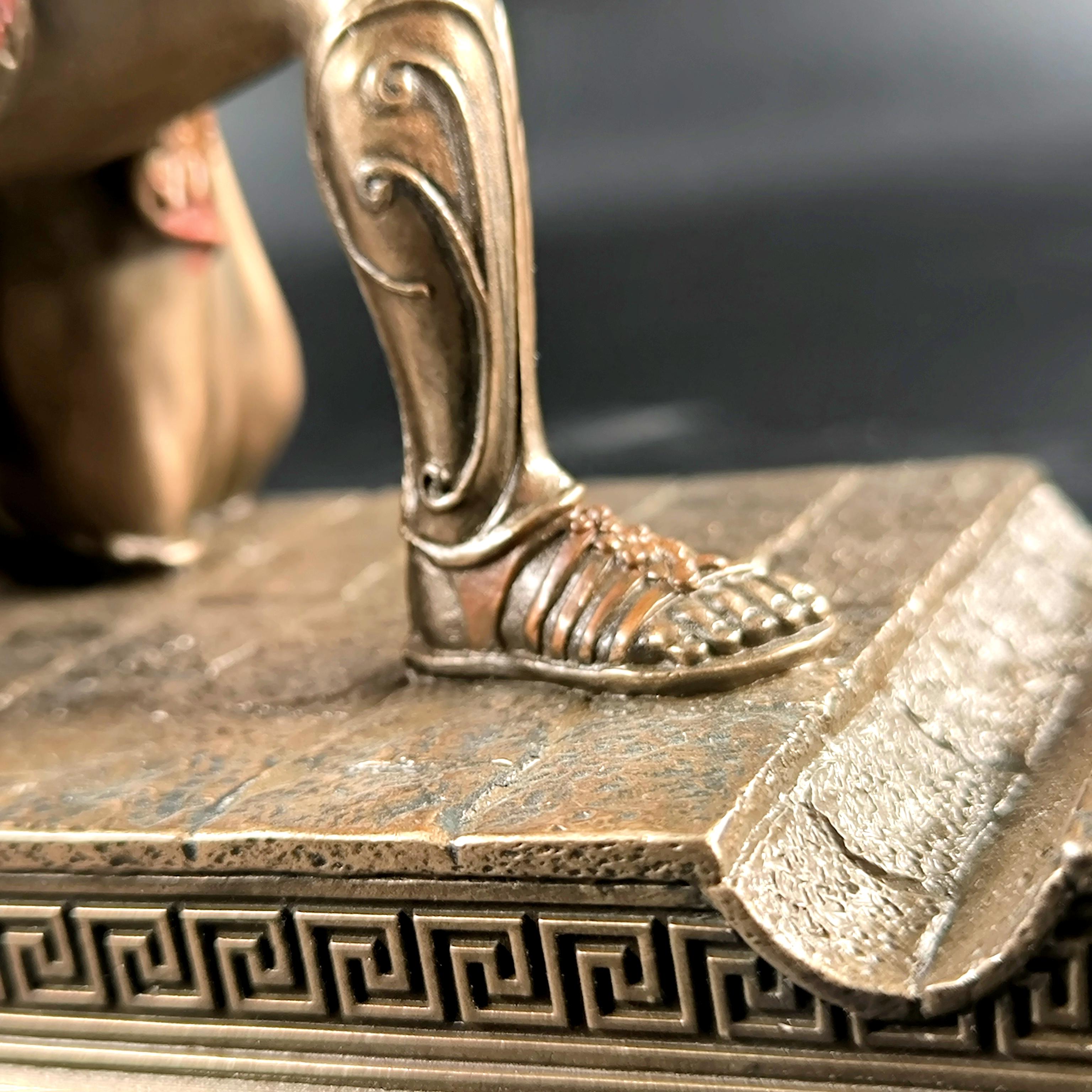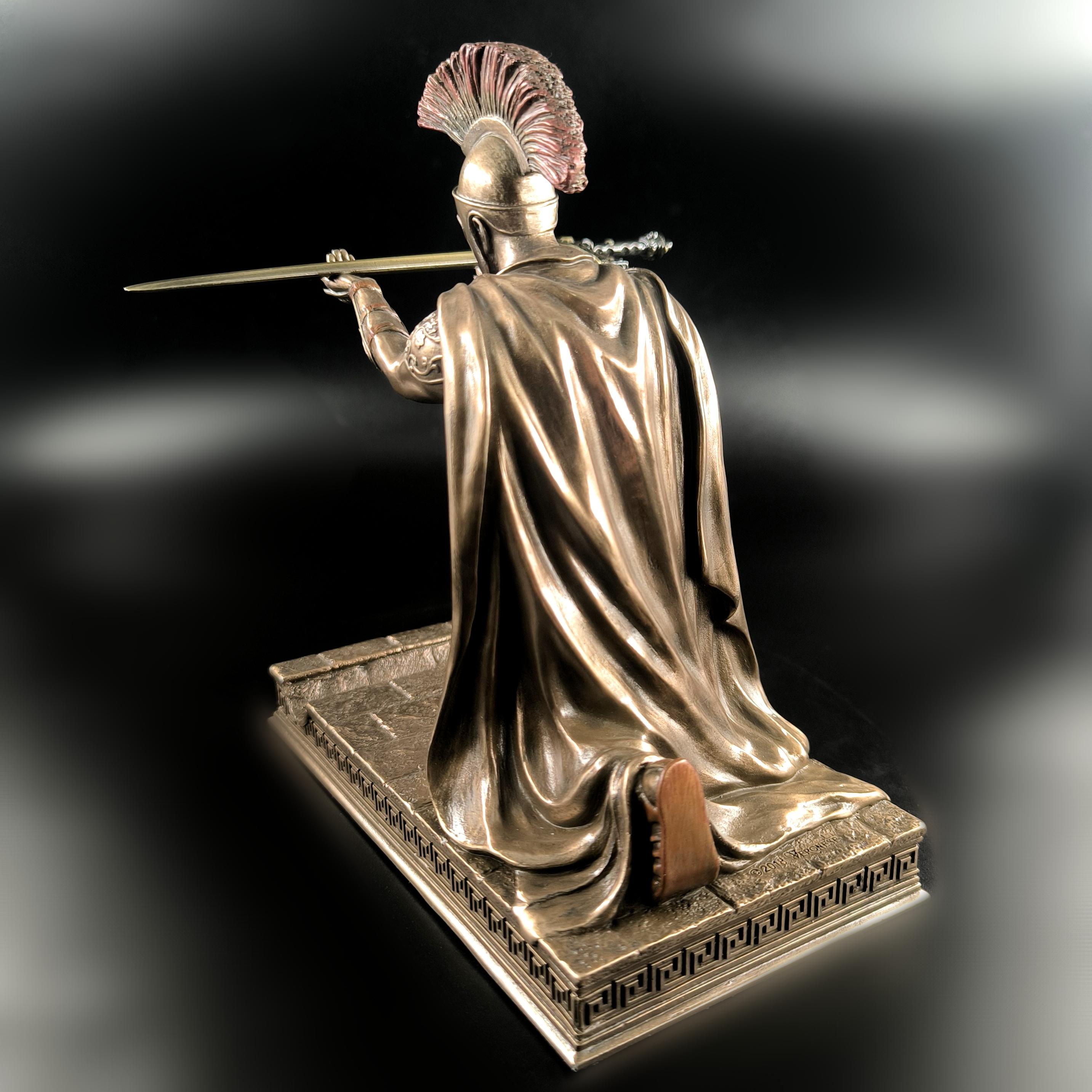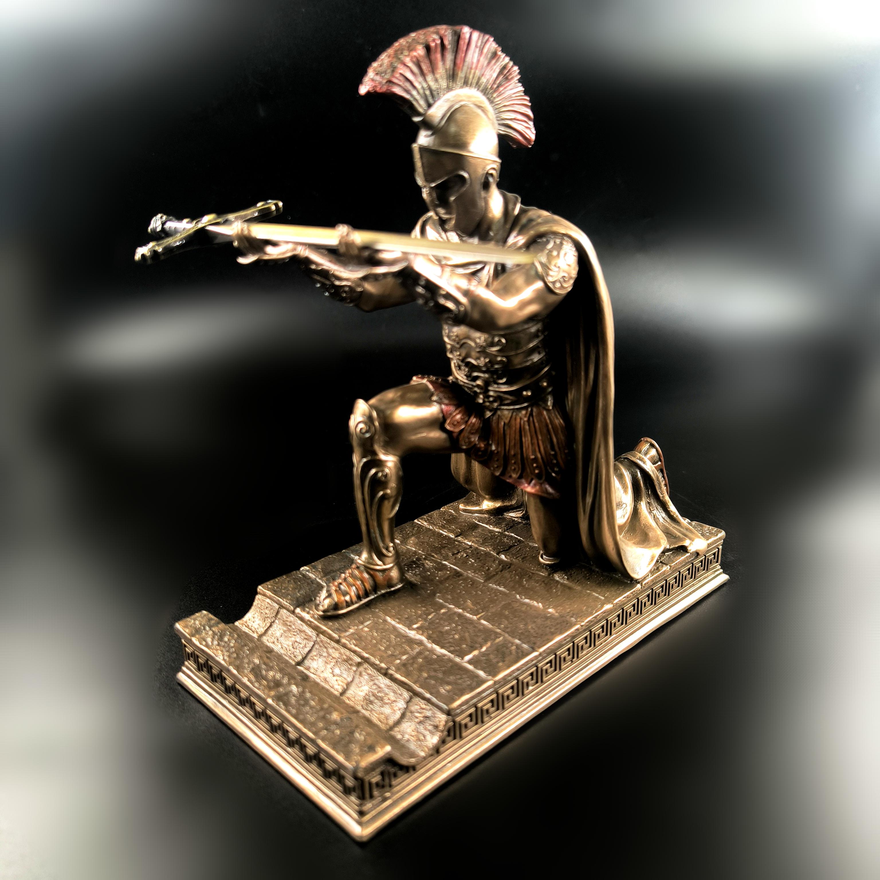Diz çökmüş halde kılıcını iki eliyle ileri uzatan bu Veronese imzalı Spartan savaşçısı heykeli, mutlak disiplin, bağlılık ve savaş meydanlarındaki sarsılmaz kararlılığın güçlü bir sembolüdür. Antik Sparta’nın efsanevi savaşçı ruhunu yansıtan figür, detaylı zırh işlemeleri, muhteşem miğfer tasarımı ve dramatik duruşuyla izleyenlerde hayranlık uyandıran etkileyici bir kompozisyon sunar. Savaşın sessizliği içinde verilen onur yemini sahnesini hatırlatan bu duruş, gücün yalnızca saldırıda değil, aynı zamanda sarsılmaz bir iradede bulunduğunu hatırlatır. Mermer ve kemik tozu karışımlı özel bir madde ile şekillendirilmiş olup usta sanatçılar tarafından itinayla el boyaması yapılmıştır. Çok detaylı ve gerçekçi ayrıntılara sahip olan bu eser, dünya çapında işçilik kalitesi ile bilinen Veronese markasının damgasını taşımaktadır.