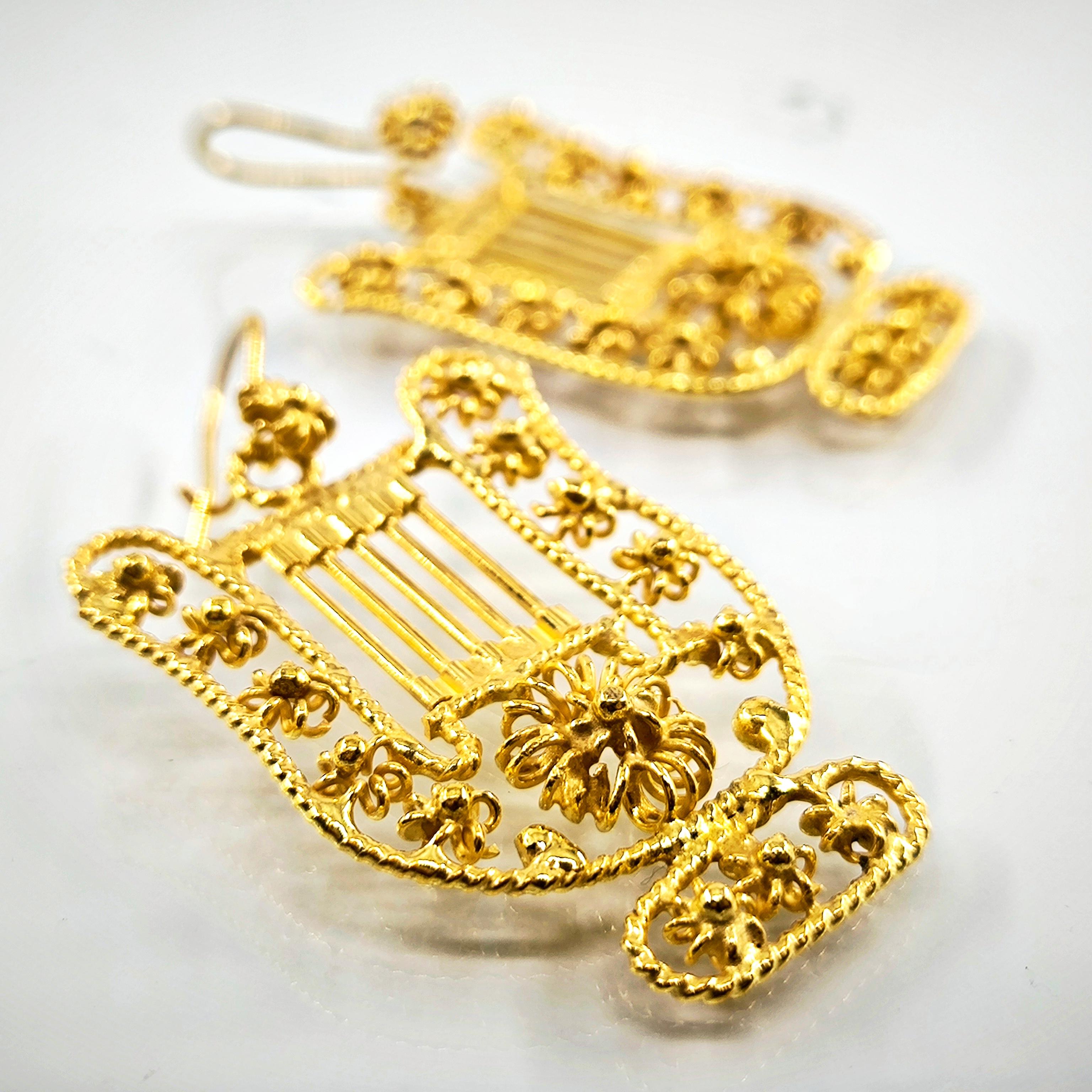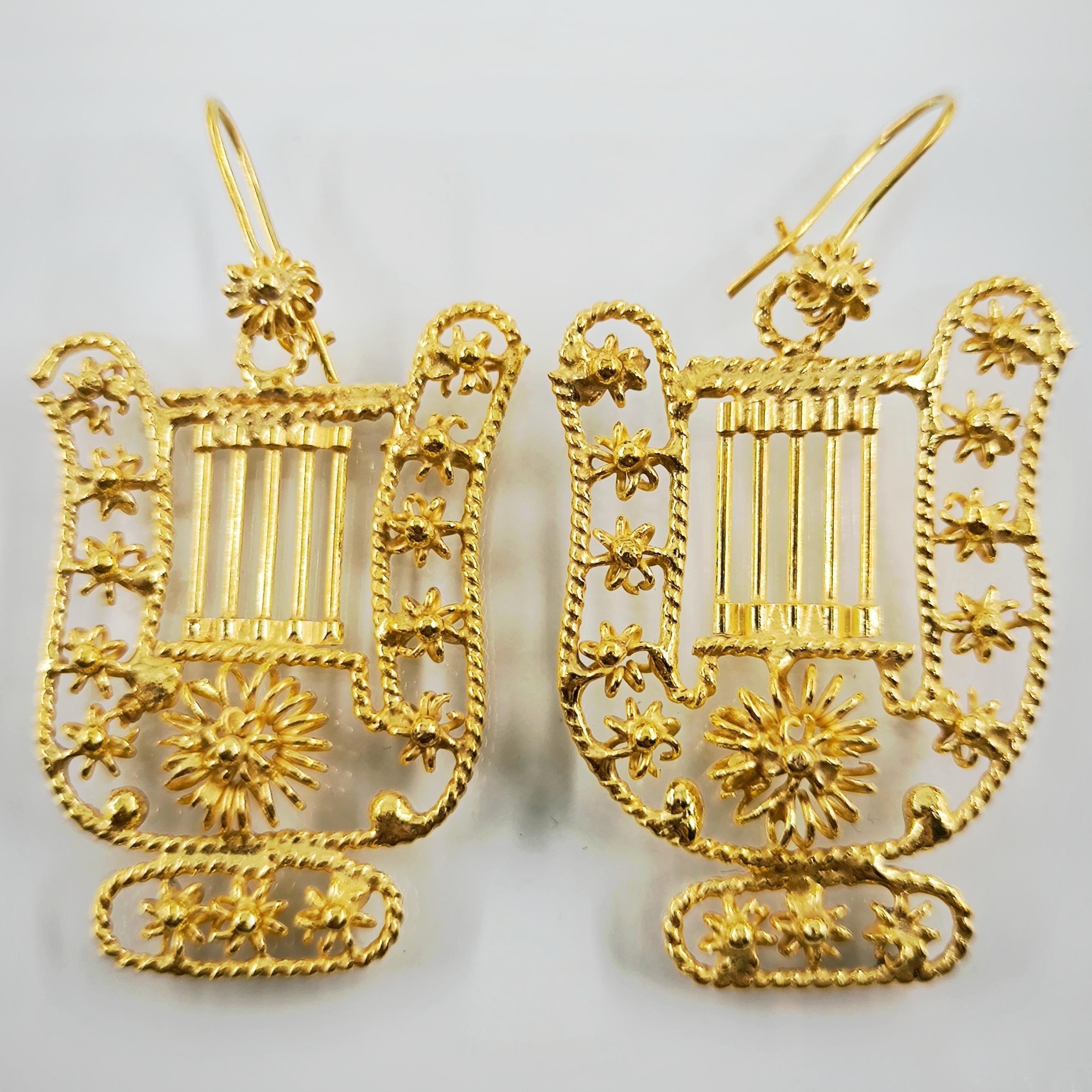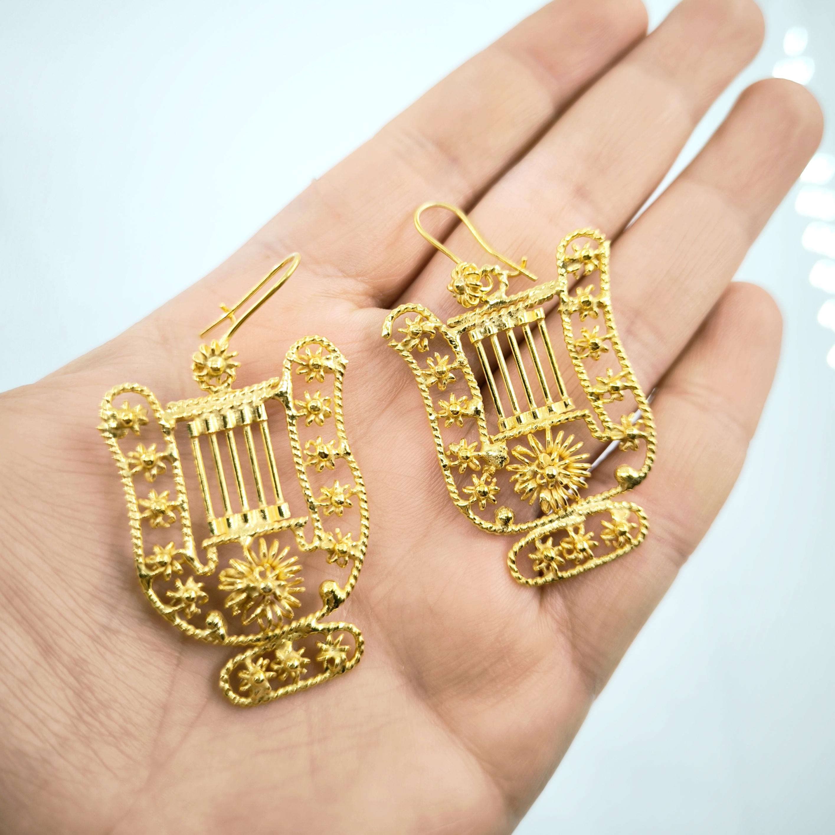 Komple telkari işçiliği, tamamı handmade, Antik medeniyetlerde kullanılan çalgıların en bilinen ve en popüleri olan Lir! bir diğer adı ile Arp! 925 Ayar Gümüş, üzeri altın kaplama Lir küpelerimiz!