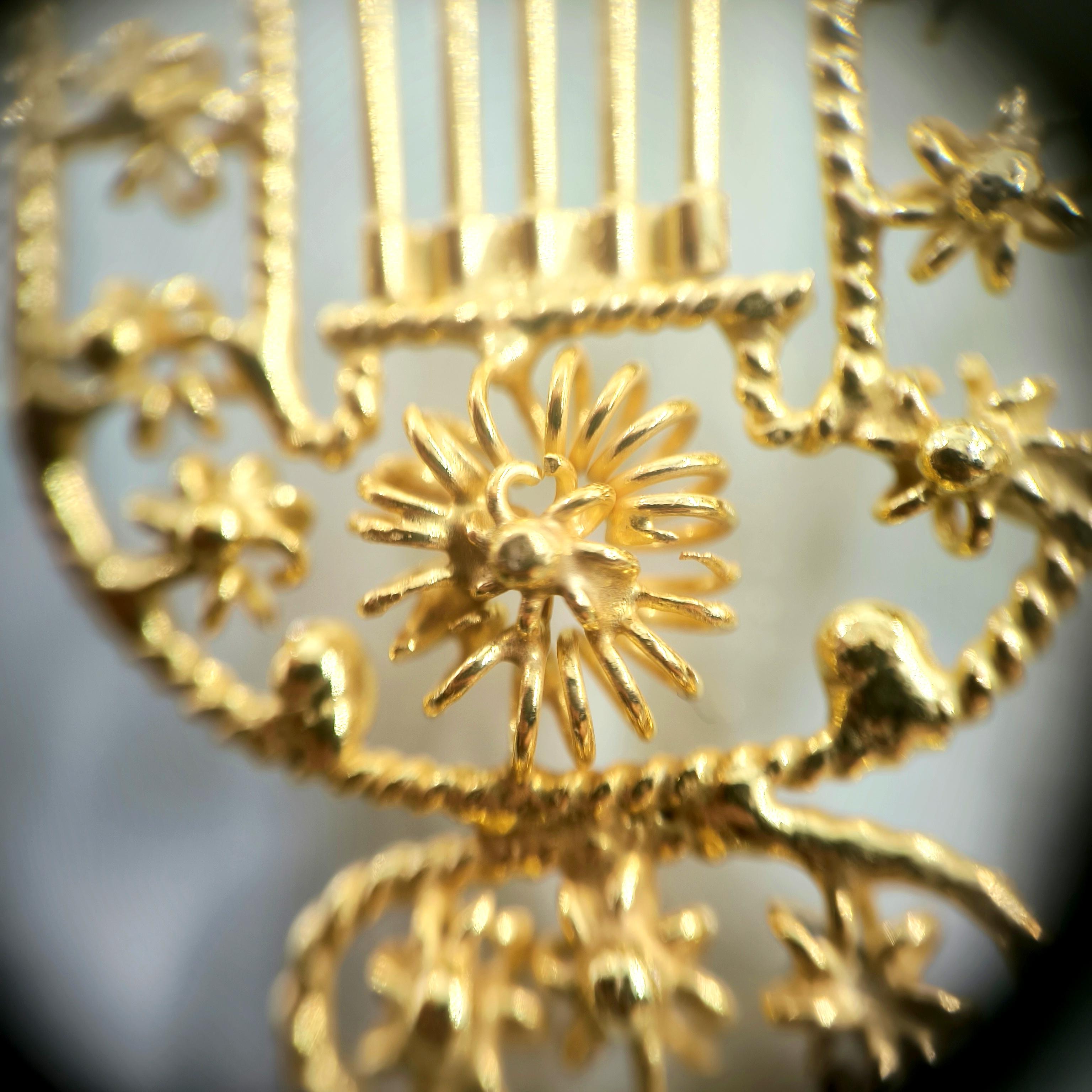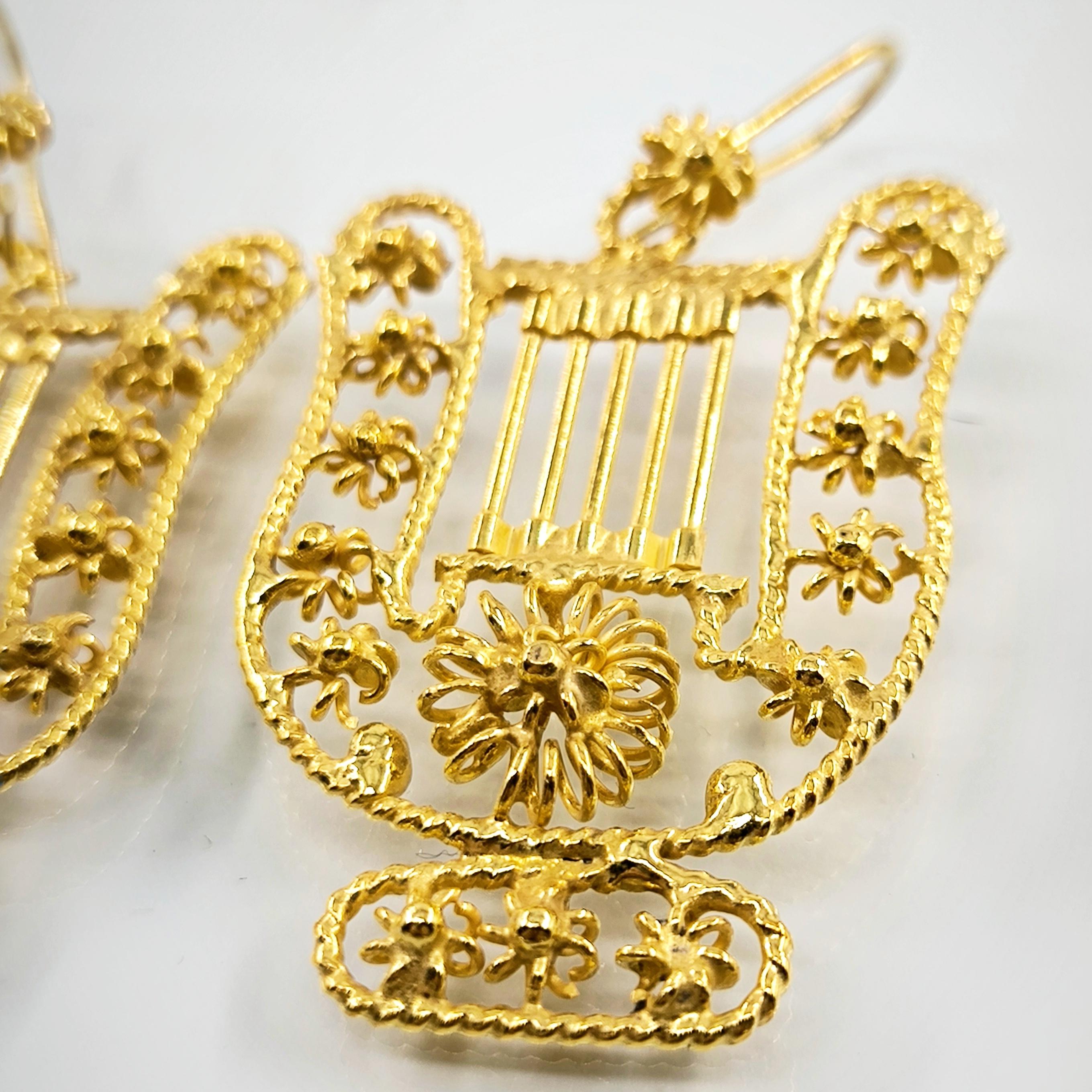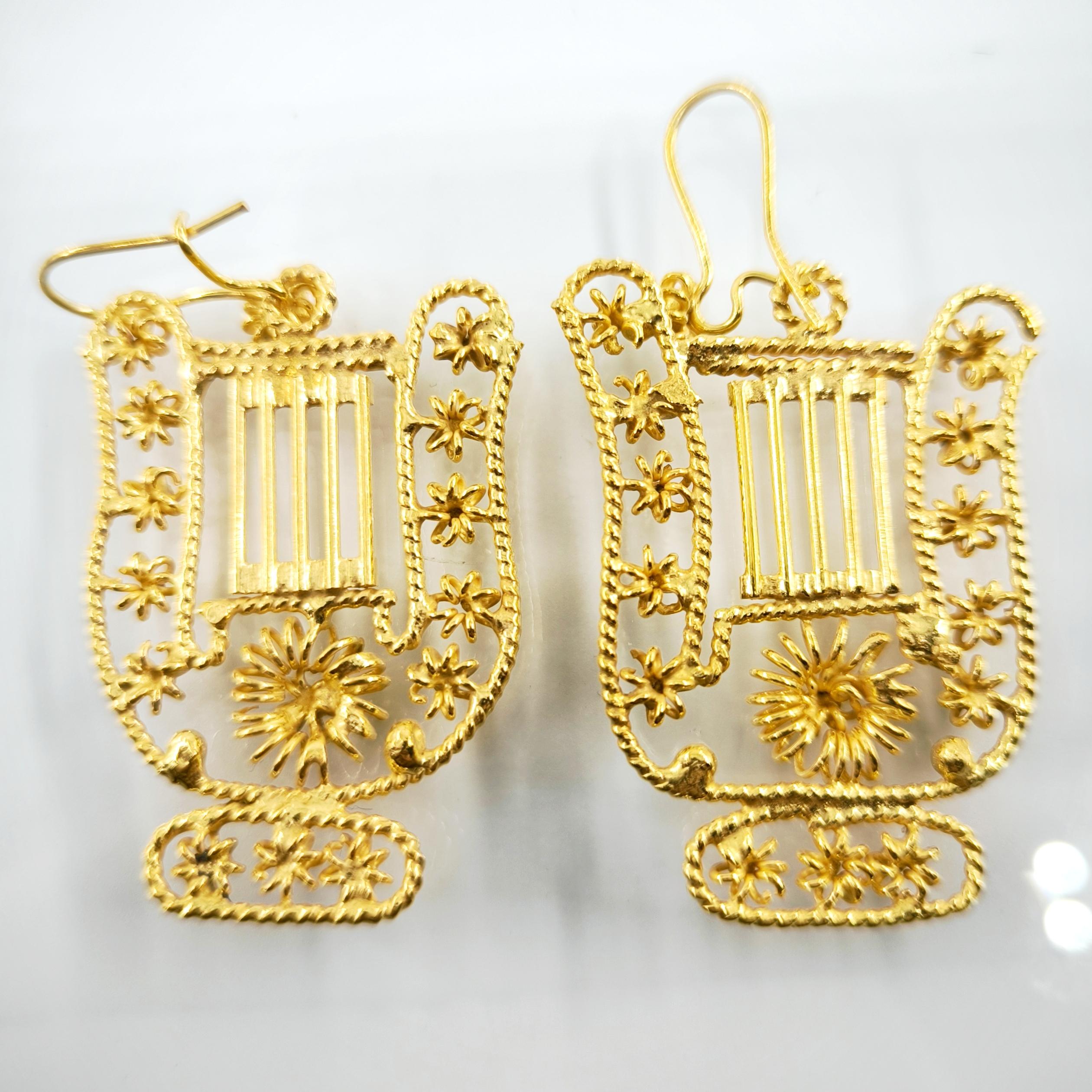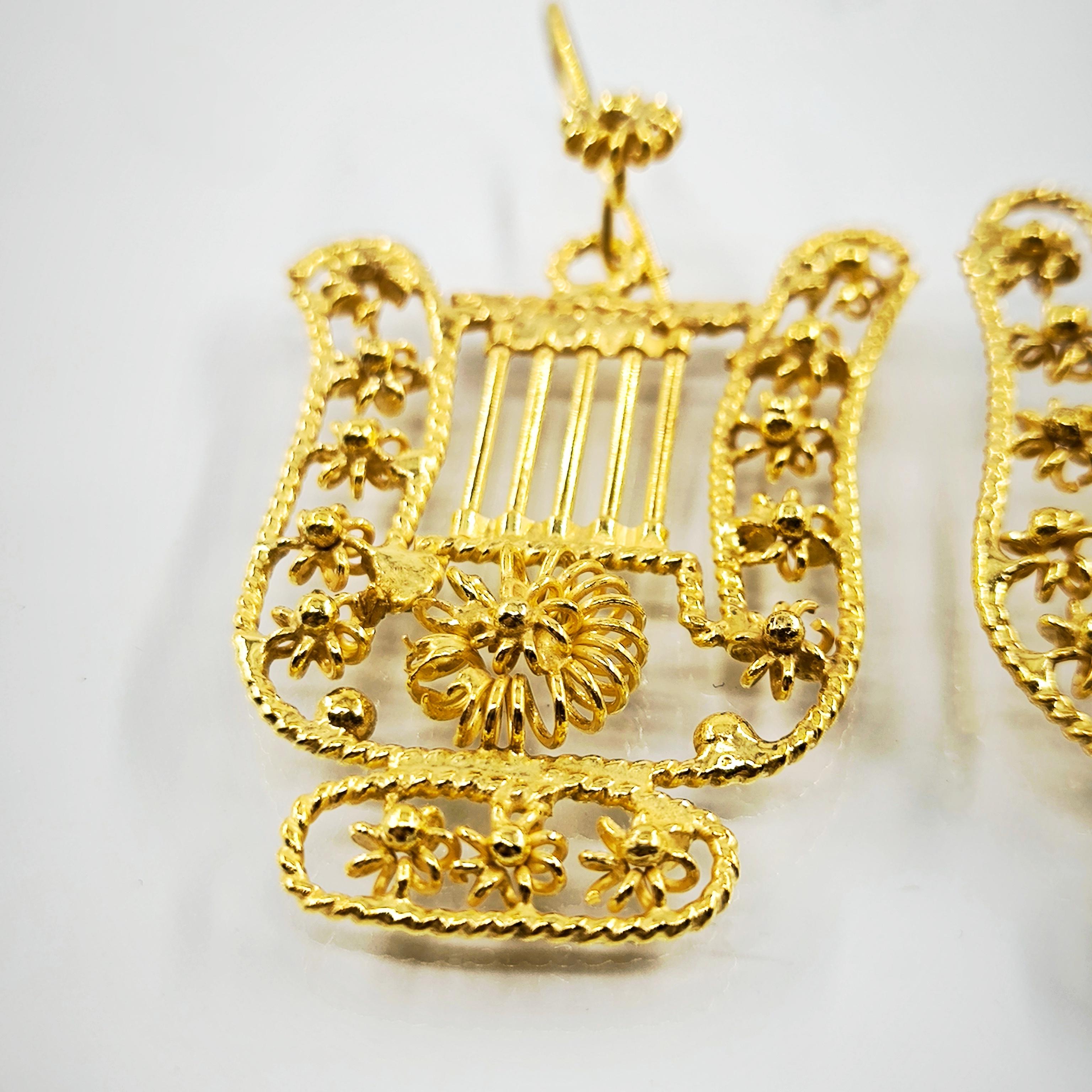 Komple telkari işçiliği, tamamı handmade, Antik medeniyetlerde kullanılan çalgıların en bilinen ve en popüleri olan Lir! bir diğer adı ile Arp! 925 Ayar Gümüş, üzeri altın kaplama Lir küpelerimiz!