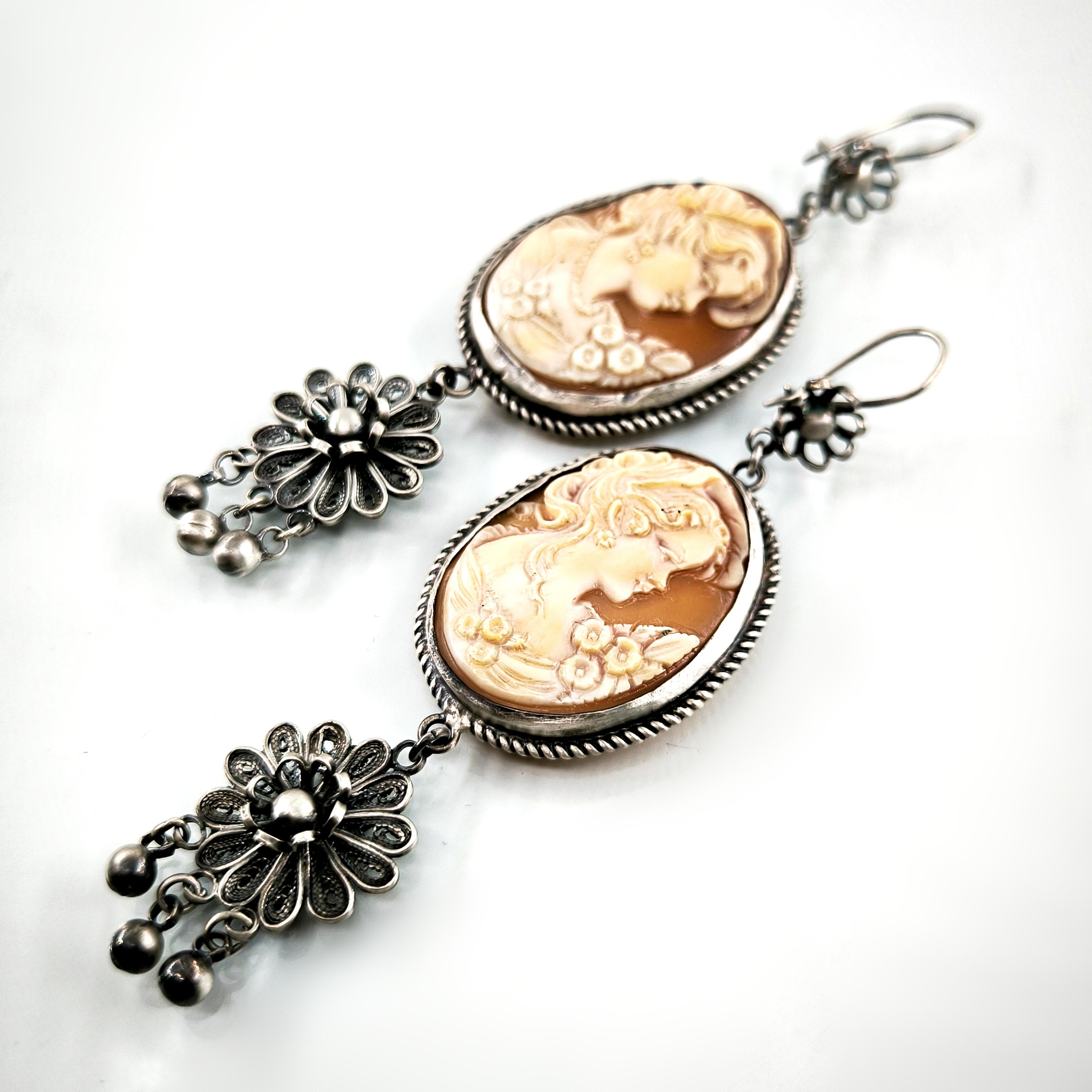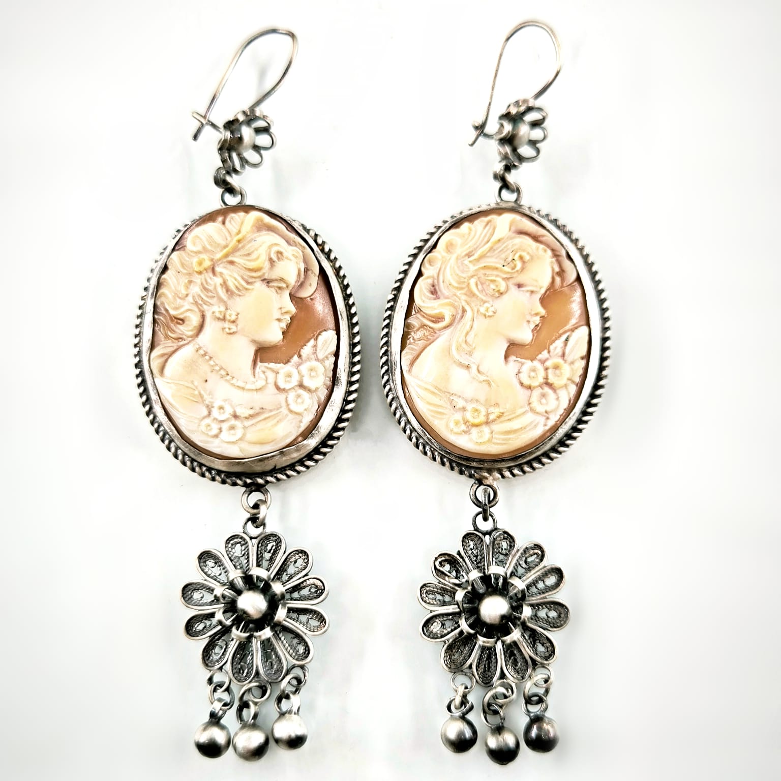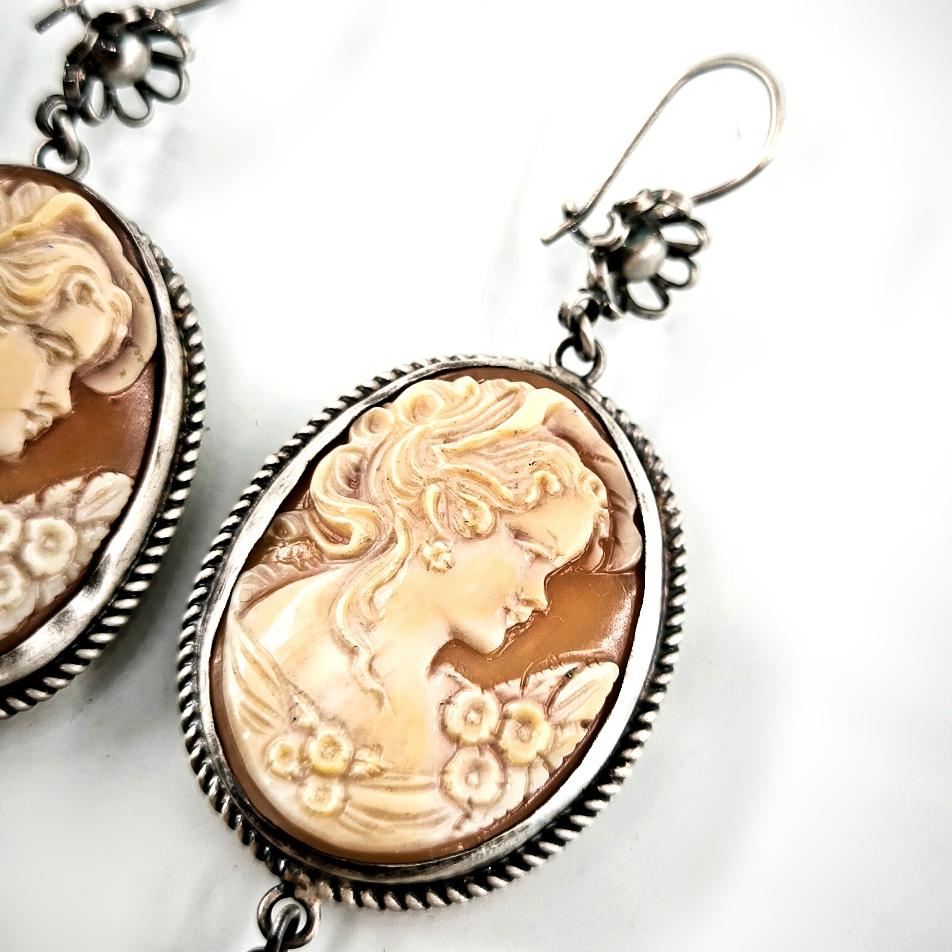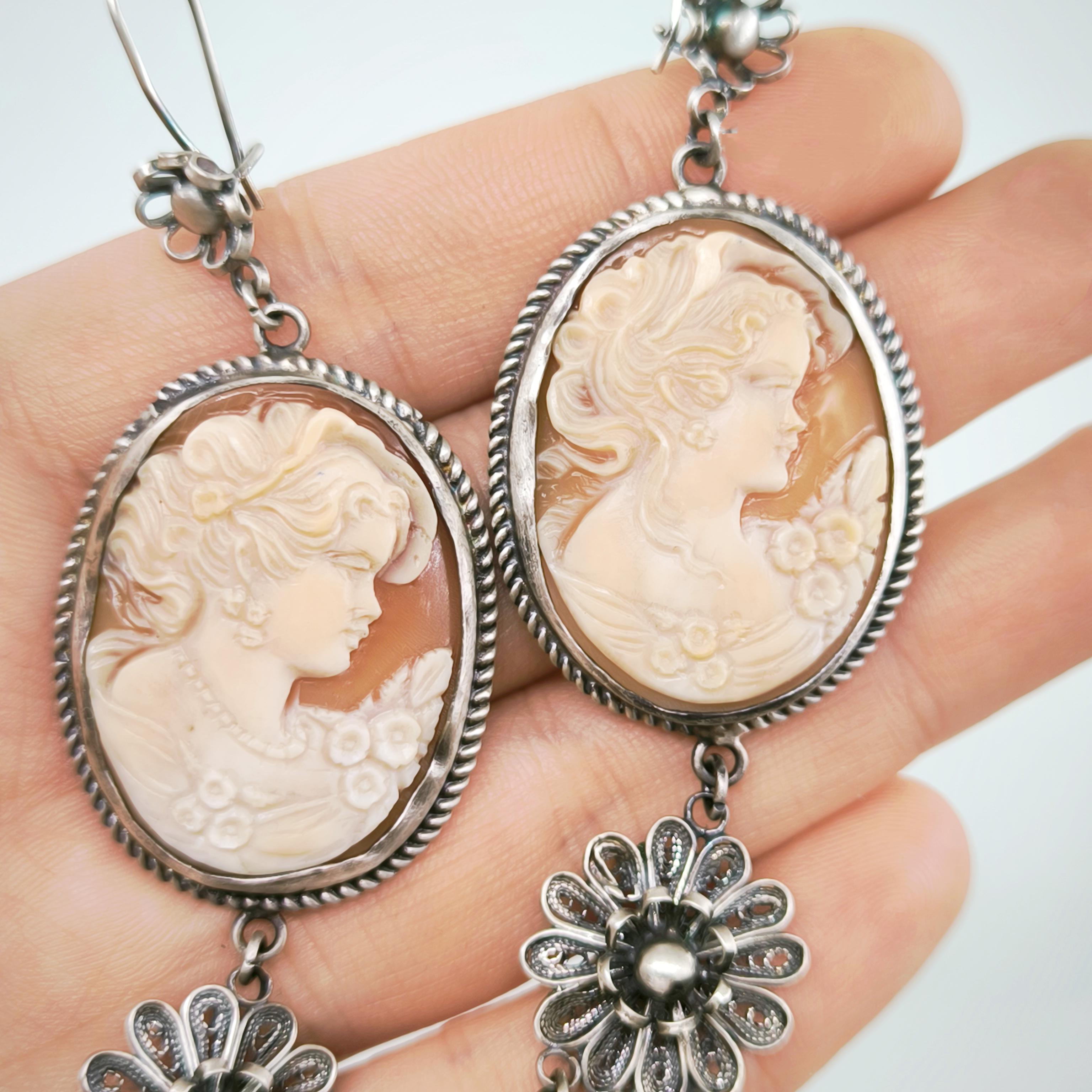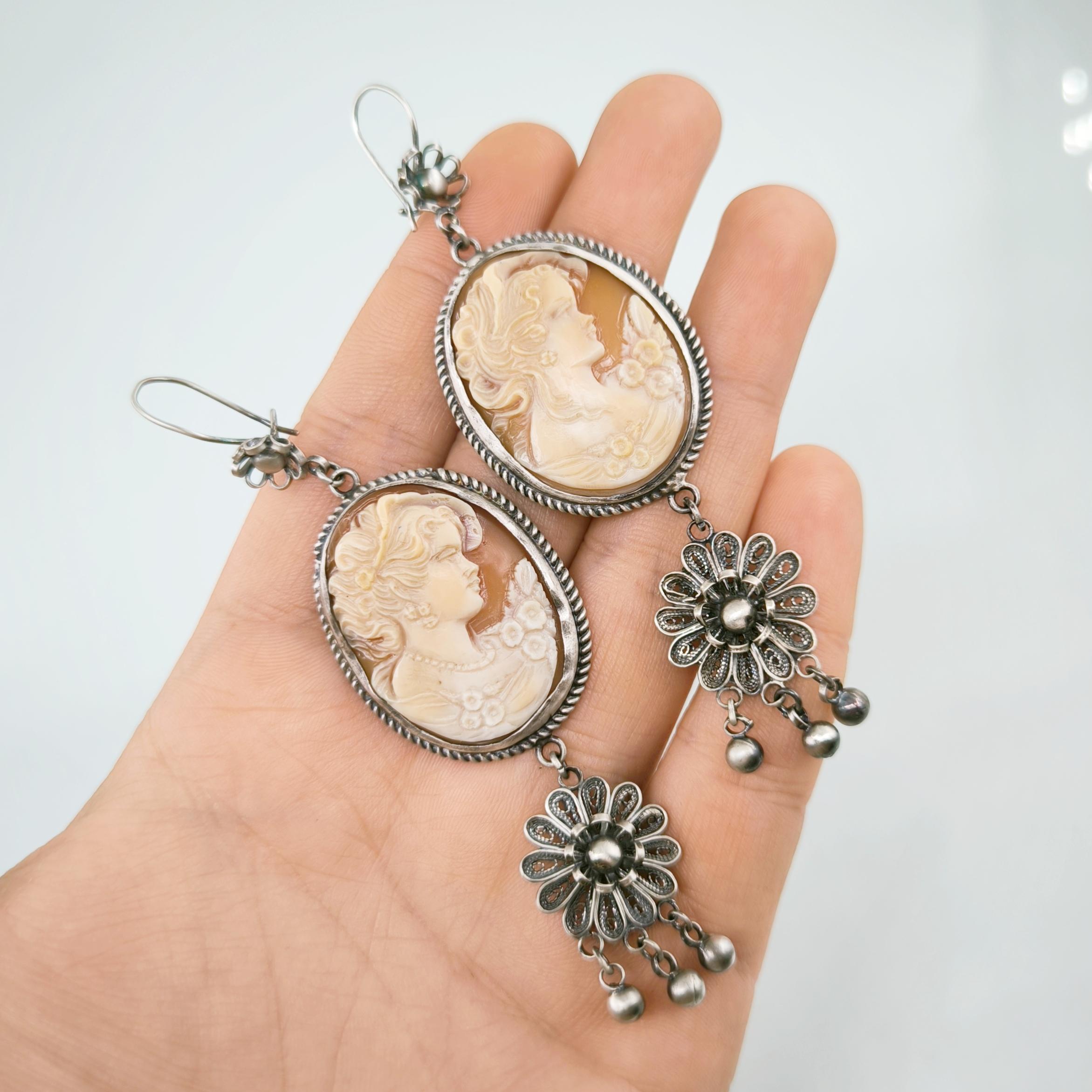Antik zarafetin modern bir yorumu… 🌿 Bu küpelerde, el işçiliğiyle kabartılmış klasik kadın cameo figürleri, gümüş çerçevede telkari motiflerle buluşuyor. Aşağıya doğru sallanan çiçek formundaki işlemeler ve minik gümüş toplar, hareket ettikçe ışıkla oynayarak parçaya nostaljik bir ihtişam katıyor. Hem sanatsal koleksiyon değeri hem de zarif bir kullanım sunan bu küpeler, geçmişin ruhunu günümüze taşıyor.