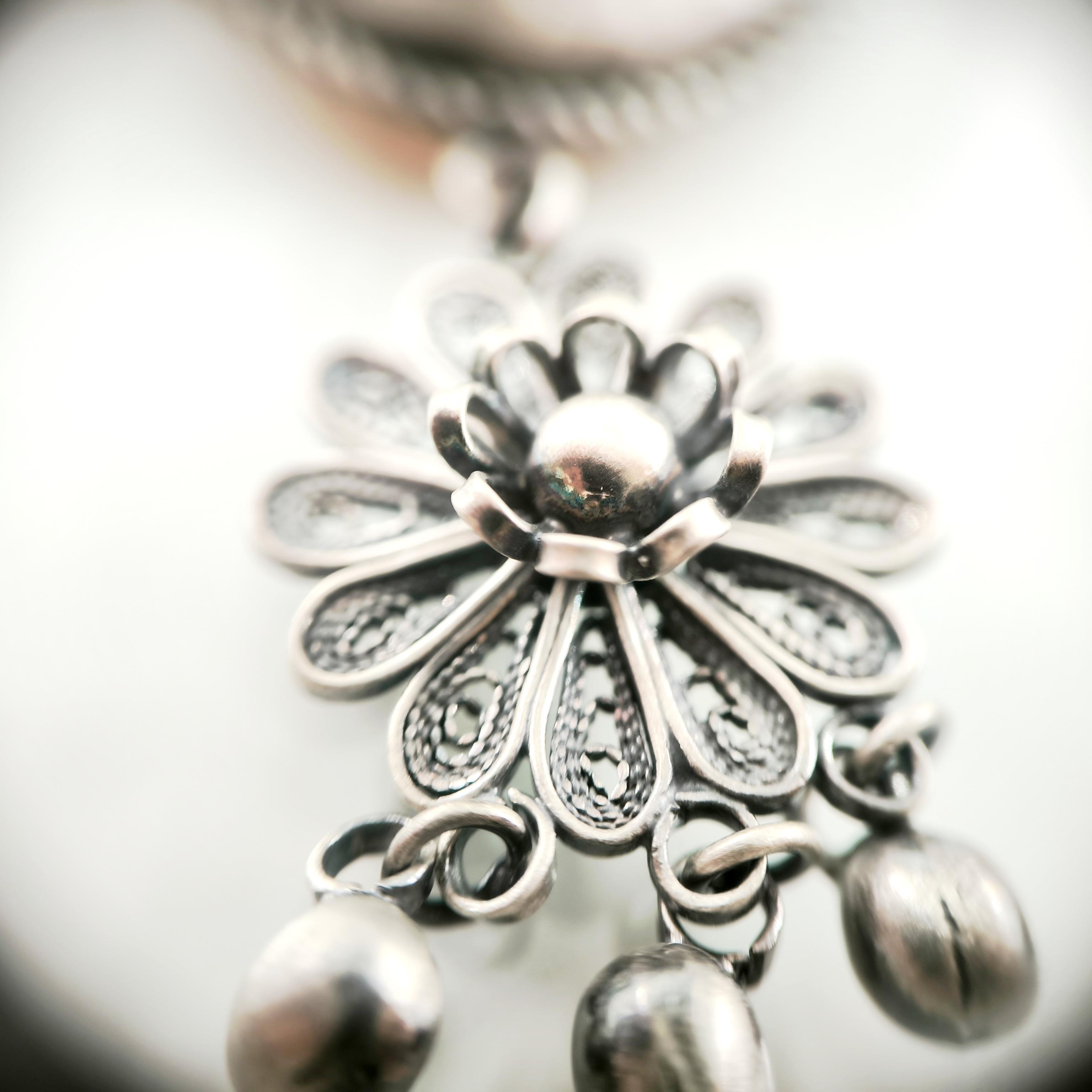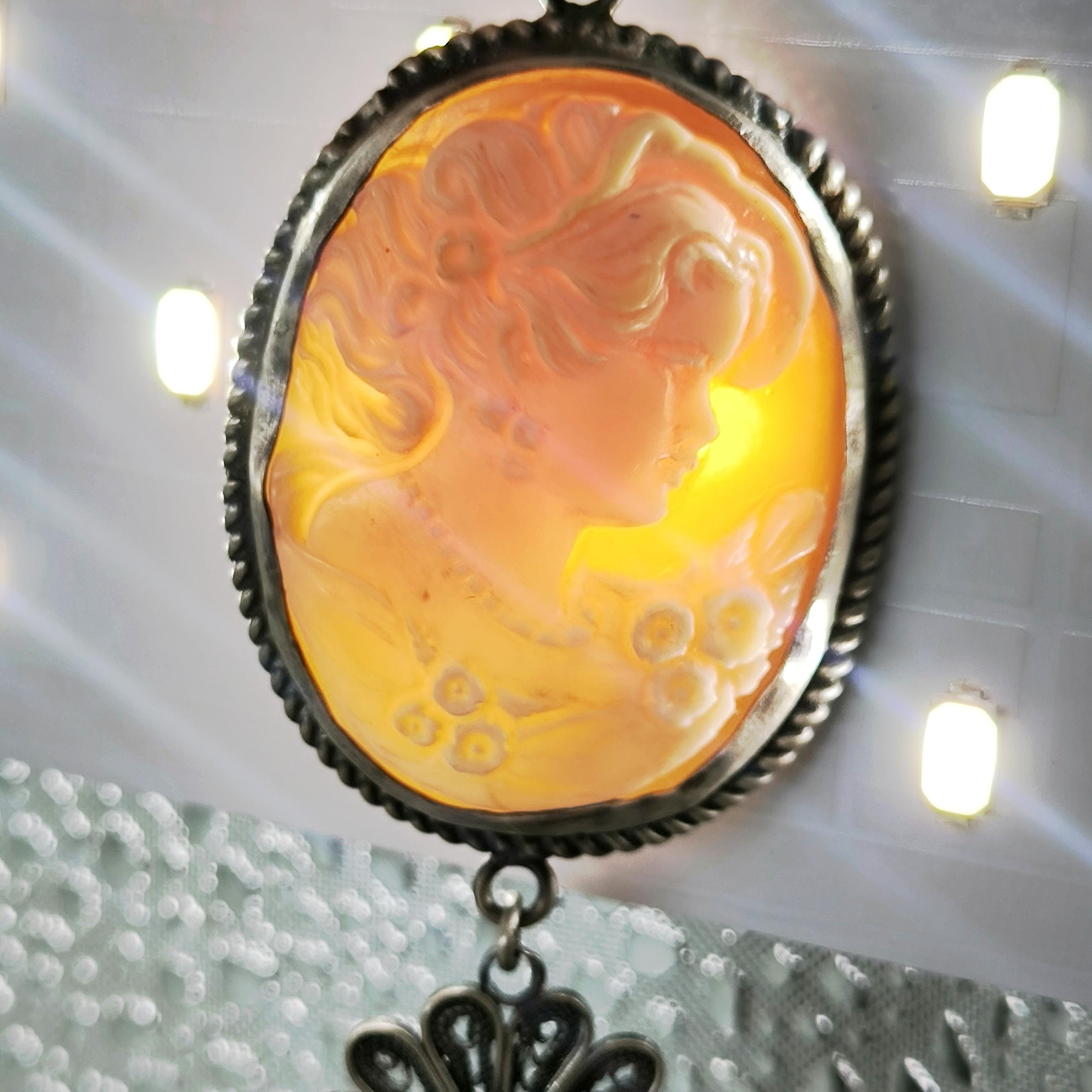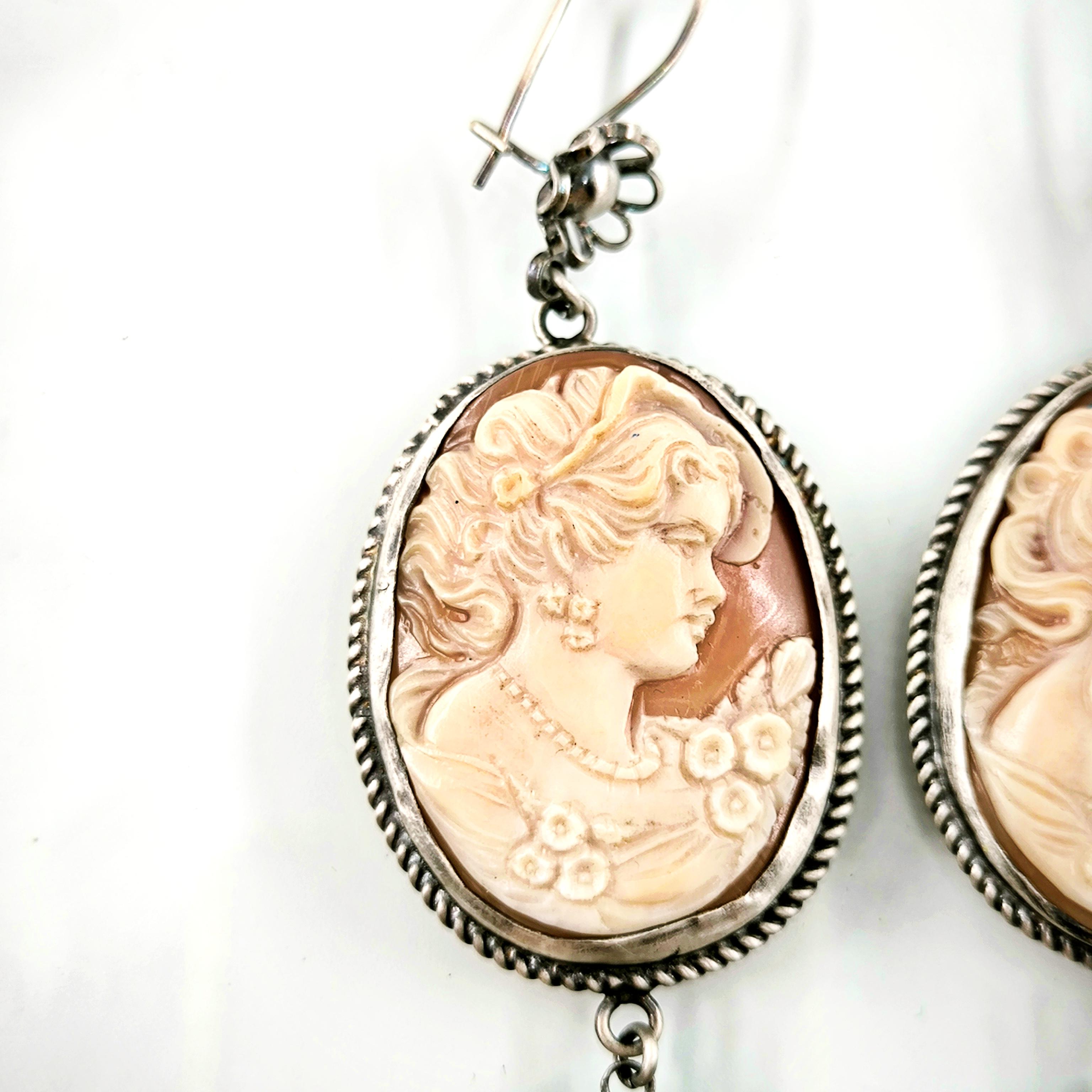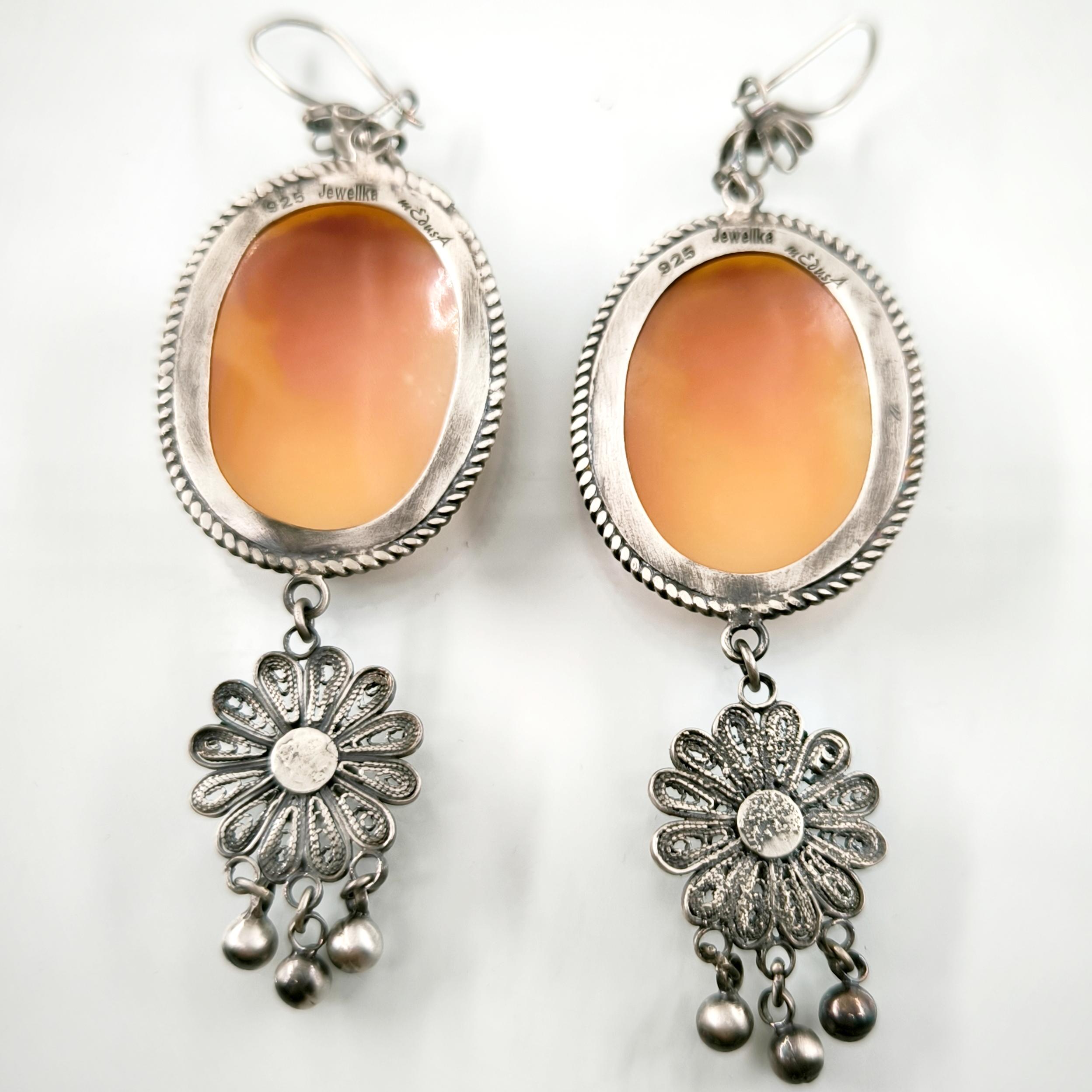 Antik zarafetin modern bir yorumu… 🌿 Bu küpelerde, el işçiliğiyle kabartılmış klasik kadın cameo figürleri, gümüş çerçevede telkari motiflerle buluşuyor. Aşağıya doğru sallanan çiçek formundaki işlemeler ve minik gümüş toplar, hareket ettikçe ışıkla oynayarak parçaya nostaljik bir ihtişam katıyor. Hem sanatsal koleksiyon değeri hem de zarif bir kullanım sunan bu küpeler, geçmişin ruhunu günümüze taşıyor.