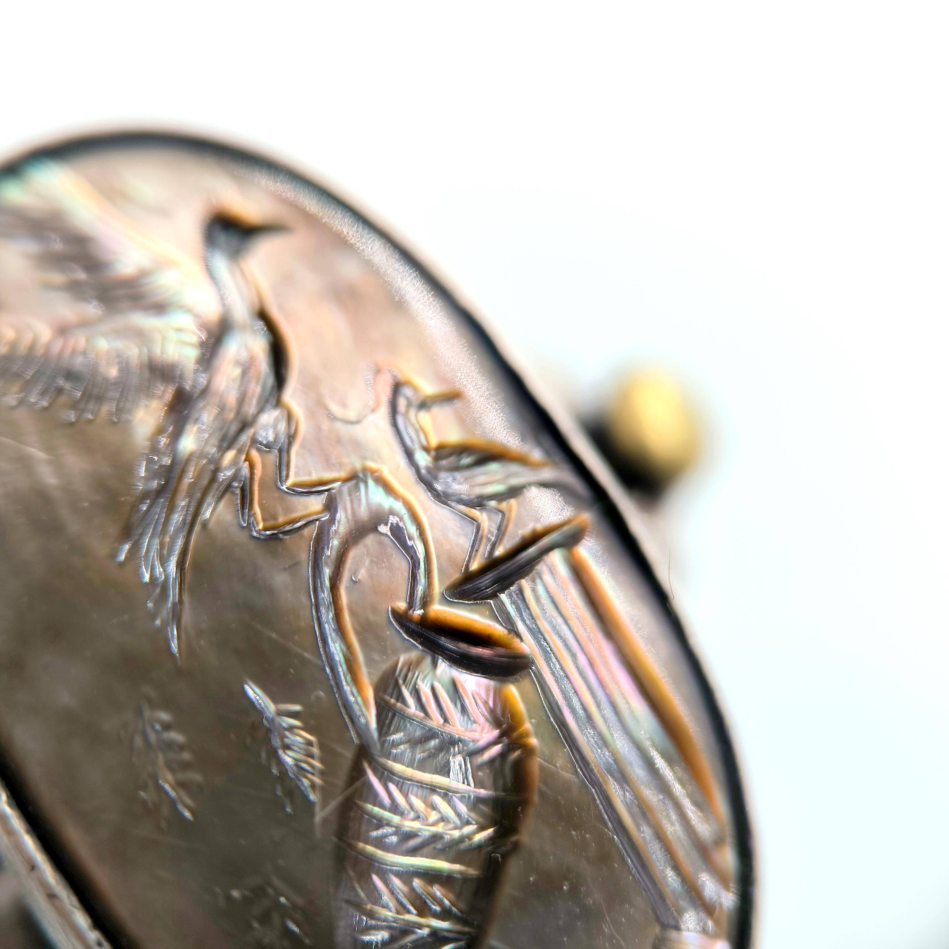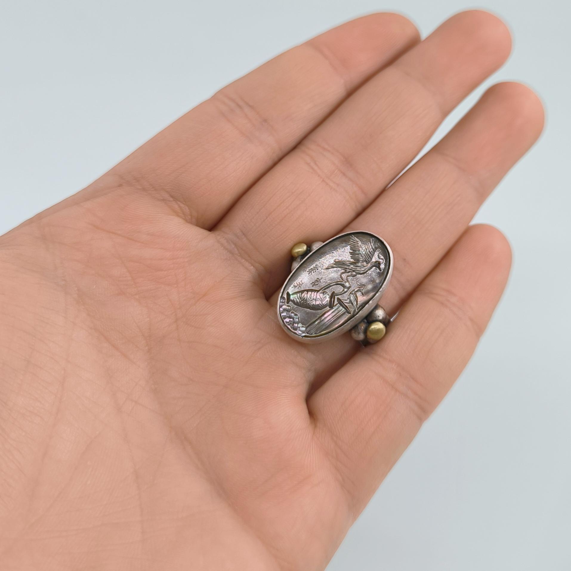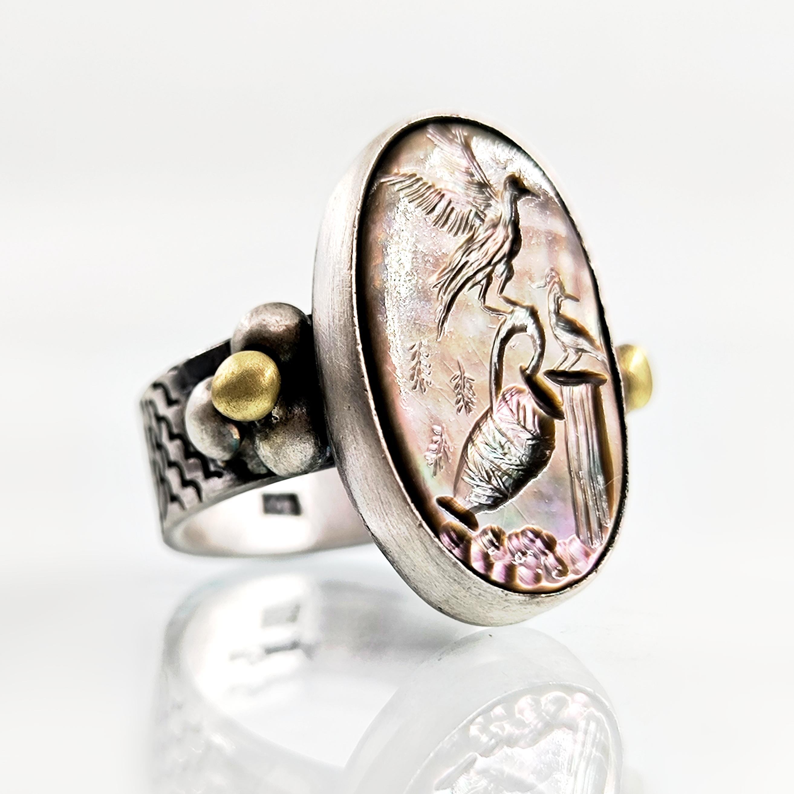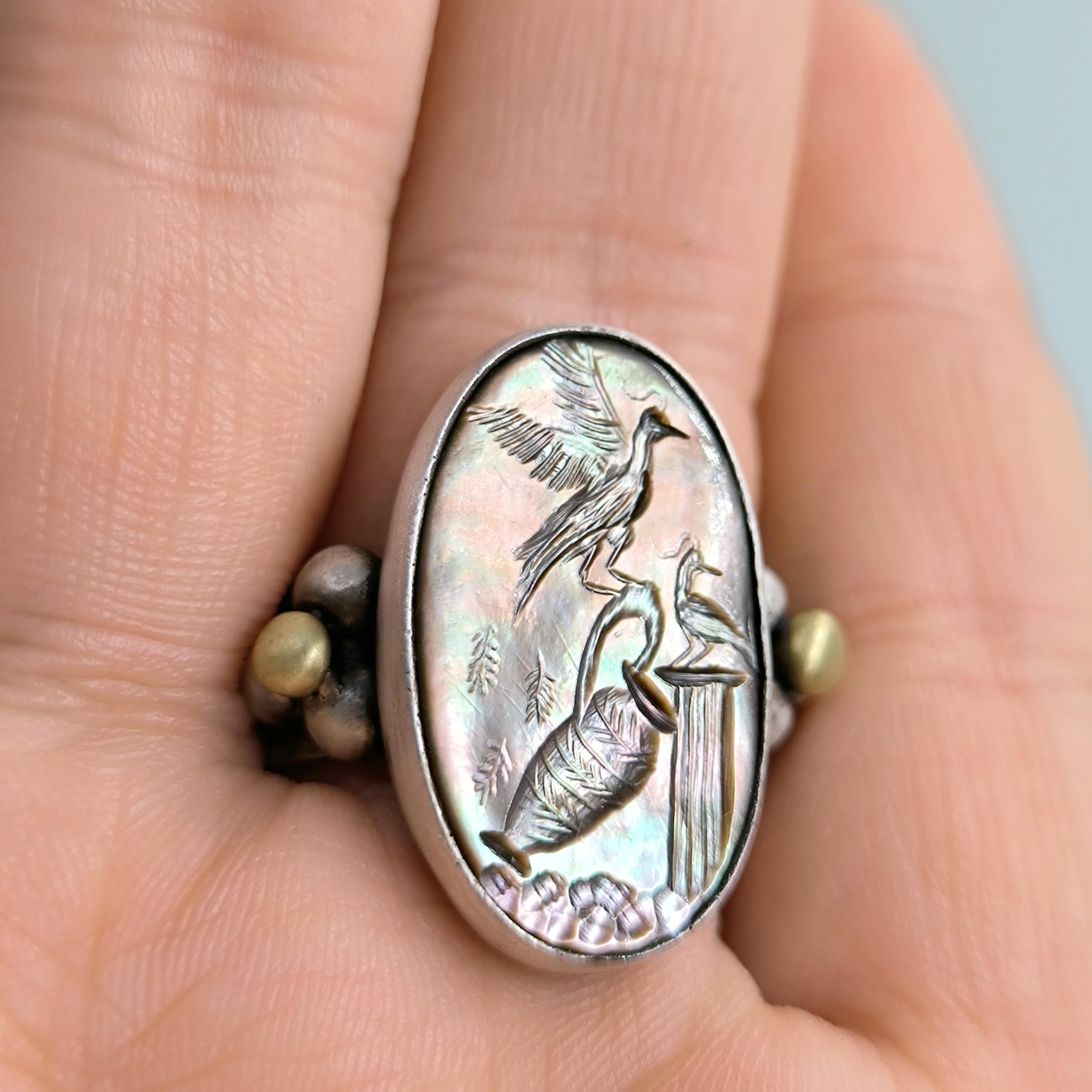 Doğanın zarafetini ve özgürlüğün ruhunu taşıyan bu eşsiz yüzük, sedef taş üzerine oyulmuş kuş figürlü intaglio çalışmasıyla sanatın zamansız büyüsünü yansıtır. Kompozisyonda, antik bir sütunun ve küpün üzerine konmuş kuş figürü, hem tarihî hem de sembolik bir anlam taşır. İnci gibi parlayan sedef, her açıdan farklı renk oyunlarıyla ışığı yakalarken; antik esintili 925 ayar gümüş gövde, bronz güverse detayıyla taçlanır.