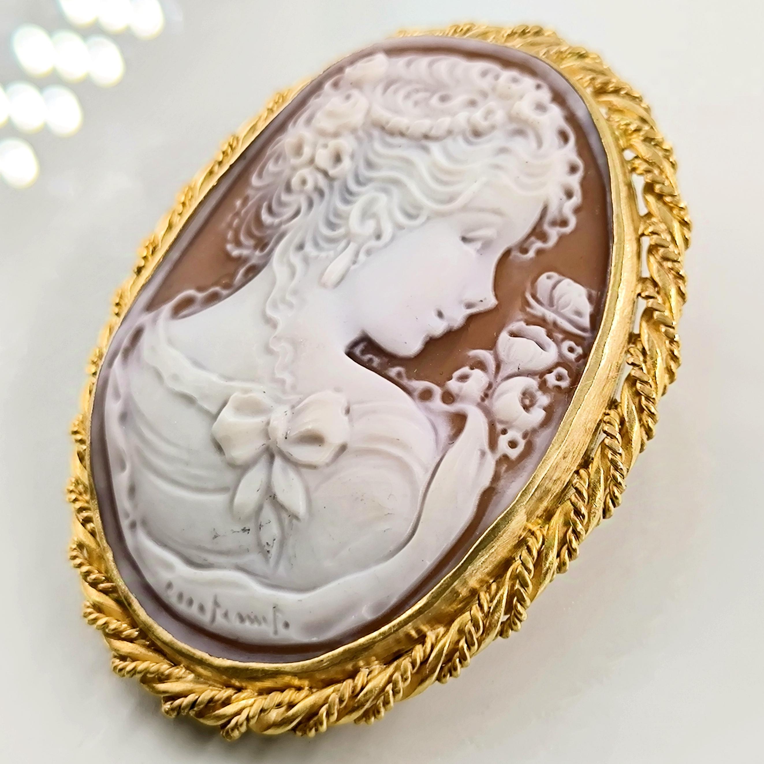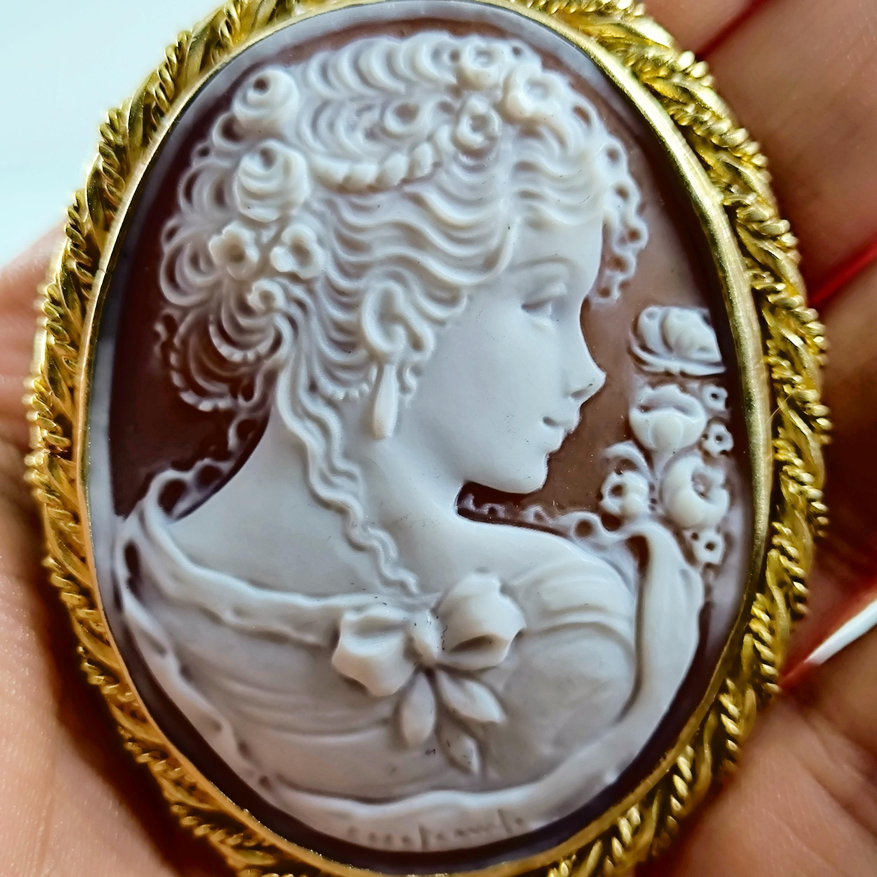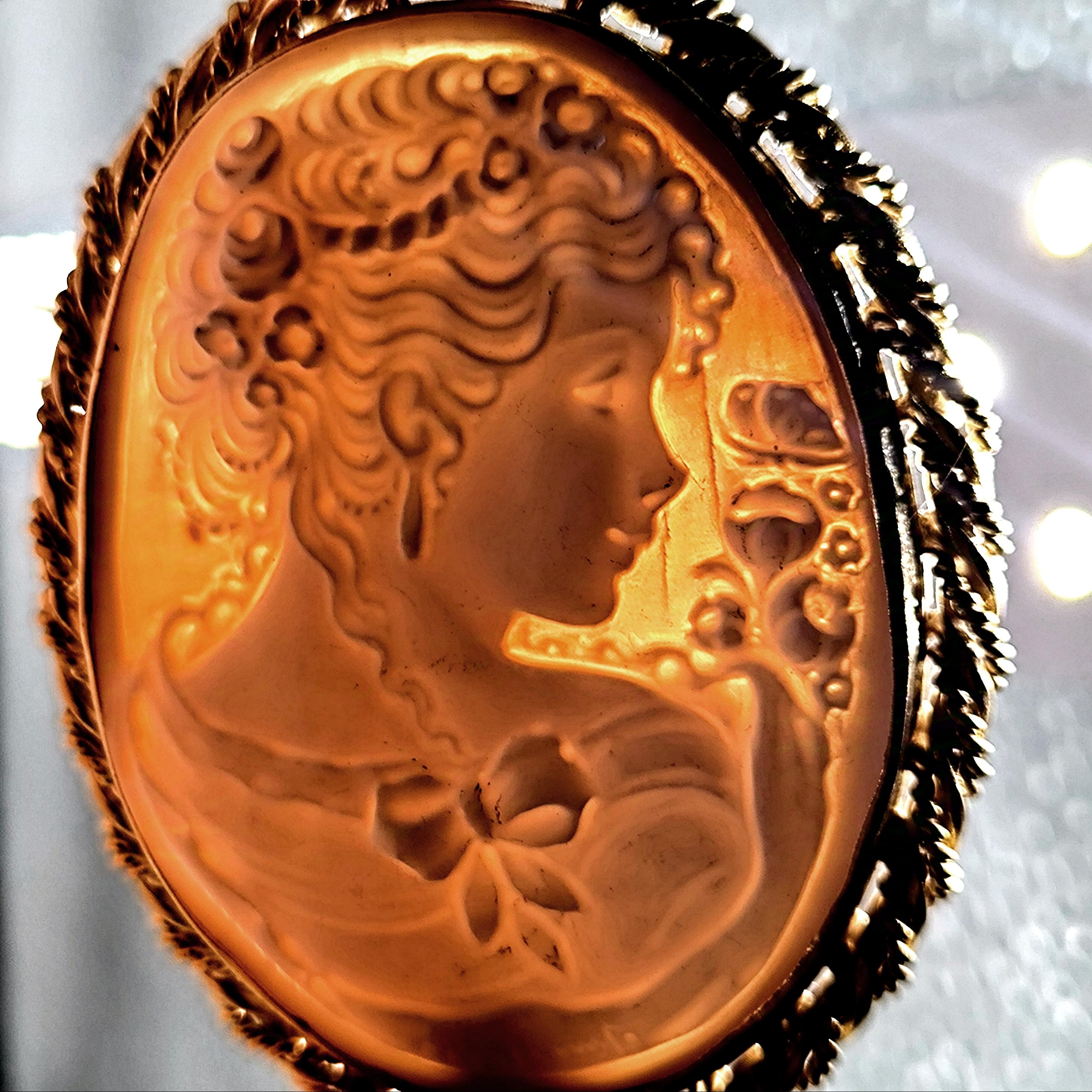 Muhteşem bir mücevher ile yine sizlerleyiz! Harika Cameo mücevher! Deniz kabuğu üzeri el oyma çalışılmış ''Leydi'' tasvirli muazzam bir Avrupa Cameo! Çerçeve tasarımını kendimiz tasarladığımız Tam bir viktoryan stilde Cameo kolyemiz!! Çerçevemiz tamamen 925 ayar gümüş olup üzeri 22k altın kaplamadır.. Cameo'muzun altında sanatçı imzası vardır.
