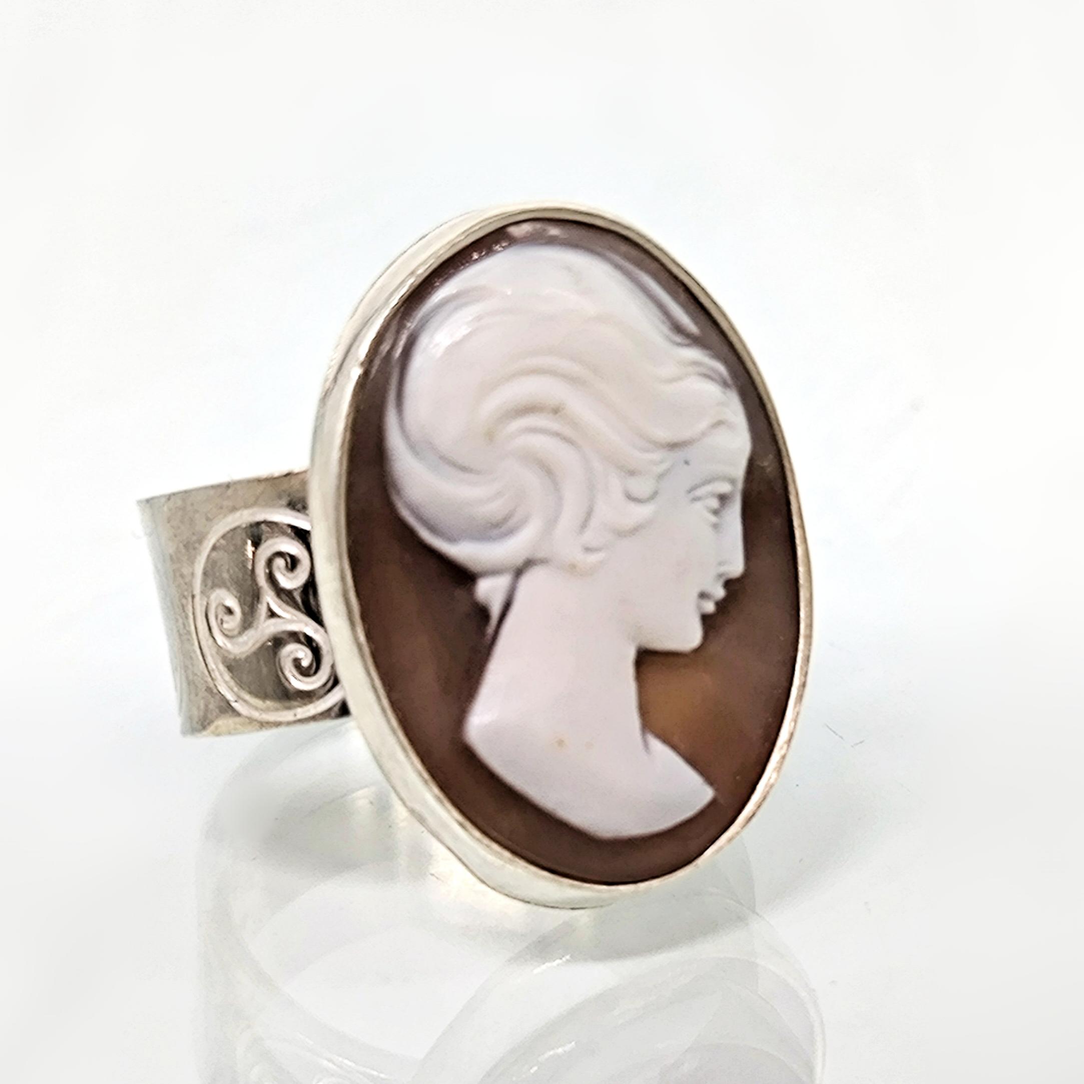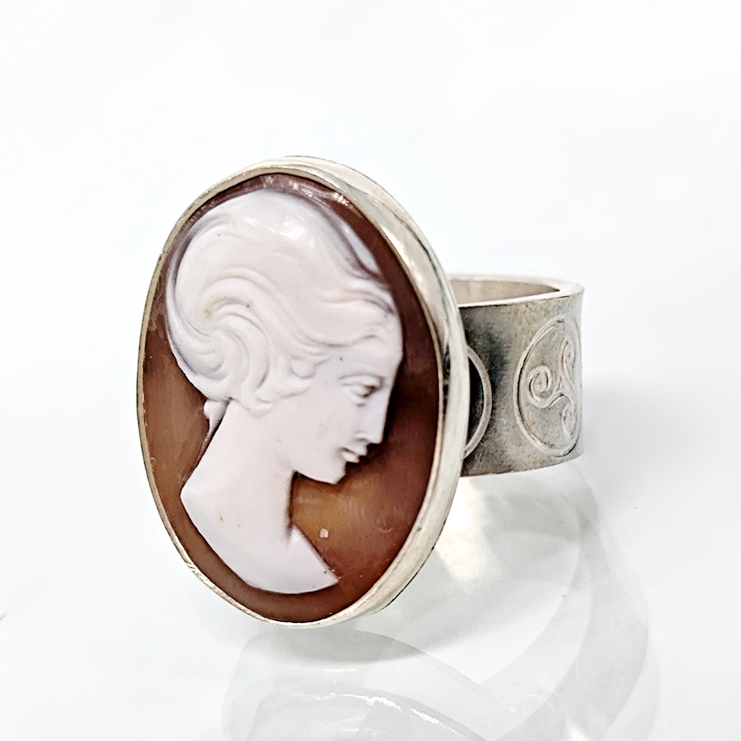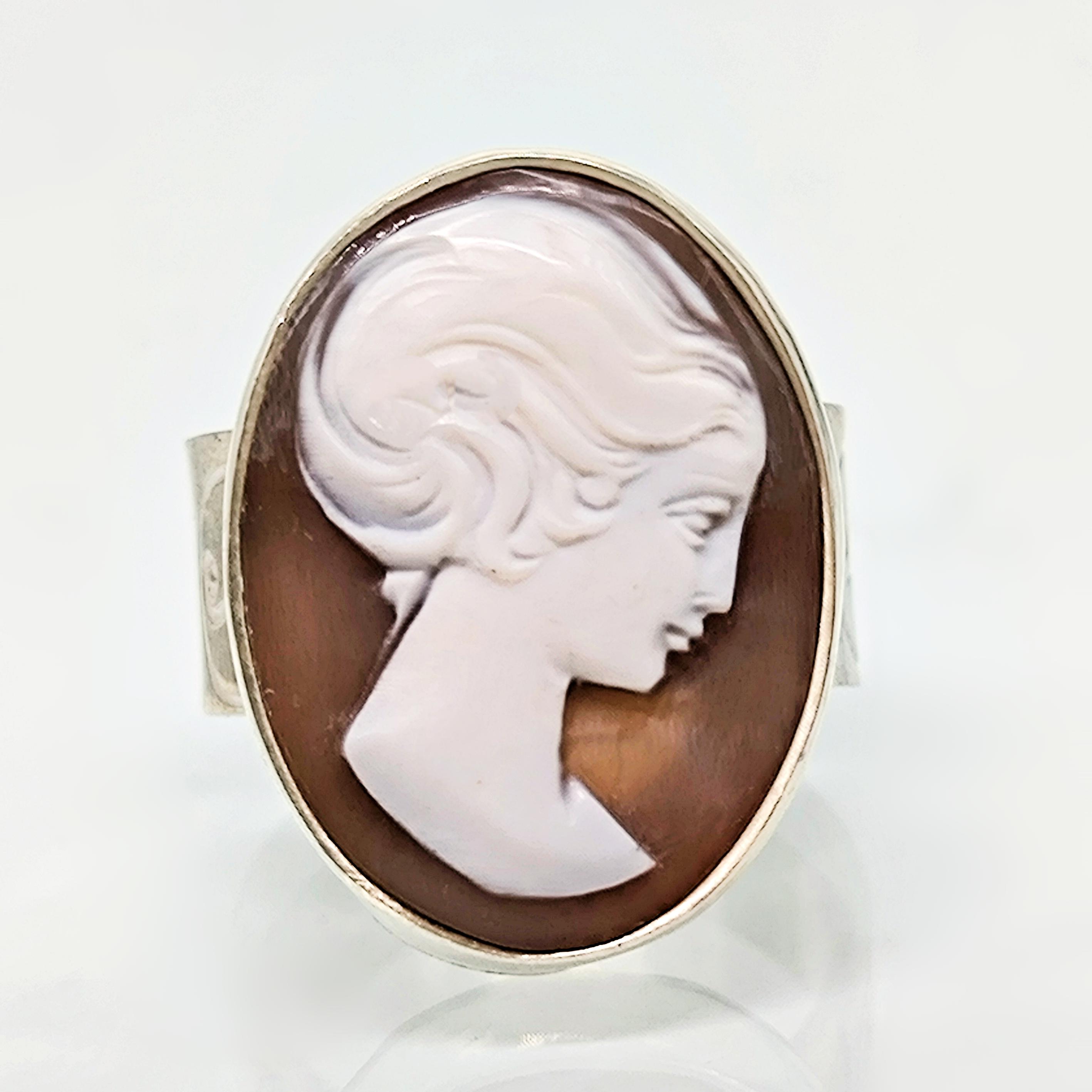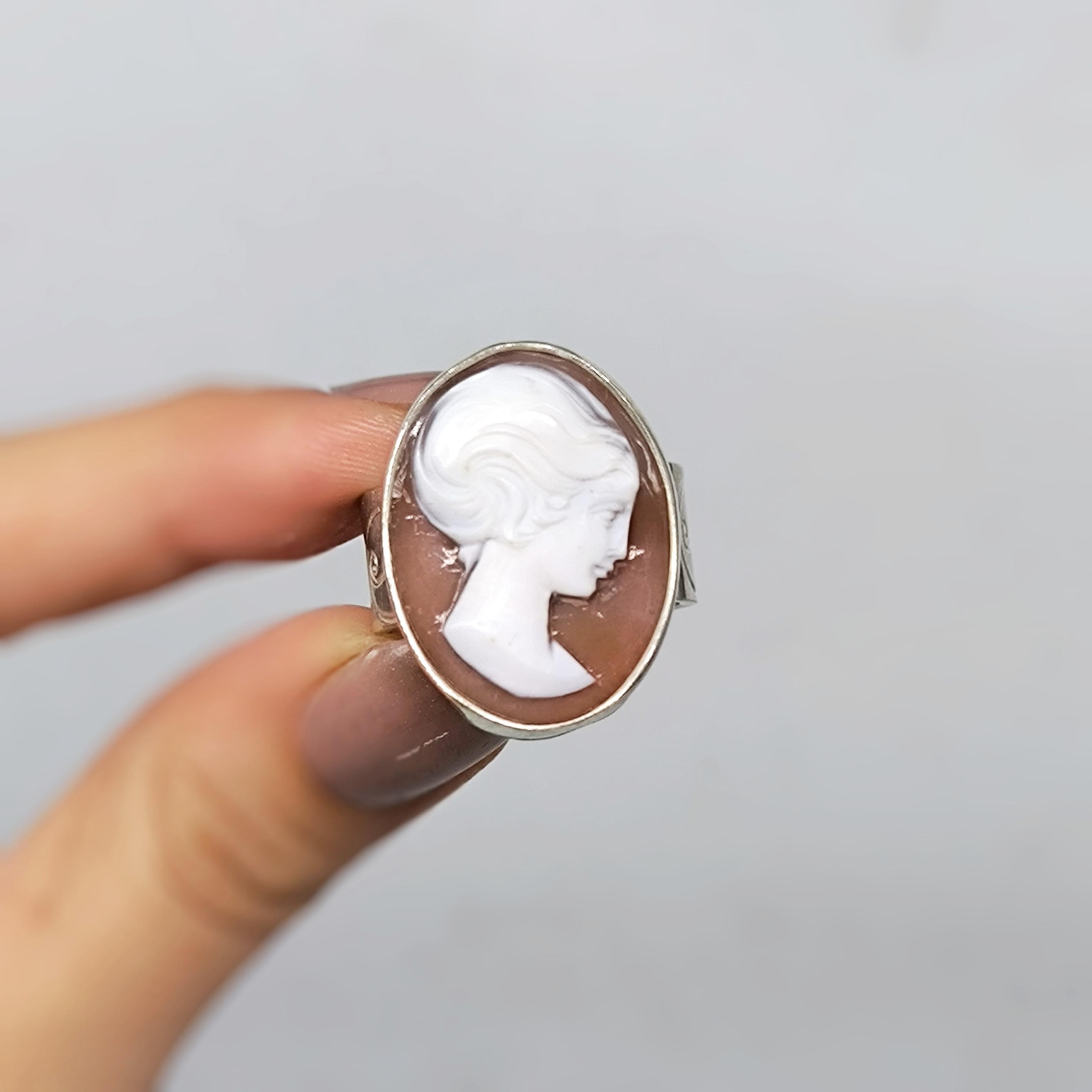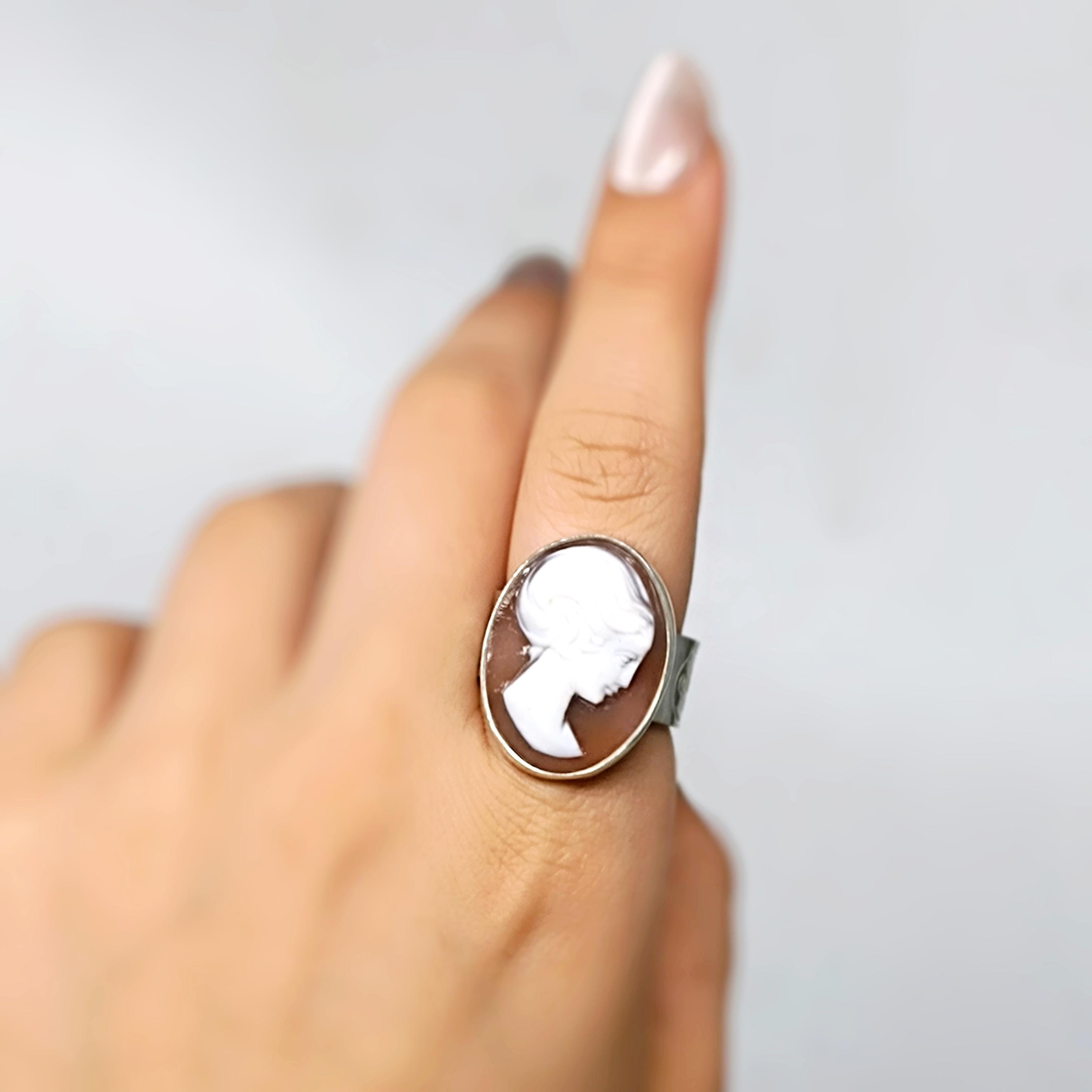 Zamana meydan okuyan bu zarif yüzükte, 19. yüzyıl Viktorya dönemine ait orijinal kabuk cameo kullanılmıştır. Elle oyulmuş klasik kadın silueti, dönemin estetik anlayışını ve romantik ruhunu yansıtır 🌹