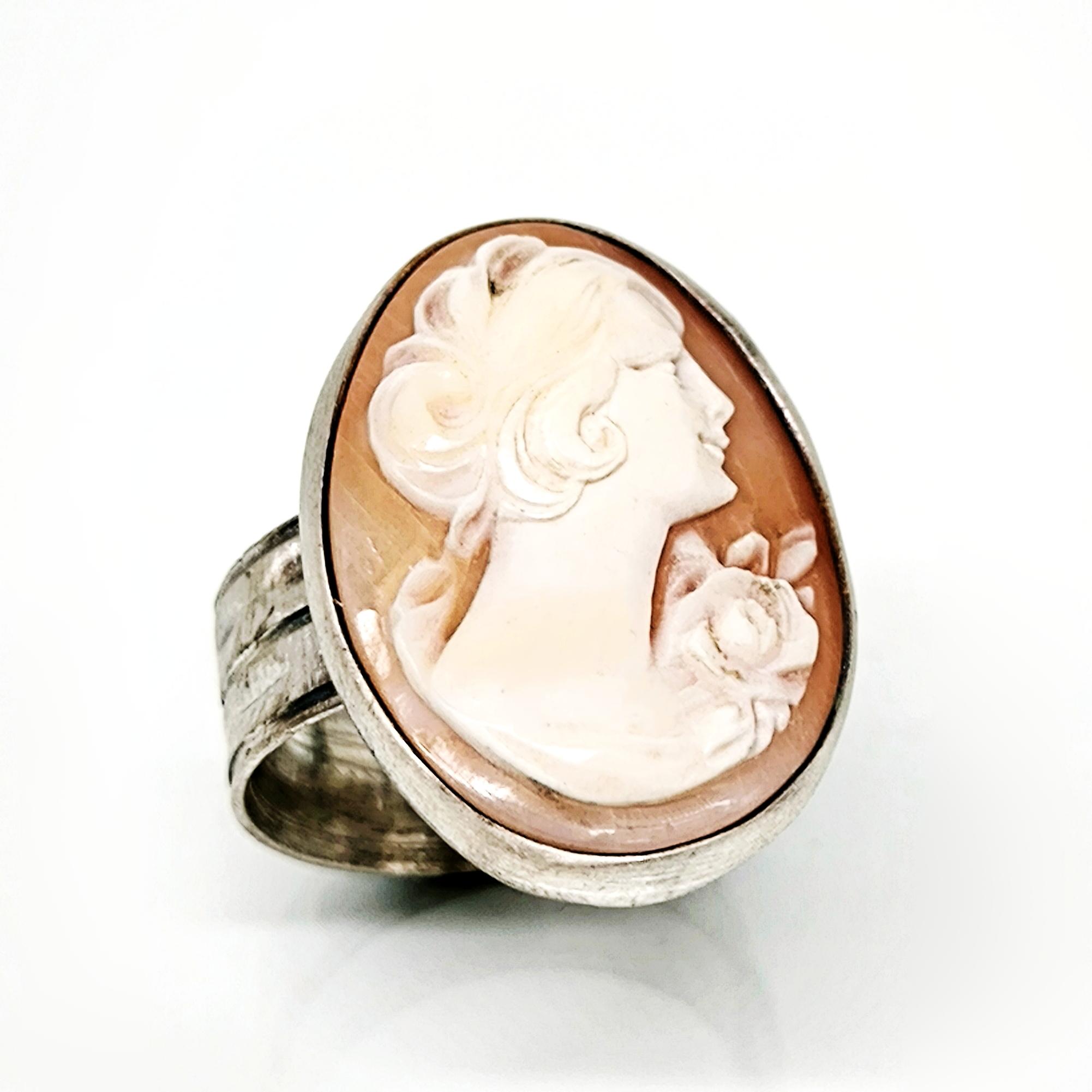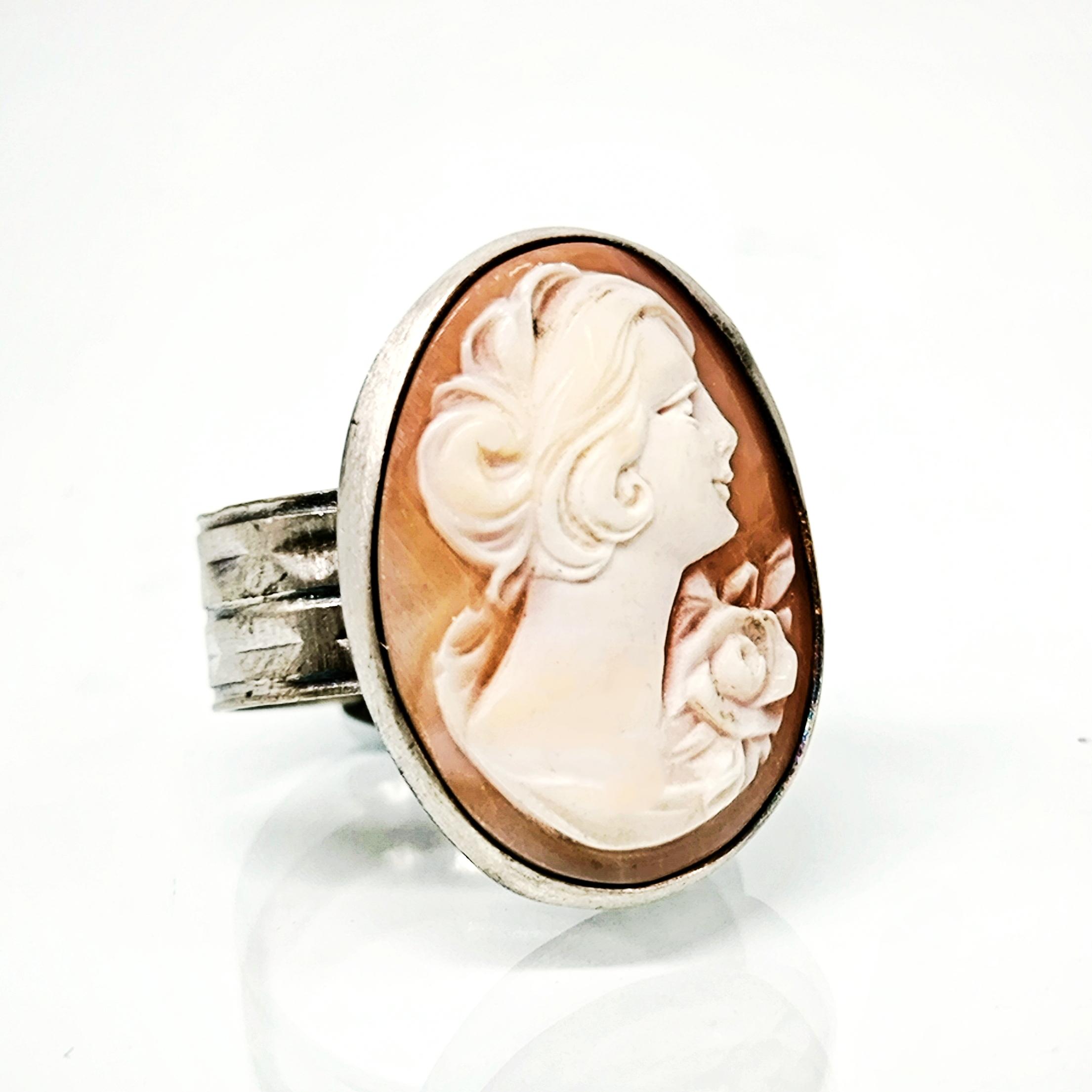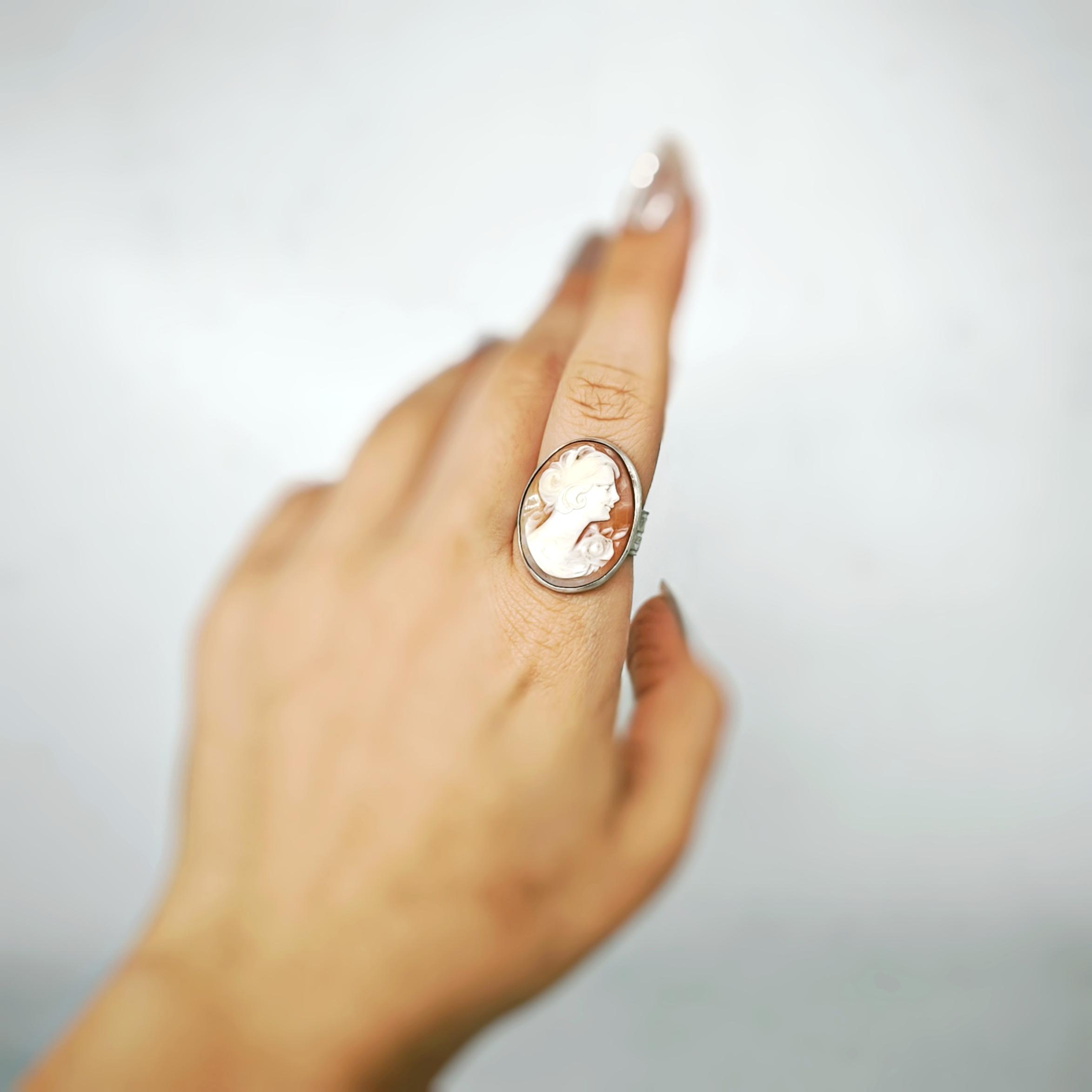 Zamana meydan okuyan bu zarif yüzükte, 19. yüzyıl Viktorya dönemine ait orijinal kabuk cameo kullanılmıştır. Elle oyulmuş klasik kadın silueti, dönemin estetik anlayışını ve romantik ruhunu yansıtır 🌹