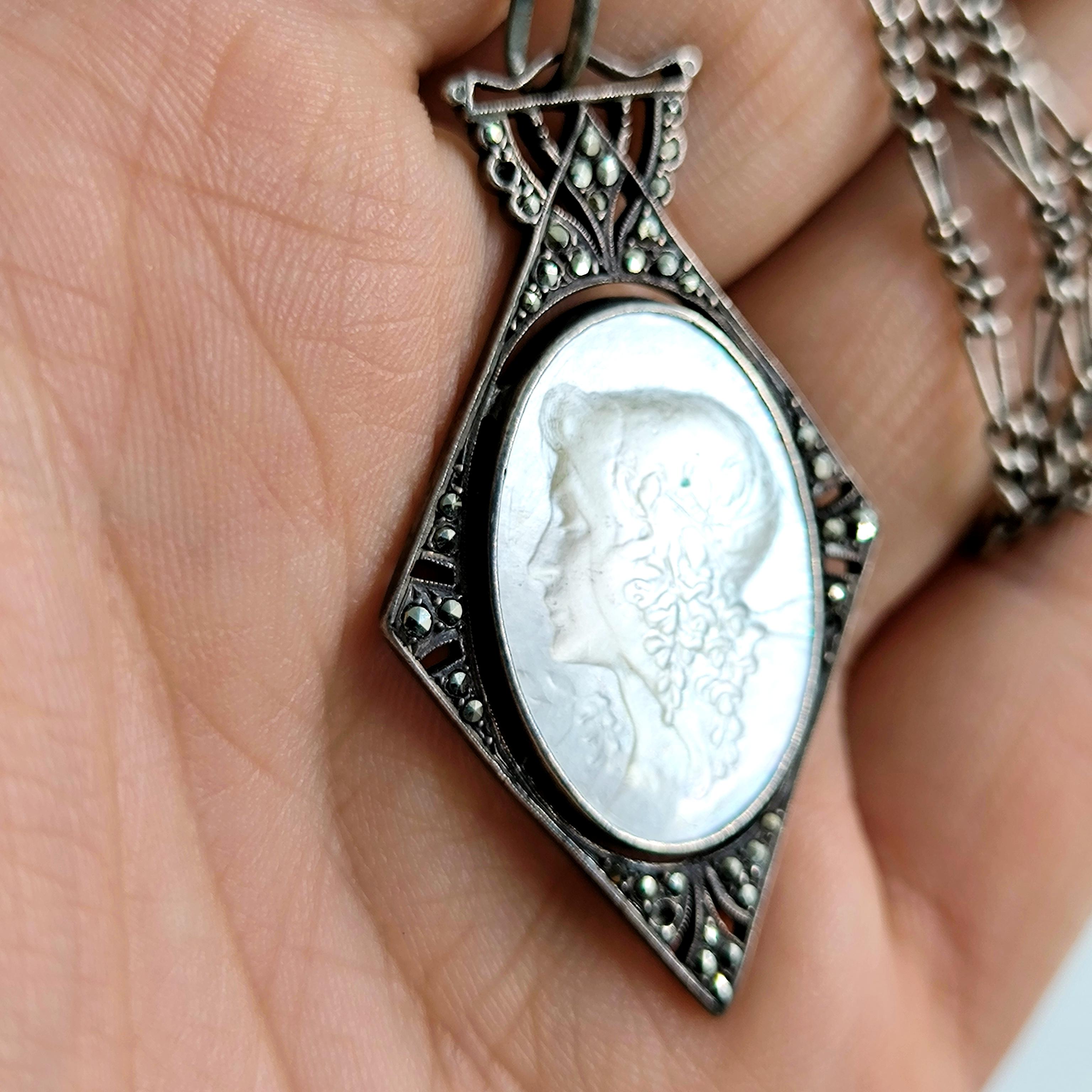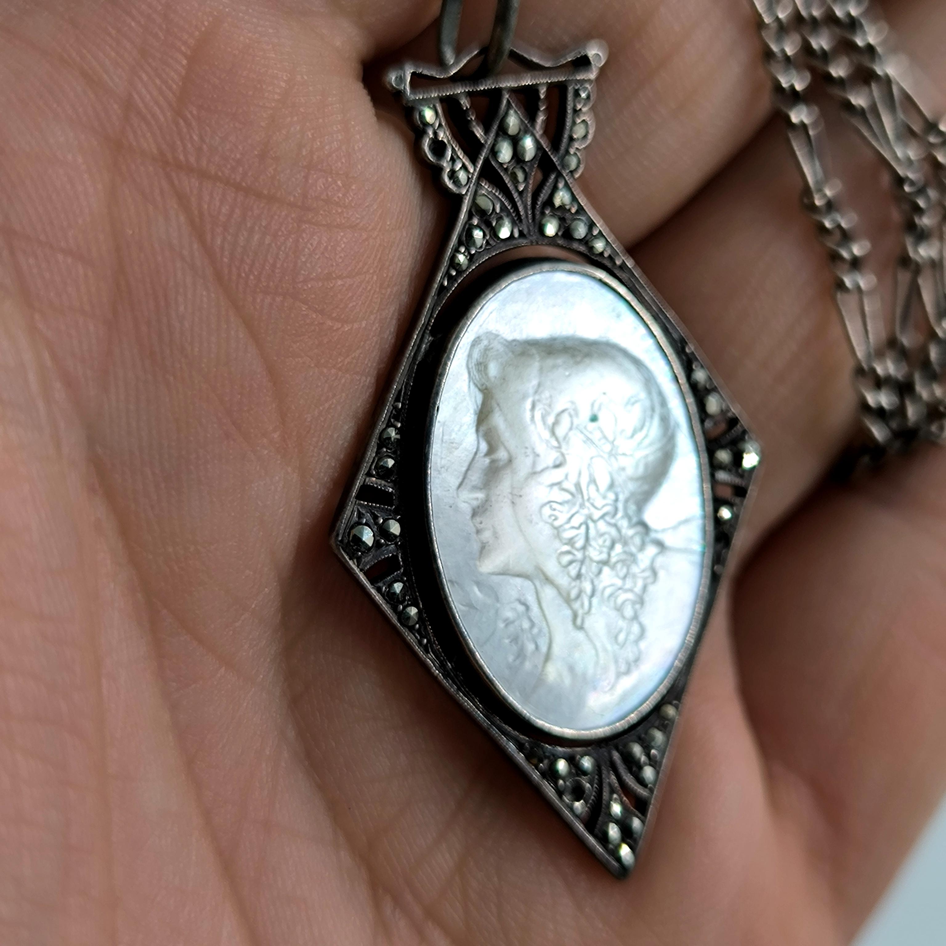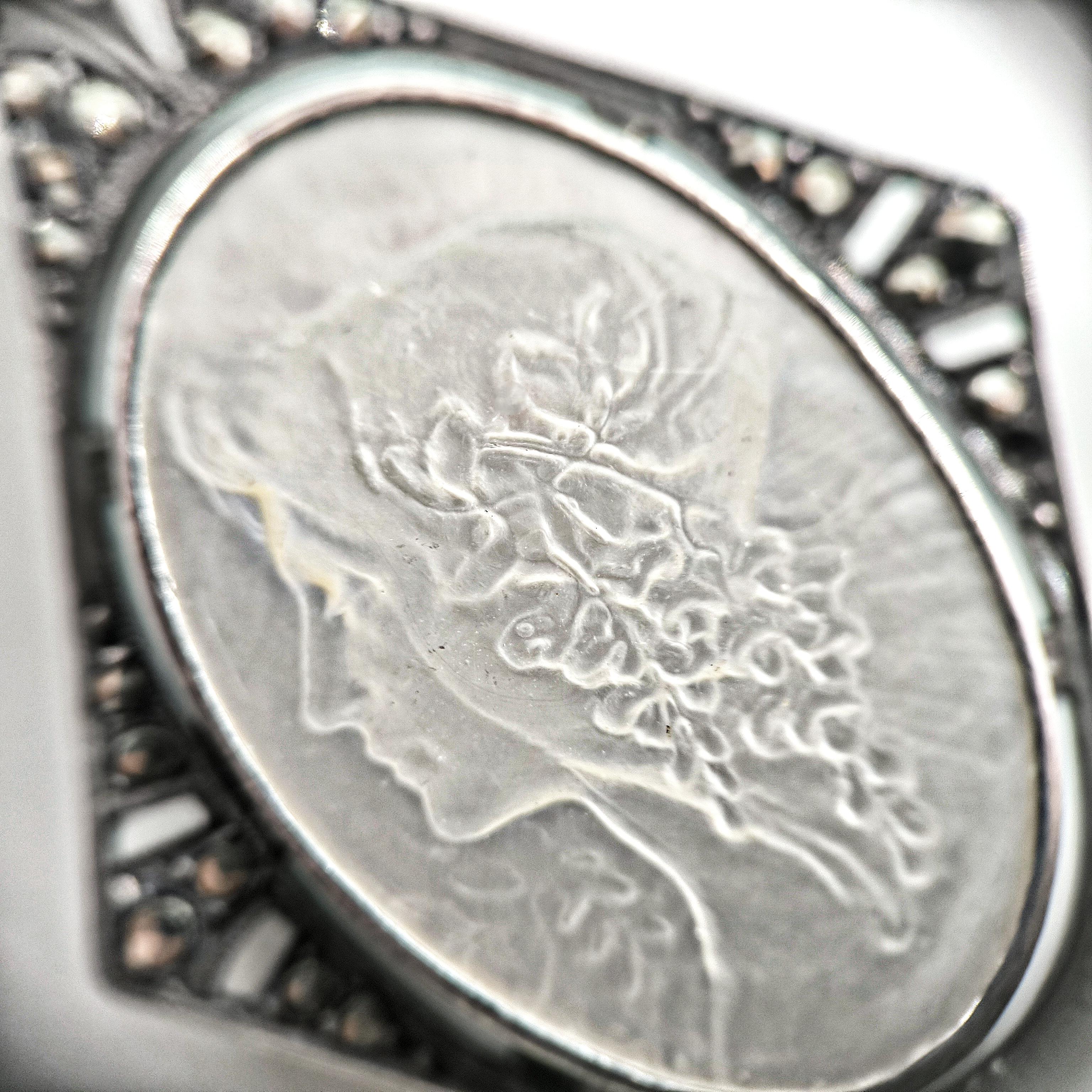 • Doğal sedef üzerine işlenmiş zarif bir kadın profili, klasik cameo tarzında…