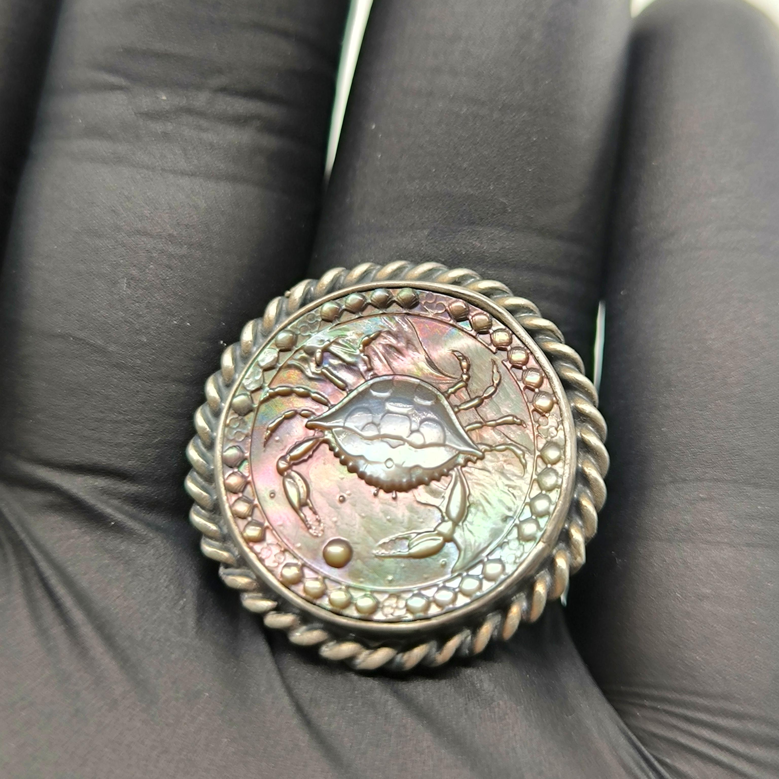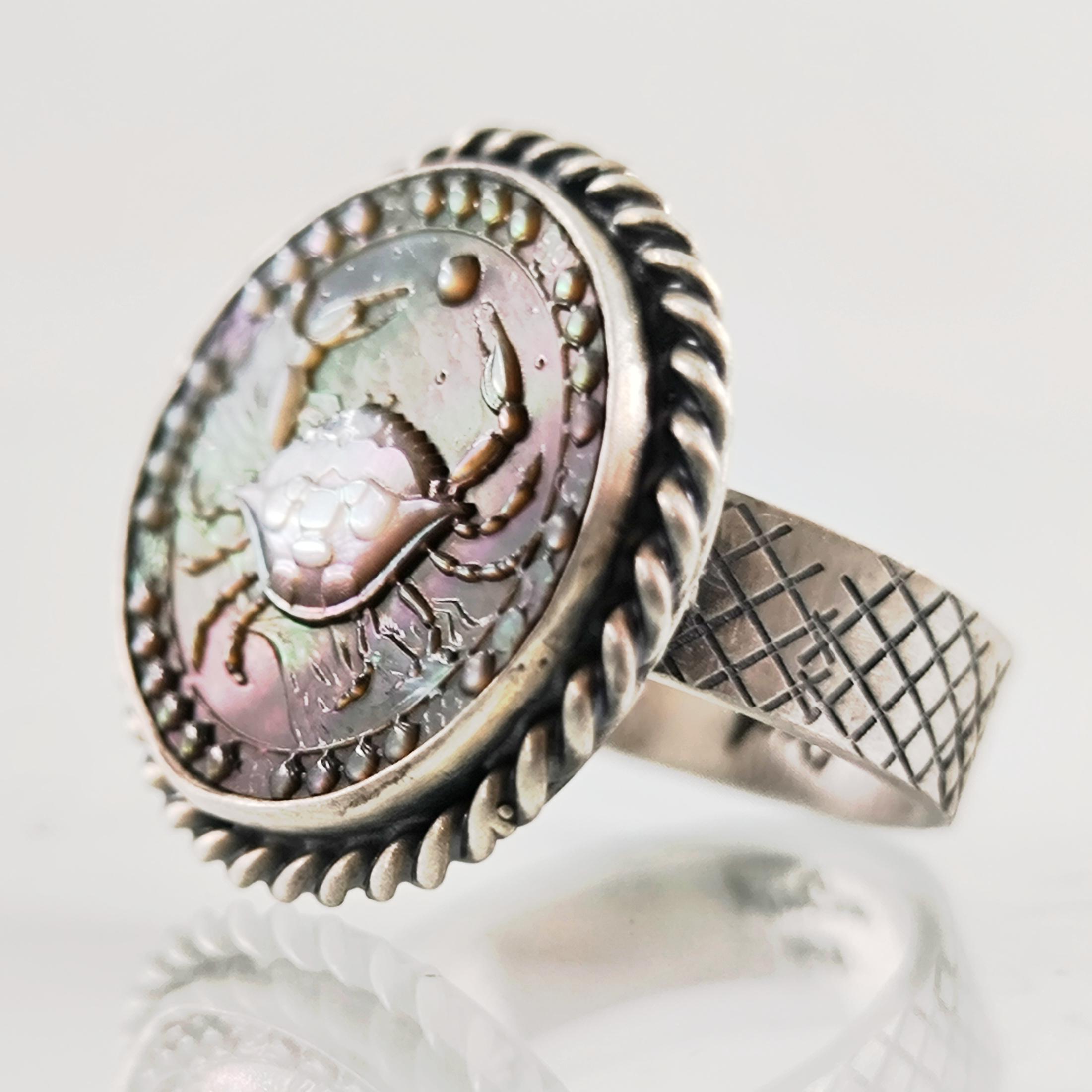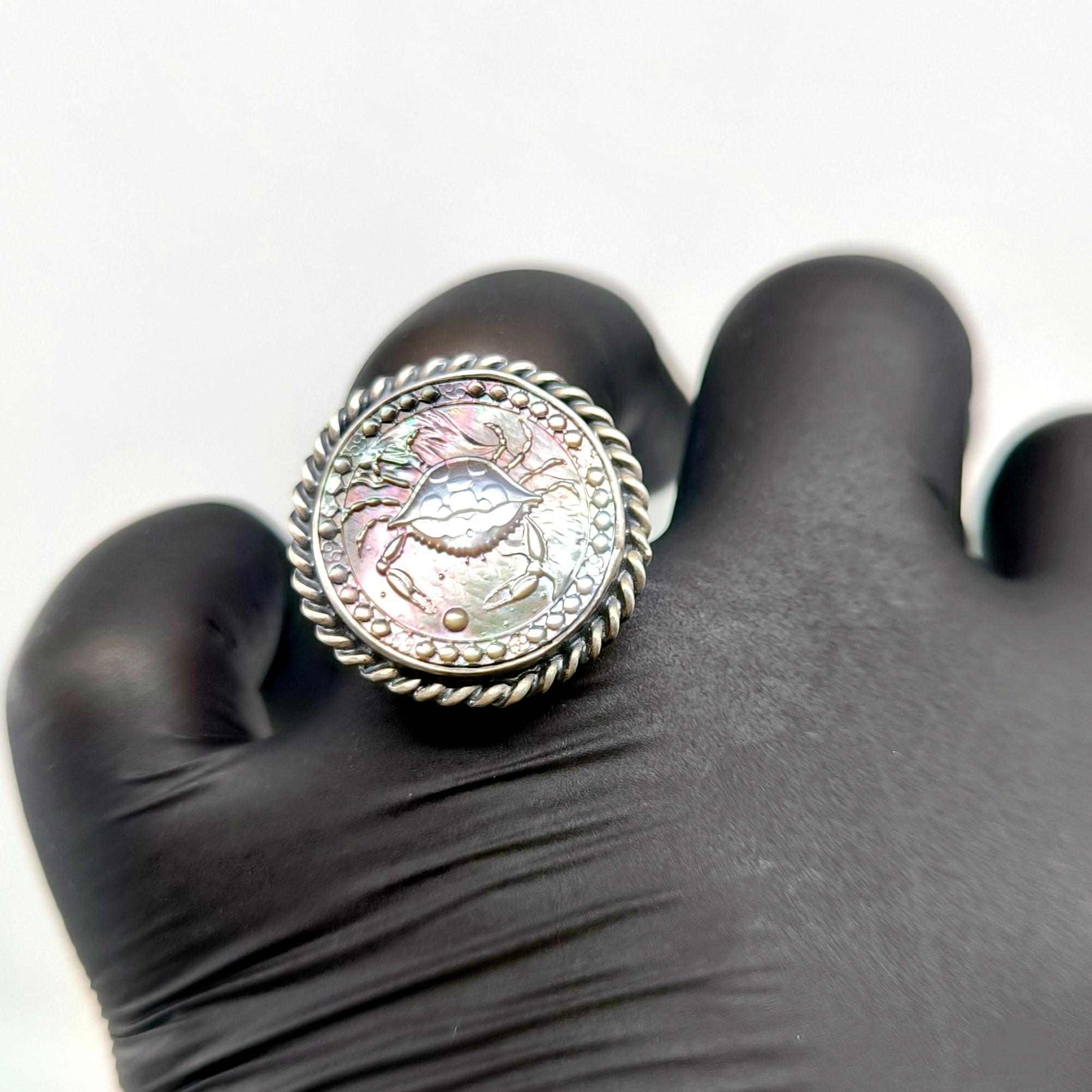 Doğal sedef üzerine CNC işleme ile ince ince oyduğum Yengeç burcu figürü, kabuğunun ardında sakladığı derin duygular ve güçlü sezgilerle ruhani bir koruyucu gibi yükseliyor. Sedefin ışıkla dans eden gökkuşağı yansımaları, yüzüğü her hareket ettirdiğinizde canlı bir enerji patlamasına dönüştürürken; 925 ayar gümüş çerçeve ve örgülü bezel detayları tasarımı antik bir mühür kadar etkileyici kılıyor. Sevginin gücüne inanan, ailesini kutsal sayan ve sezgileriyle yol alanlar için özel olarak hazırlanmış eşsiz bir parça.