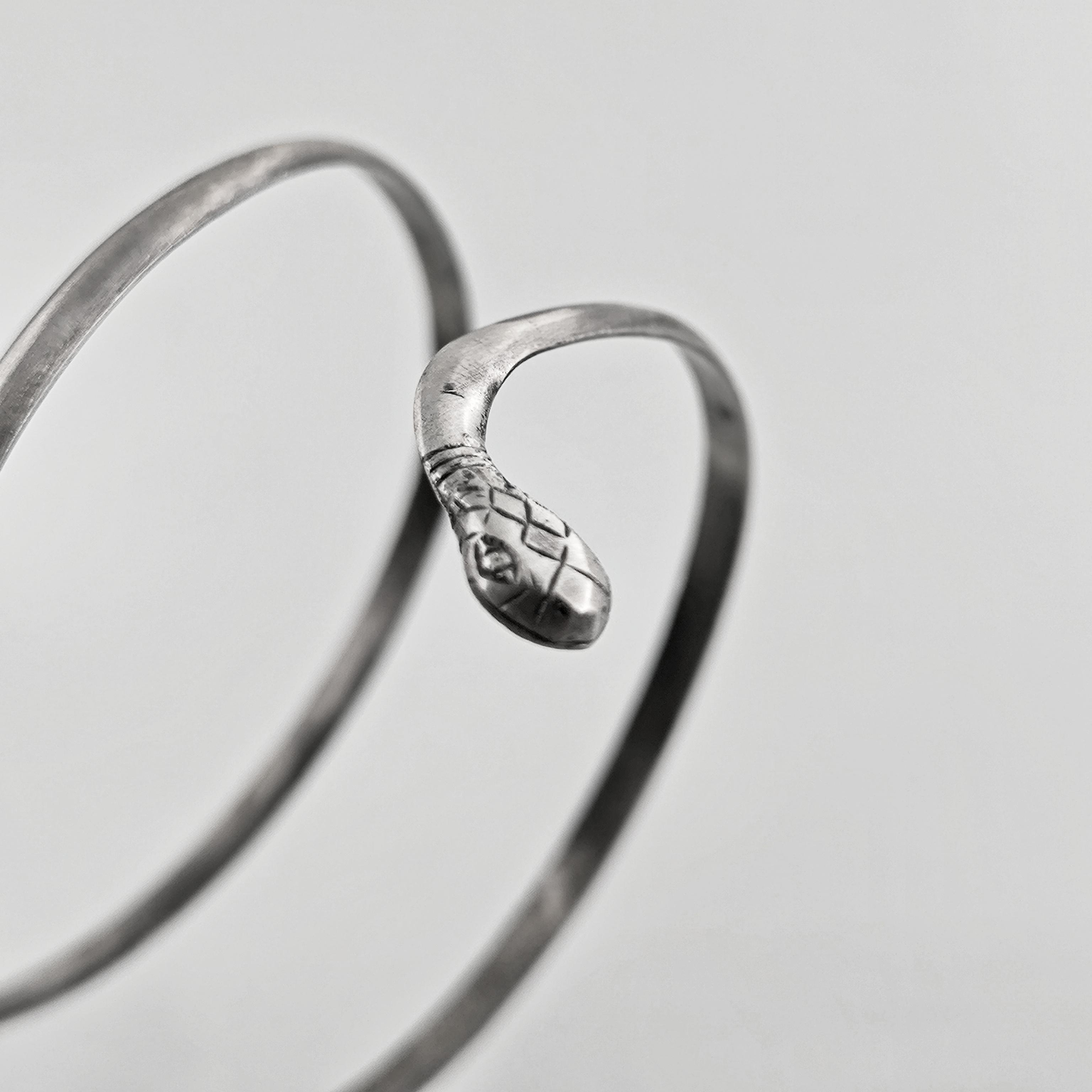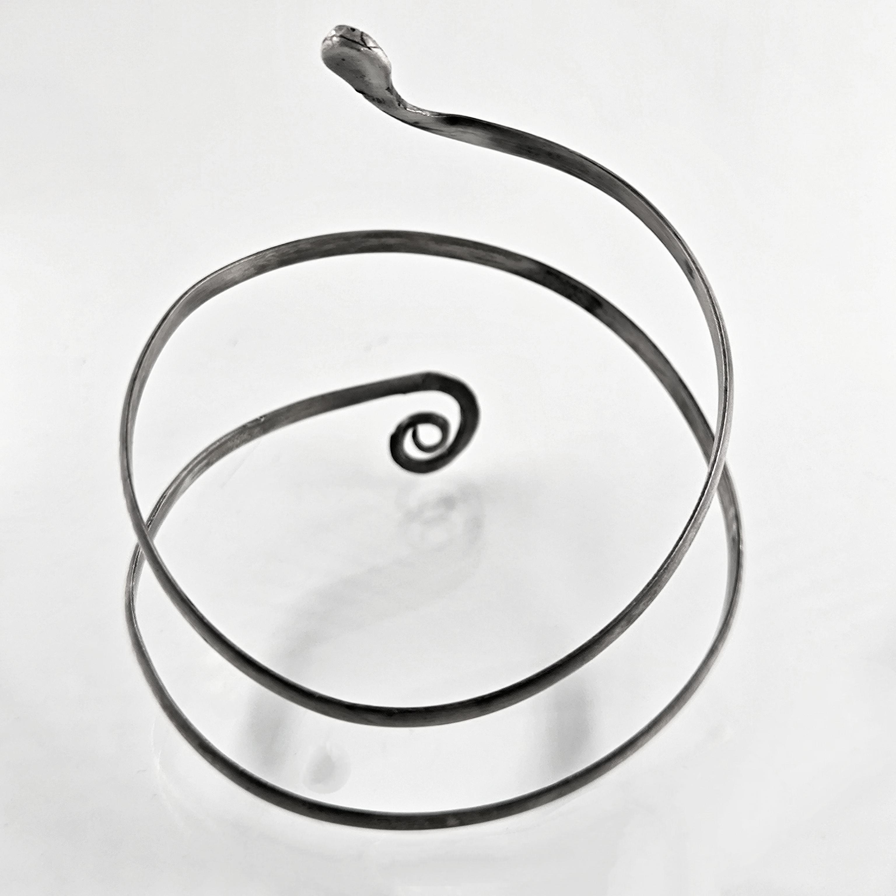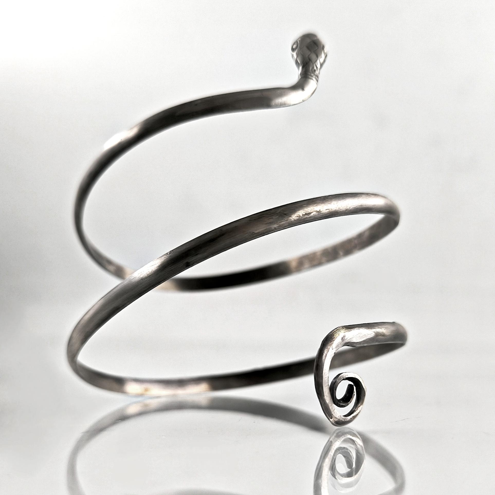Kadim uygarlıklarda bilgelik, koruma, şifa ve sonsuz dönüşümün sembolü olan yılan formundan ilham alarak tamamen el işçiliğiyle şekillendirdiğim bu pazubilezik, bedenle bütünleşen organik kıvrımlarıyla güçlü bir duruş sunuyor. Antik dönemin savaşçılarını, rahiplerini ve krallarını süsleyen spiral form, ruhun sürekli yenilenişini ve yaşam döngüsünü temsil eder. Bileziğin ucunda detaylı şekilde işlenmiş yılan başı, taşıyan kişiye sezgi, güç ve koruyucu enerji vadeden bir tılsım niteliğindedir. 925 ayar gümüşten elde dövülerek şekillendirilen bu parça, hem mitolojik hem de estetik anlamda zamansız bir ifade taşır.