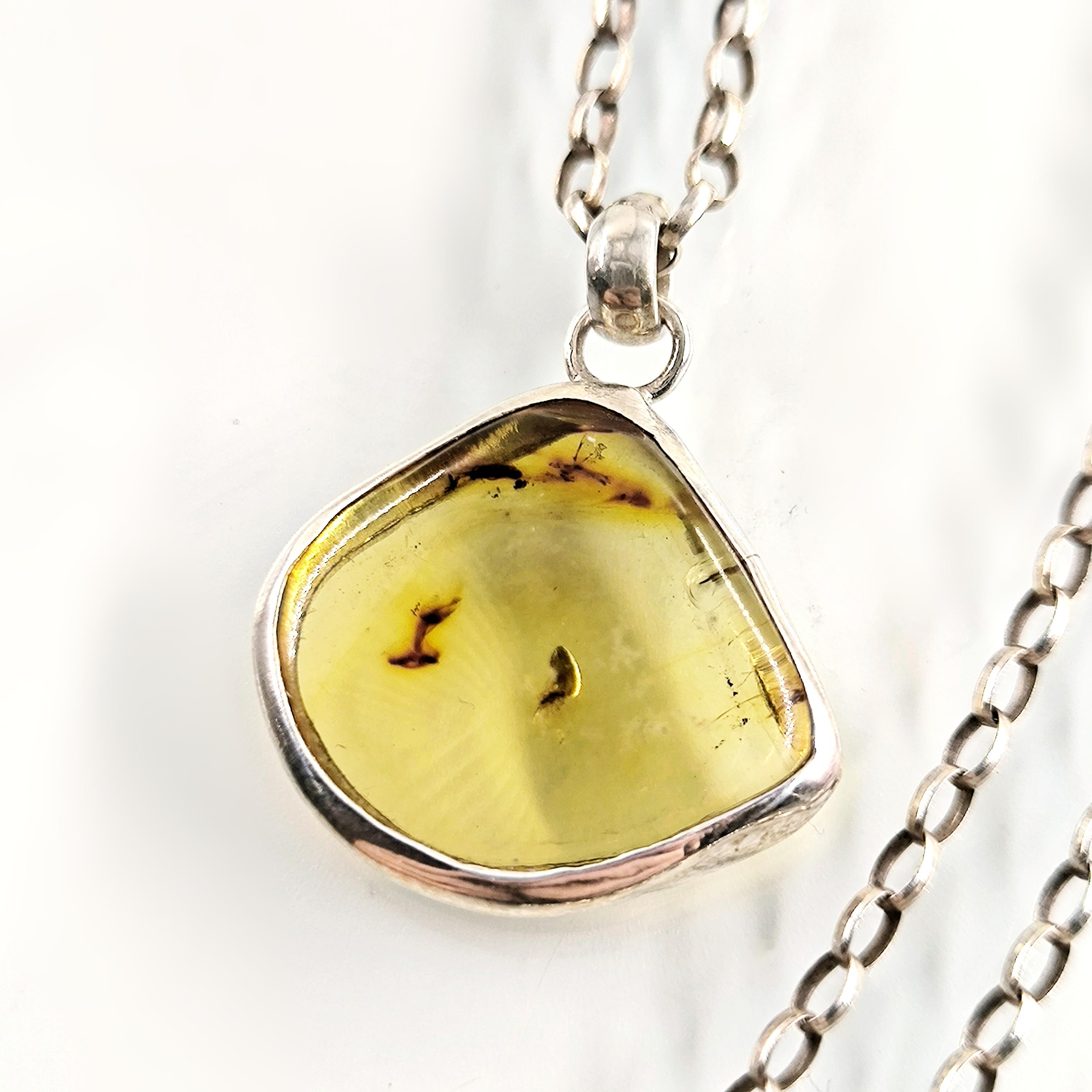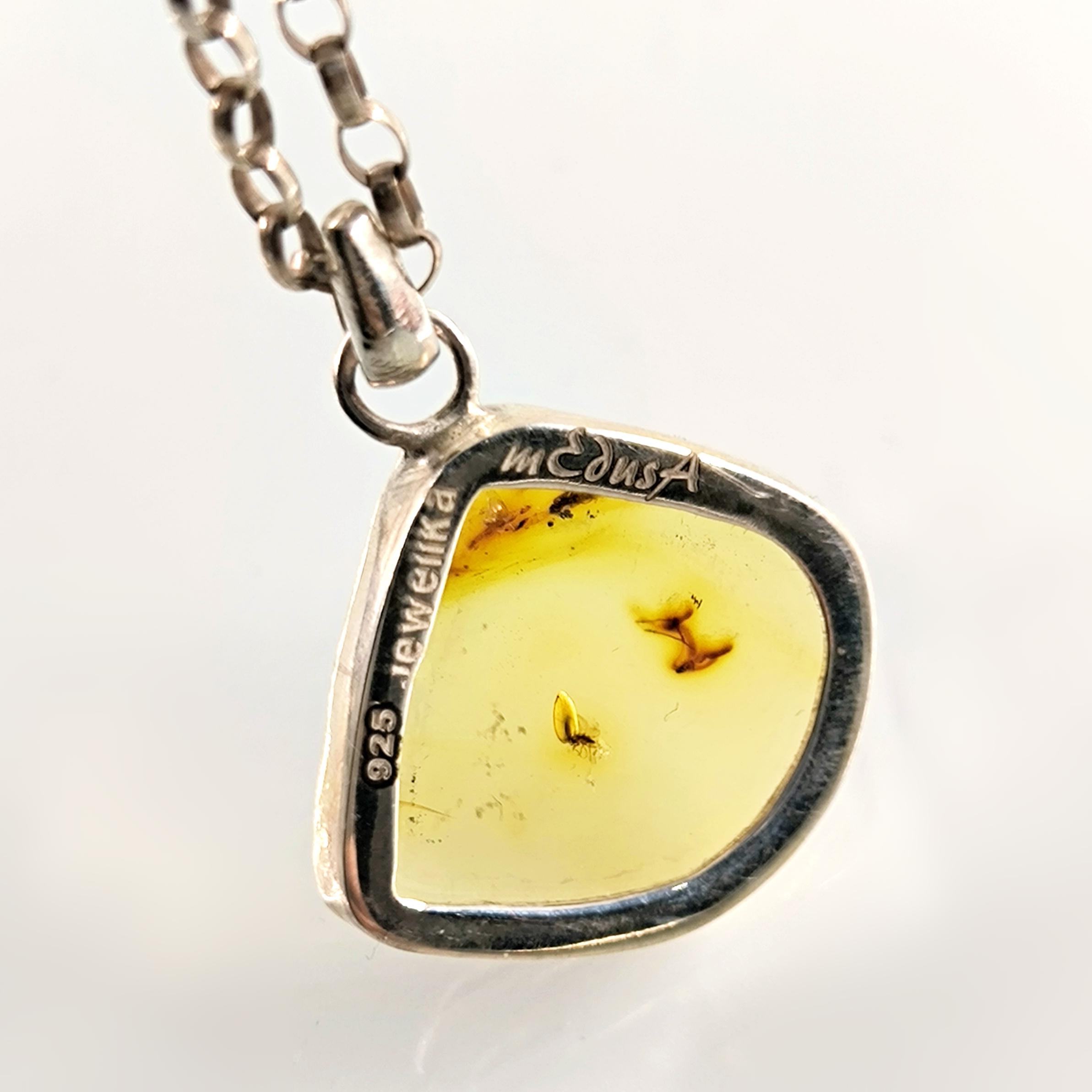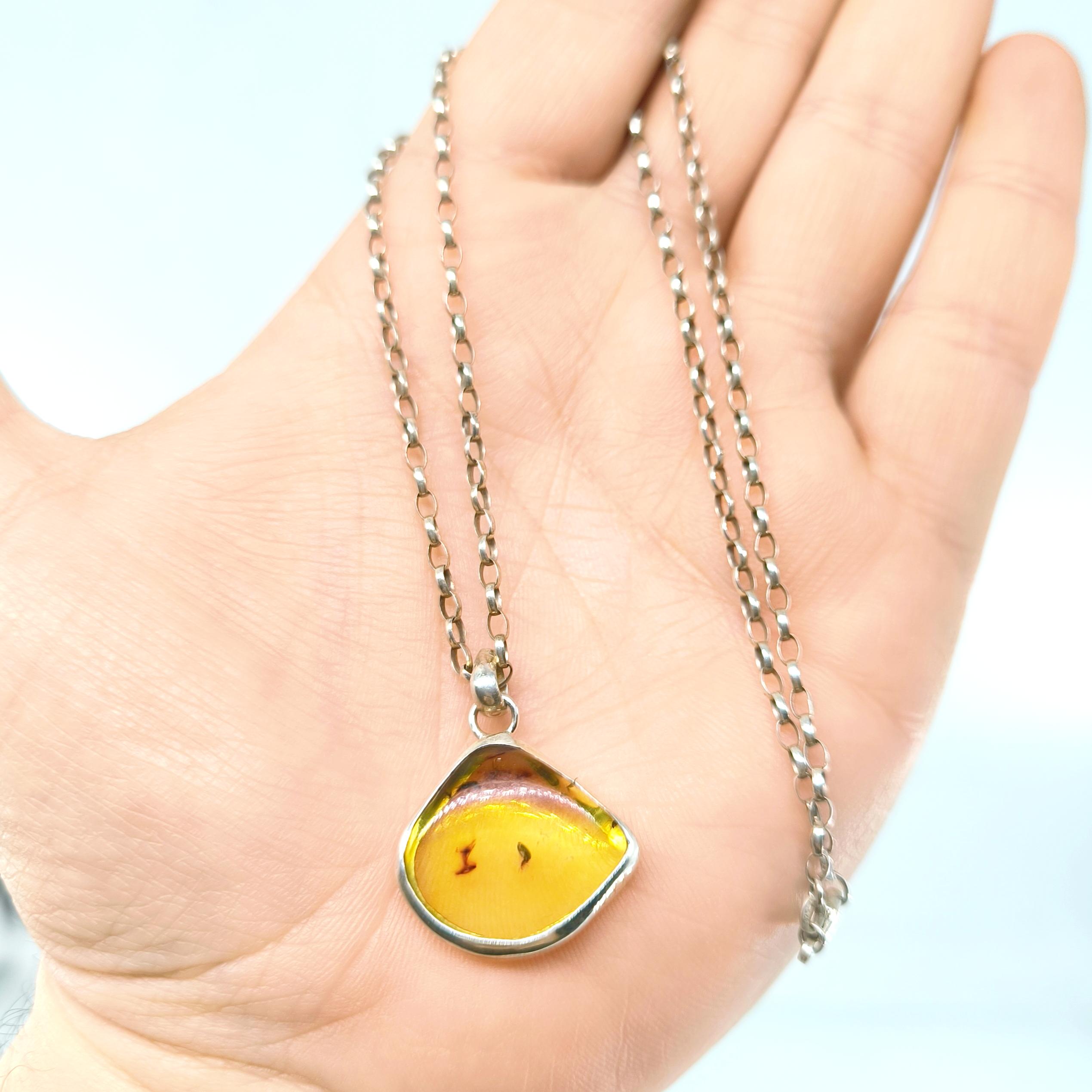 Bu tasarımda doğanın milyonlarca yıllık hatırasını boyunda taşınan bir sanat eserine dönüştürdüm. Tamamı 925 ayar gümüşten hazırladığım zarif çerçevenin içinde yer alan natürel damla kehribar, içinde iki adet son derece net görülen sinek fosiliyle gerçek bir zaman kapsülü niteliği taşıyor. Bu küçük canlılar, milyonlarca yıl önce reçinenin içinde donarak bugüne ulaşmış doğanın eşsiz bir mucizesidir. Işığa tutulduğunda kehribarın altın tonları ve içindeki fosiller büyüleyici bir derinlik oluşturur. Her biri benzersiz olan bu parça, yalnızca bir kolye değil; doğanın tarihini boynunuzda taşıdığınız nadide bir koleksiyon parçasıdır.
