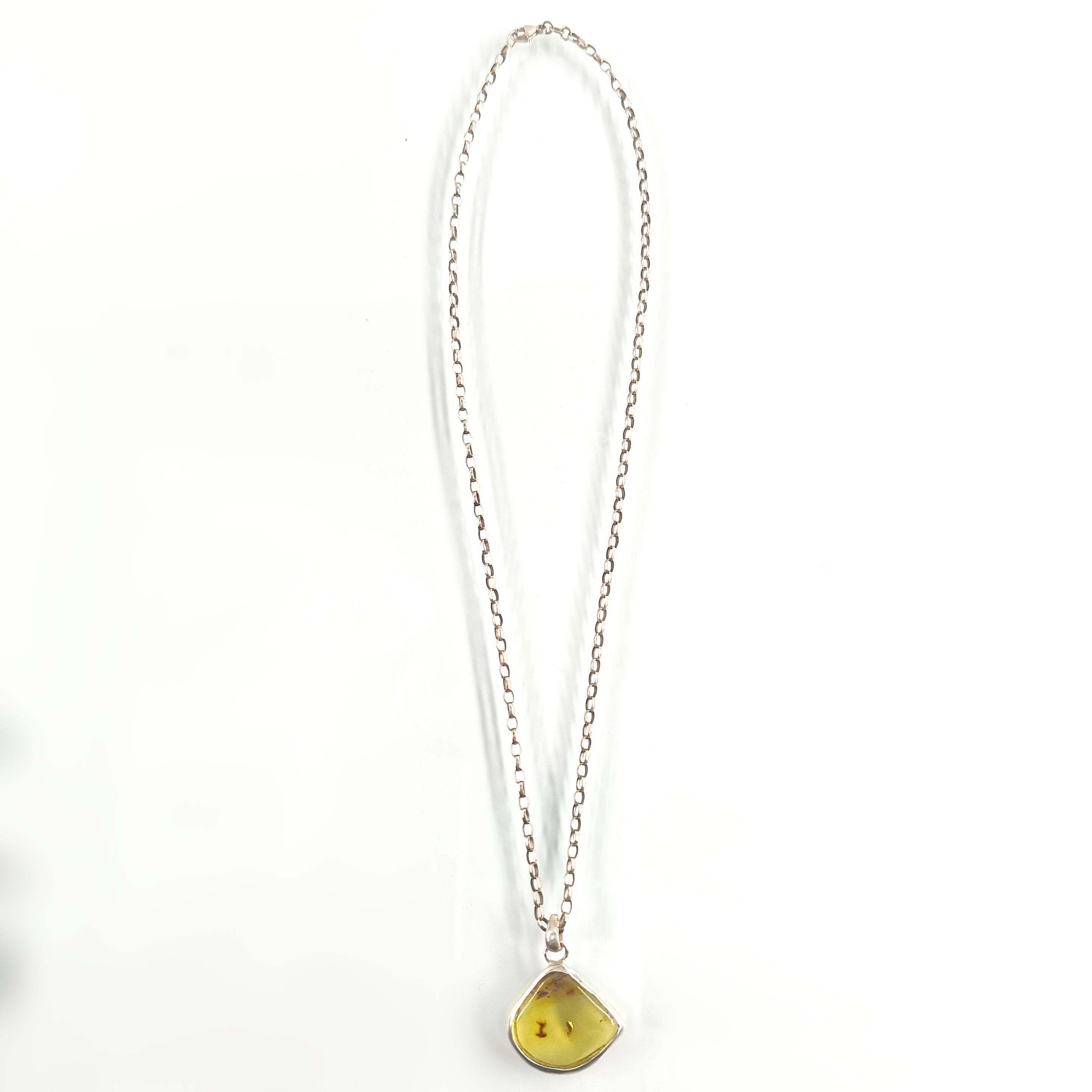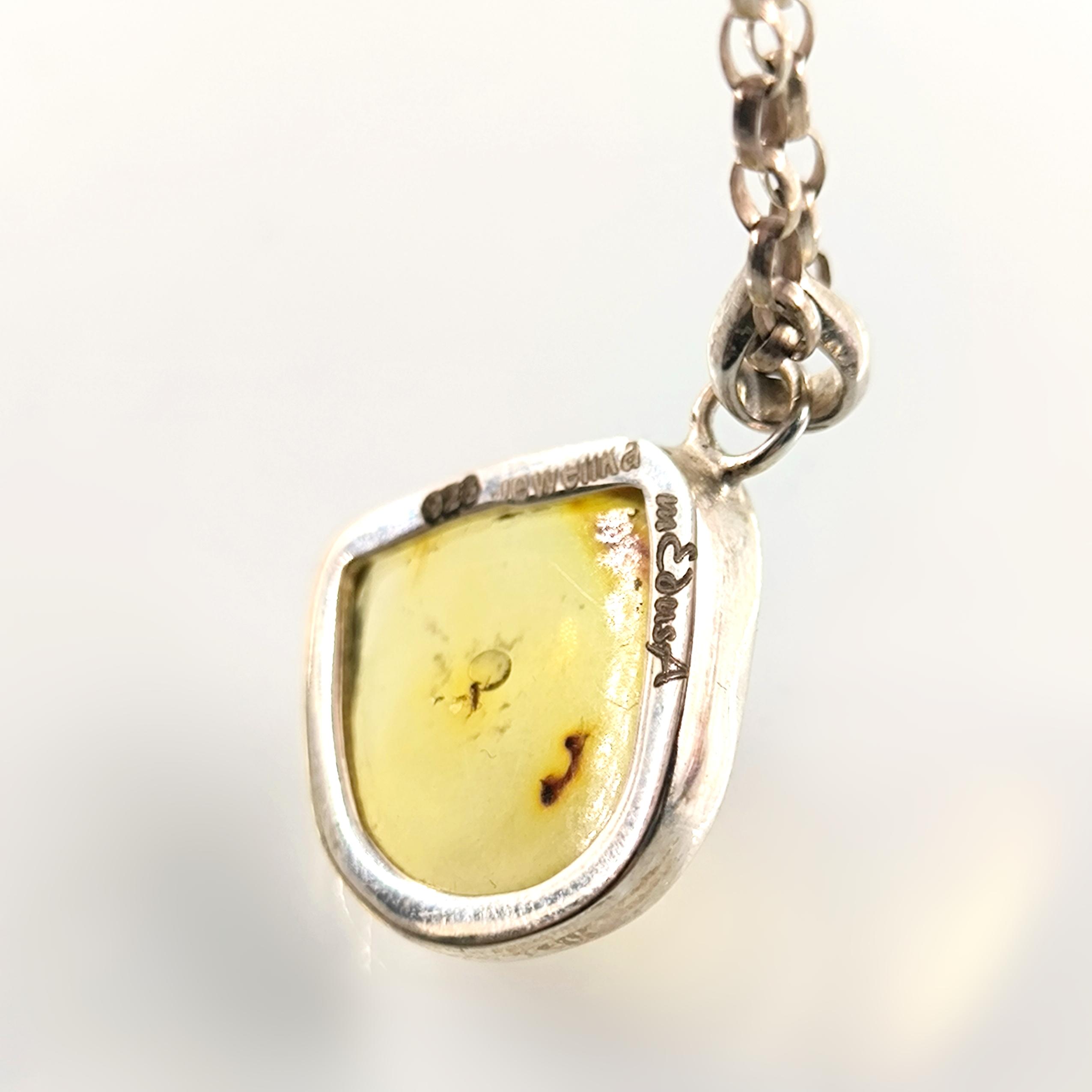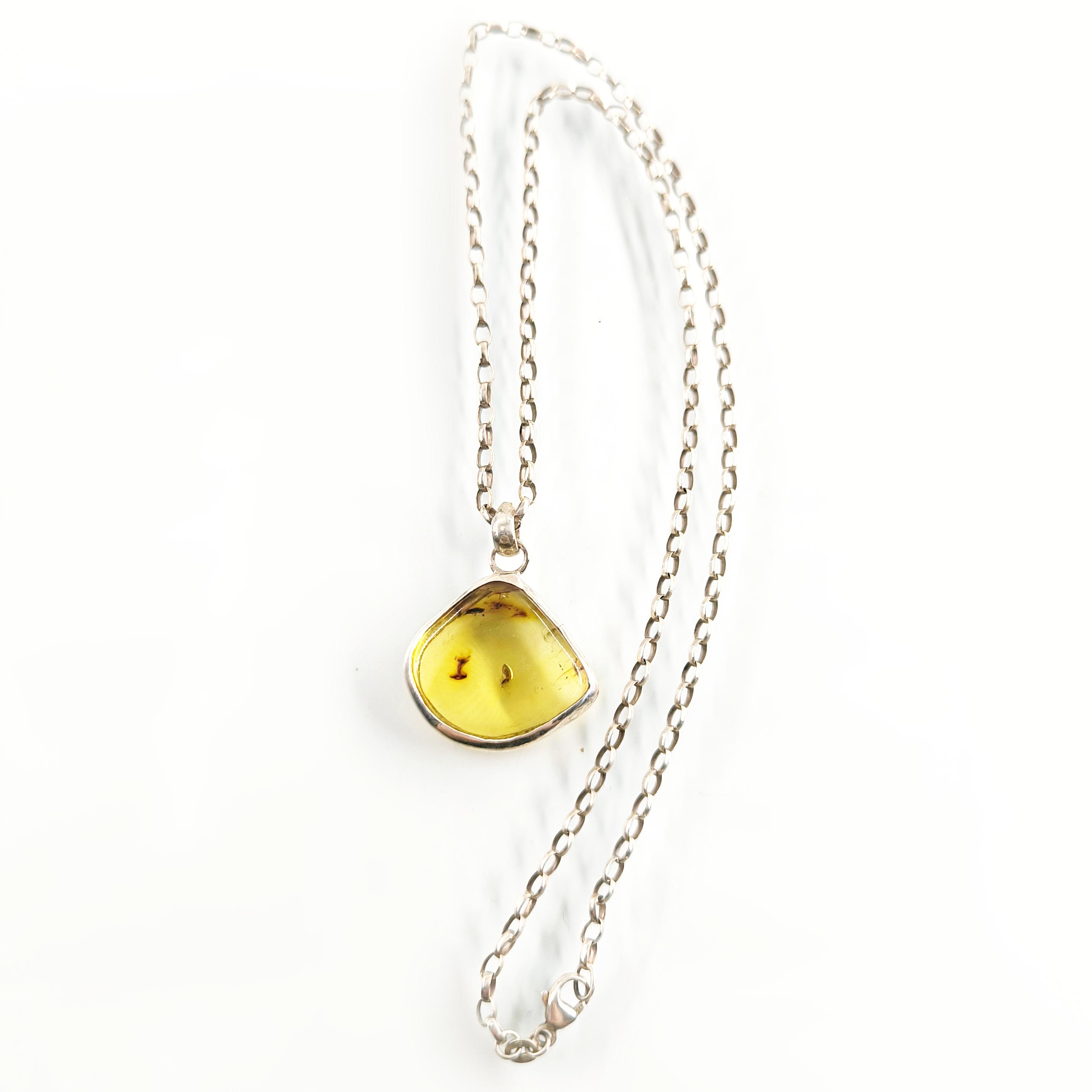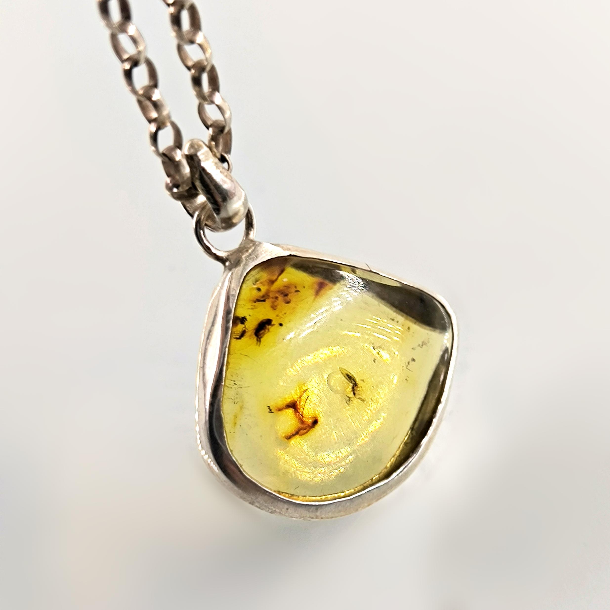 Bu tasarımda doğanın milyonlarca yıllık hatırasını boyunda taşınan bir sanat eserine dönüştürdüm. Tamamı 925 ayar gümüşten hazırladığım zarif çerçevenin içinde yer alan natürel damla kehribar, içinde iki adet son derece net görülen sinek fosiliyle gerçek bir zaman kapsülü niteliği taşıyor. Bu küçük canlılar, milyonlarca yıl önce reçinenin içinde donarak bugüne ulaşmış doğanın eşsiz bir mucizesidir. Işığa tutulduğunda kehribarın altın tonları ve içindeki fosiller büyüleyici bir derinlik oluşturur. Her biri benzersiz olan bu parça, yalnızca bir kolye değil; doğanın tarihini boynunuzda taşıdığınız nadide bir koleksiyon parçasıdır.