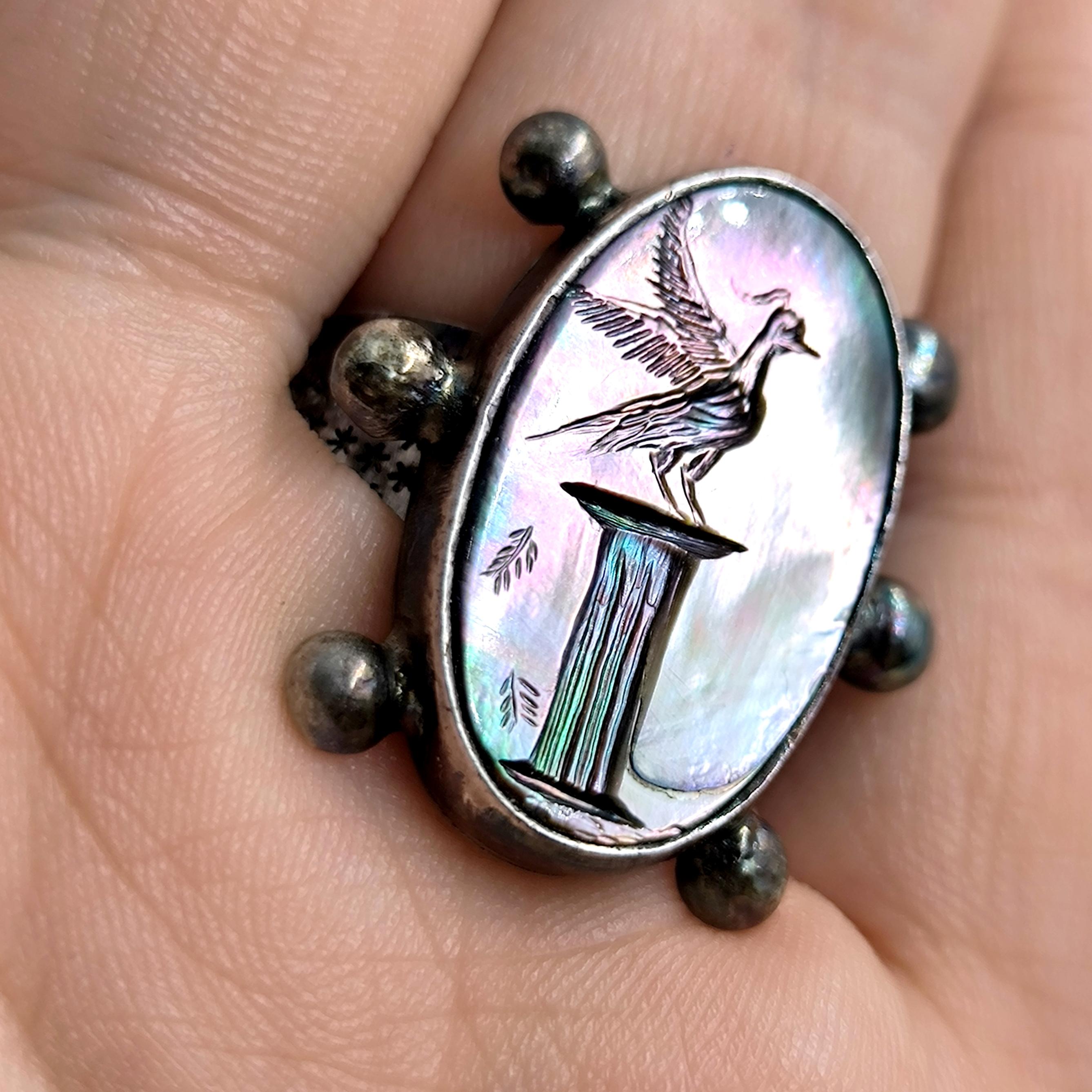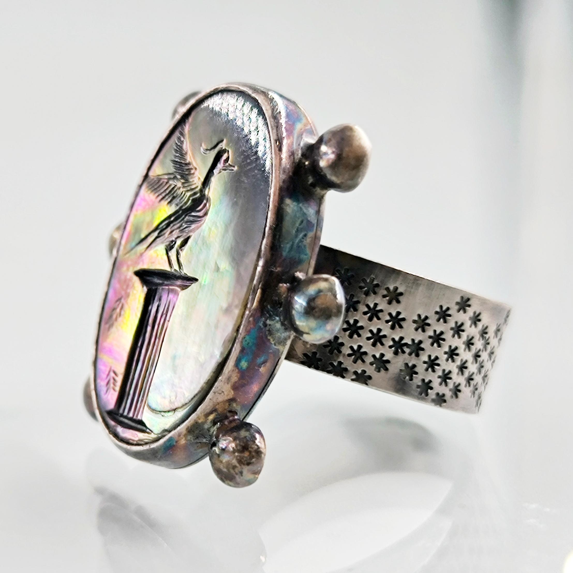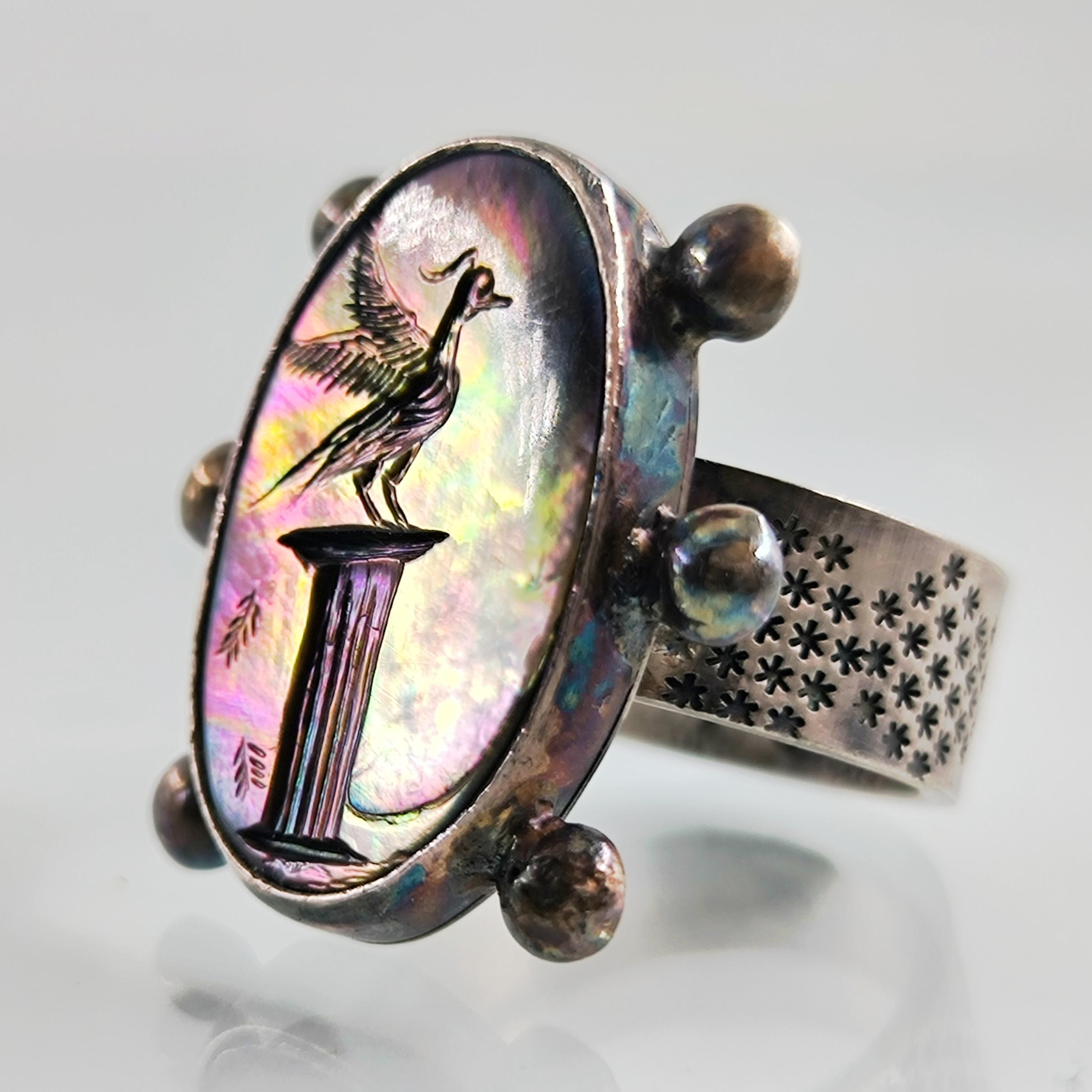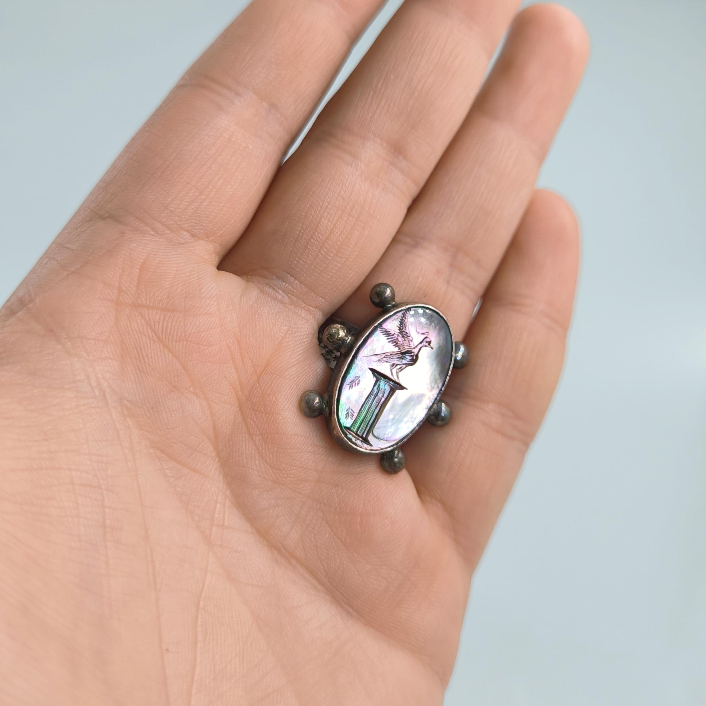 Doğanın özgür ruhunu ve antik çağların asaletini bir araya getiren bu özel yüzük, sedef taş üzerine işlenmiş zarif bir kuş figürüyle hayat buluyor. İncelikle oyulan intaglio çalışmasında, antik bir sütun üzerinde gururla duran kuş, hem özgürlüğü hem de köklü bir geçmişin zarafetini simgeliyor. Sedefin ışıltılı renk oyunları, her ışıkta farklı bir hikâye fısıldarken; 925 ayar gümüş gövde üzerindeki yıldız motifleri, gökyüzünün sonsuzluğunu hatırlatıyor.