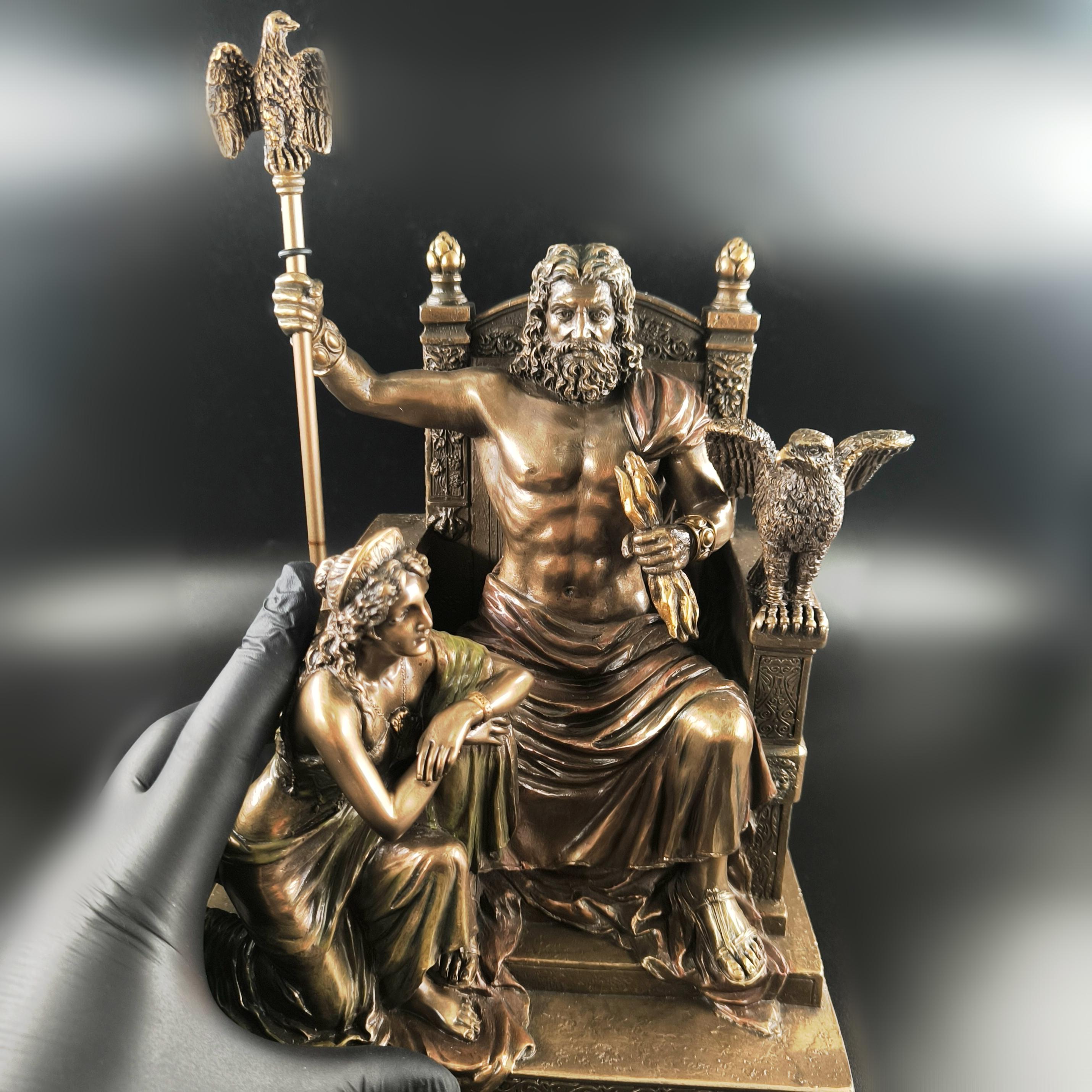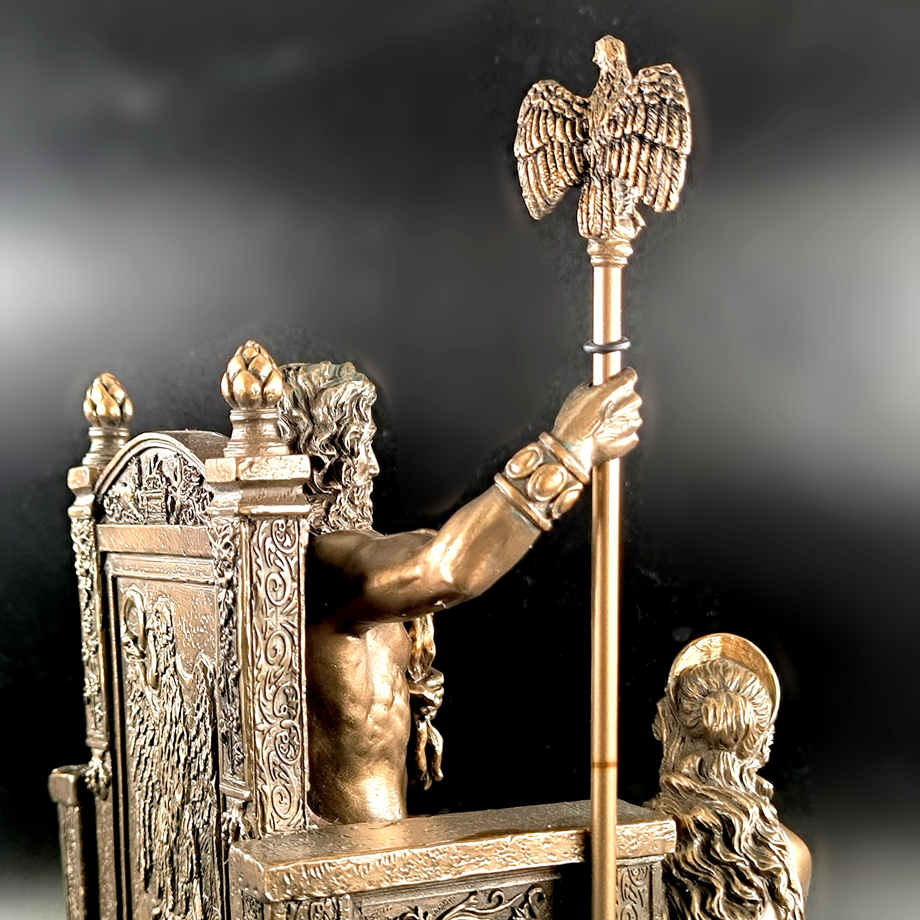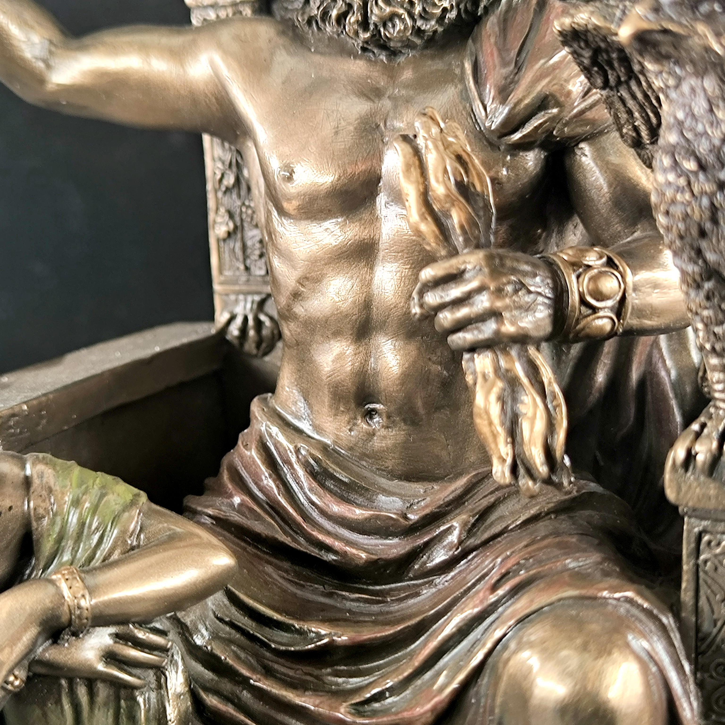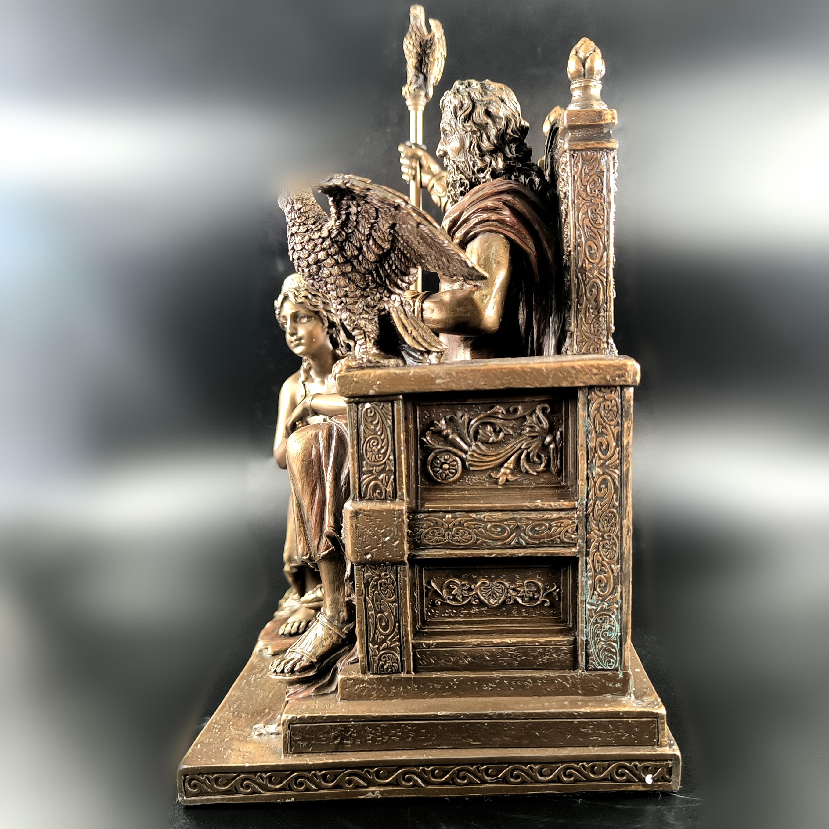 Mitolojinin en yüce kudreti Zeus, görkemli tahtında hüküm sürerken yanında otoritenin ve sadakatin sembolü Hera diz çökmüş halde betimlenmiştir. Zeus’un elindeki şimşek, göklerin hâkimiyetini temsil ederken, tahtının iki yanında yükselen kartallar ilahi gücün ve koruyucu kuvvetin simgesidir. Heykelin her kıvrımında, her detayında tanrısal bir görkem ve antik dünyanın ihtişamı hissedilir. Bu etkileyici sahne, tarihin en güçlü çiftini zamana meydan okuyan bir duruşla karşımıza çıkarırken, sanatçının mükemmel dokunuşlarıyla adeta nefes alır. Antik Yunan panteonunun en görkemli anı, koleksiyonlarda merkezde duracak kadar asil ve büyülü bir estetikle yeniden hayat bulmaktadır. Mermer ve kemik tozu karışımlı özel bir madde ile şekillendirilmiş olup usta sanatçılar tarafından itinayla el boyaması yapılmıştır. Çok detaylı ve gerçekçi ayrıntılara sahip olan bu eser, dünya çapında işçilik kalitesi ile bilinen Veronese markasının damgasını taşımaktadır.