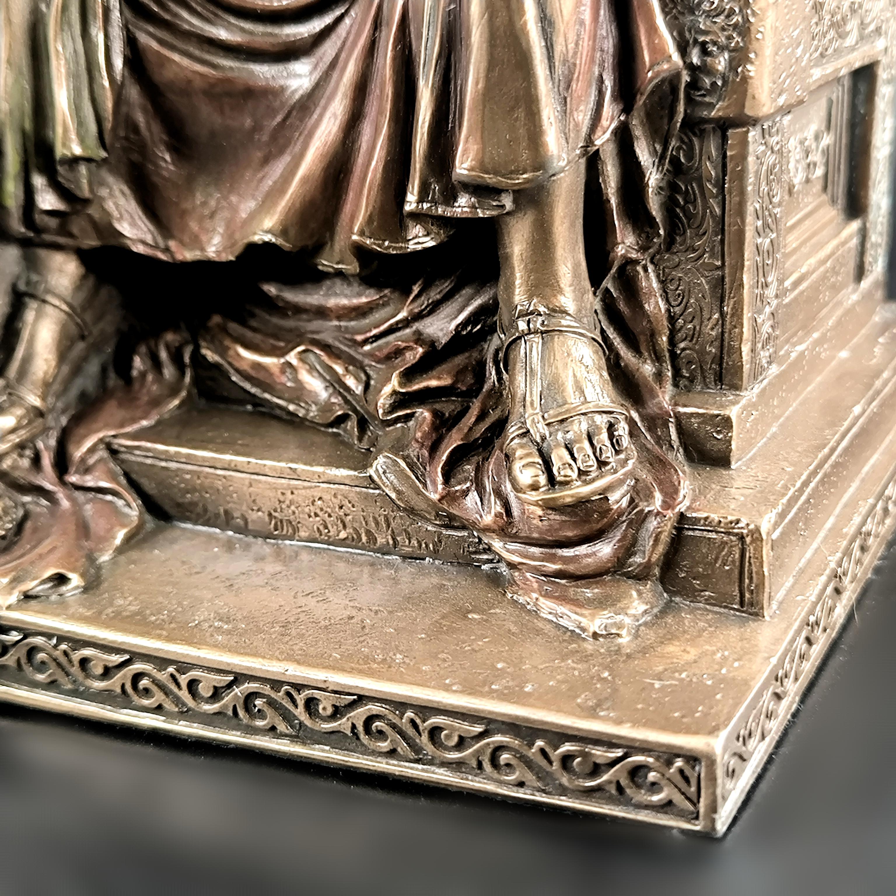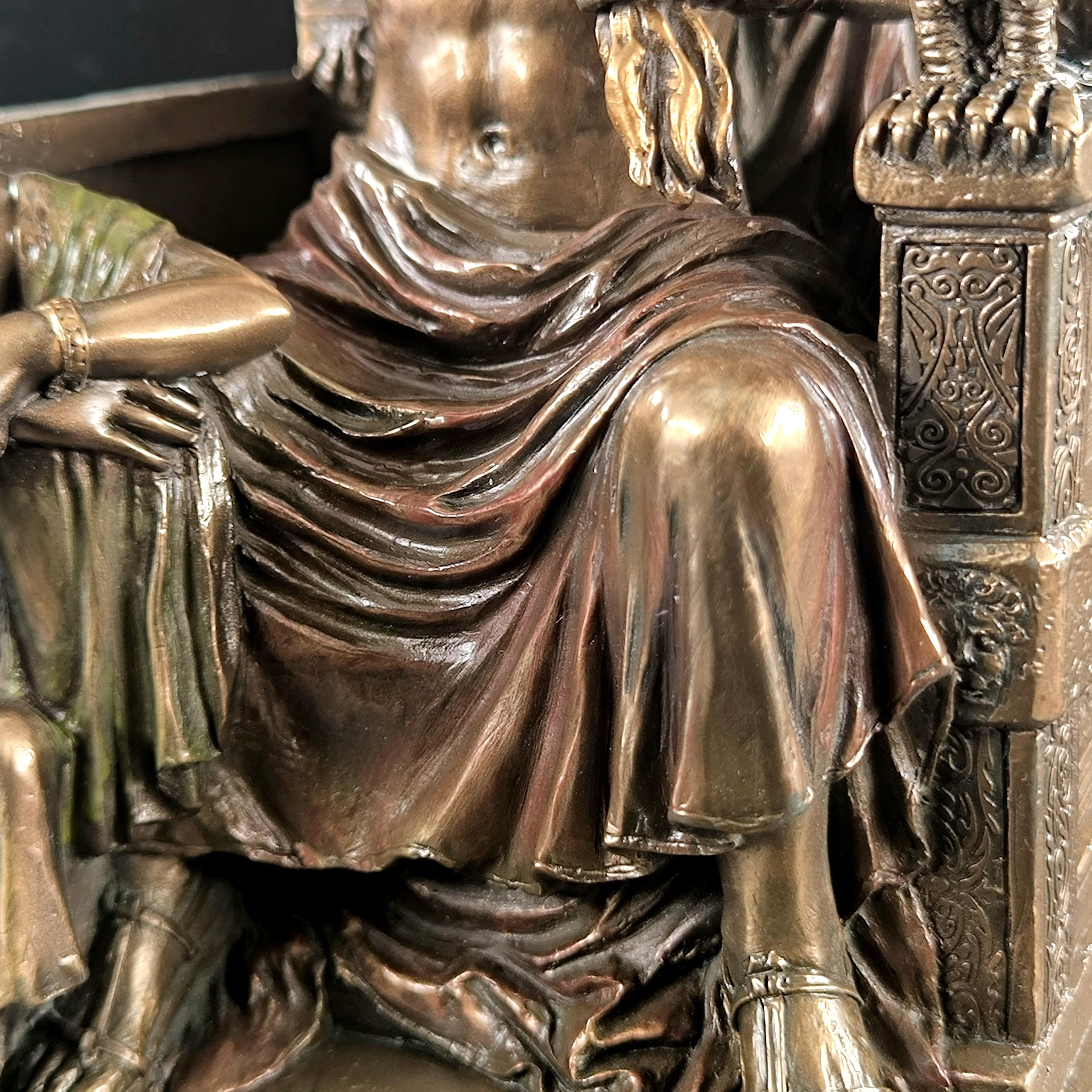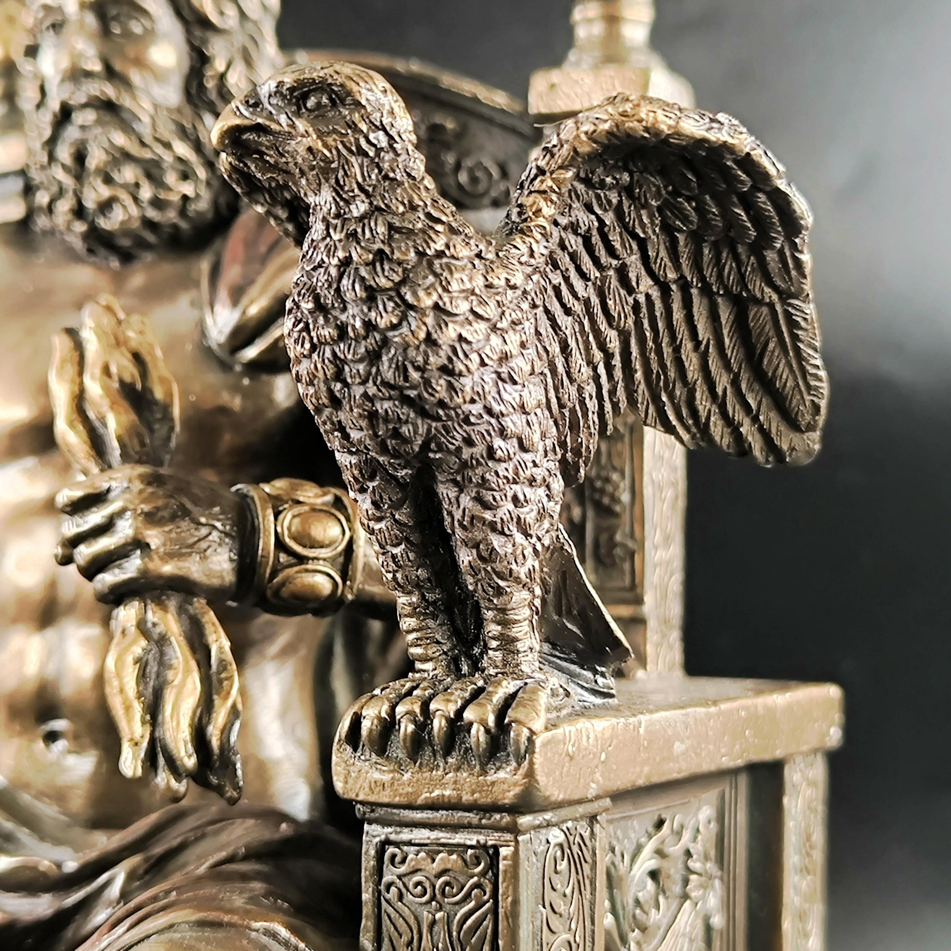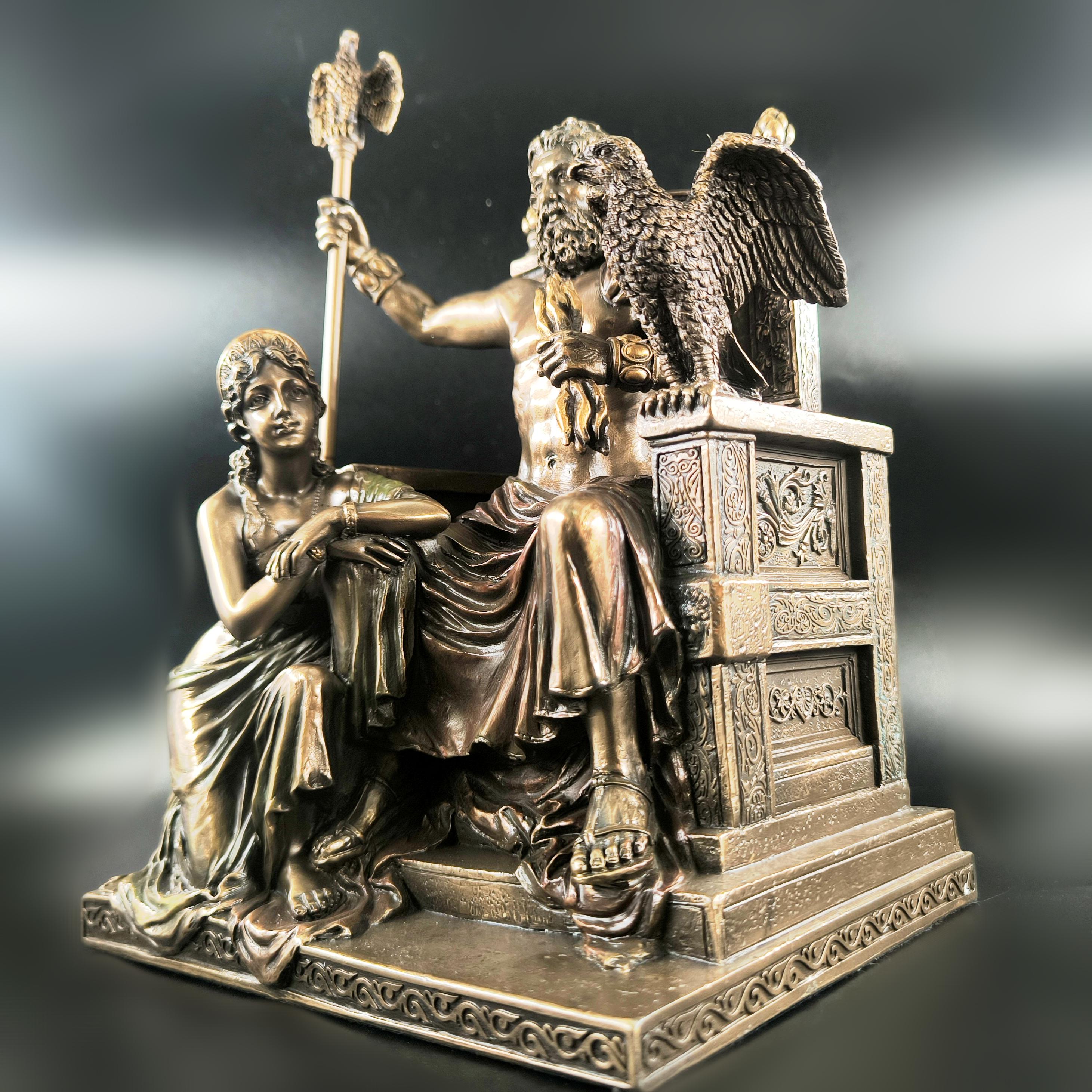 Mitolojinin en yüce kudreti Zeus, görkemli tahtında hüküm sürerken yanında otoritenin ve sadakatin sembolü Hera diz çökmüş halde betimlenmiştir. Zeus’un elindeki şimşek, göklerin hâkimiyetini temsil ederken, tahtının iki yanında yükselen kartallar ilahi gücün ve koruyucu kuvvetin simgesidir. Heykelin her kıvrımında, her detayında tanrısal bir görkem ve antik dünyanın ihtişamı hissedilir. Bu etkileyici sahne, tarihin en güçlü çiftini zamana meydan okuyan bir duruşla karşımıza çıkarırken, sanatçının mükemmel dokunuşlarıyla adeta nefes alır. Antik Yunan panteonunun en görkemli anı, koleksiyonlarda merkezde duracak kadar asil ve büyülü bir estetikle yeniden hayat bulmaktadır. Mermer ve kemik tozu karışımlı özel bir madde ile şekillendirilmiş olup usta sanatçılar tarafından itinayla el boyaması yapılmıştır. Çok detaylı ve gerçekçi ayrıntılara sahip olan bu eser, dünya çapında işçilik kalitesi ile bilinen Veronese markasının damgasını taşımaktadır.